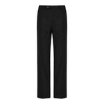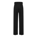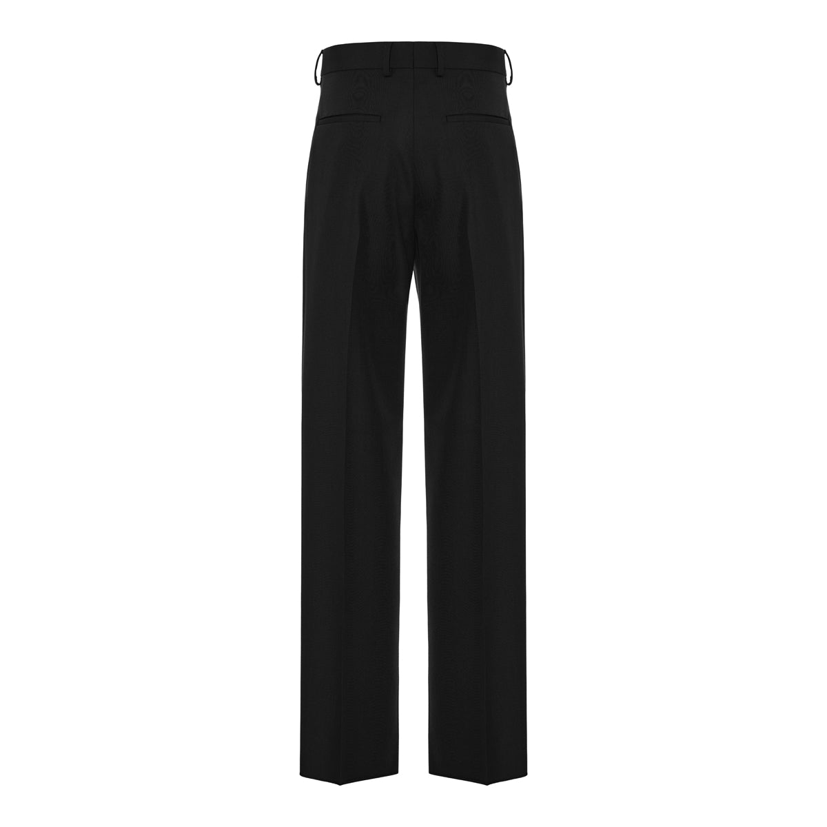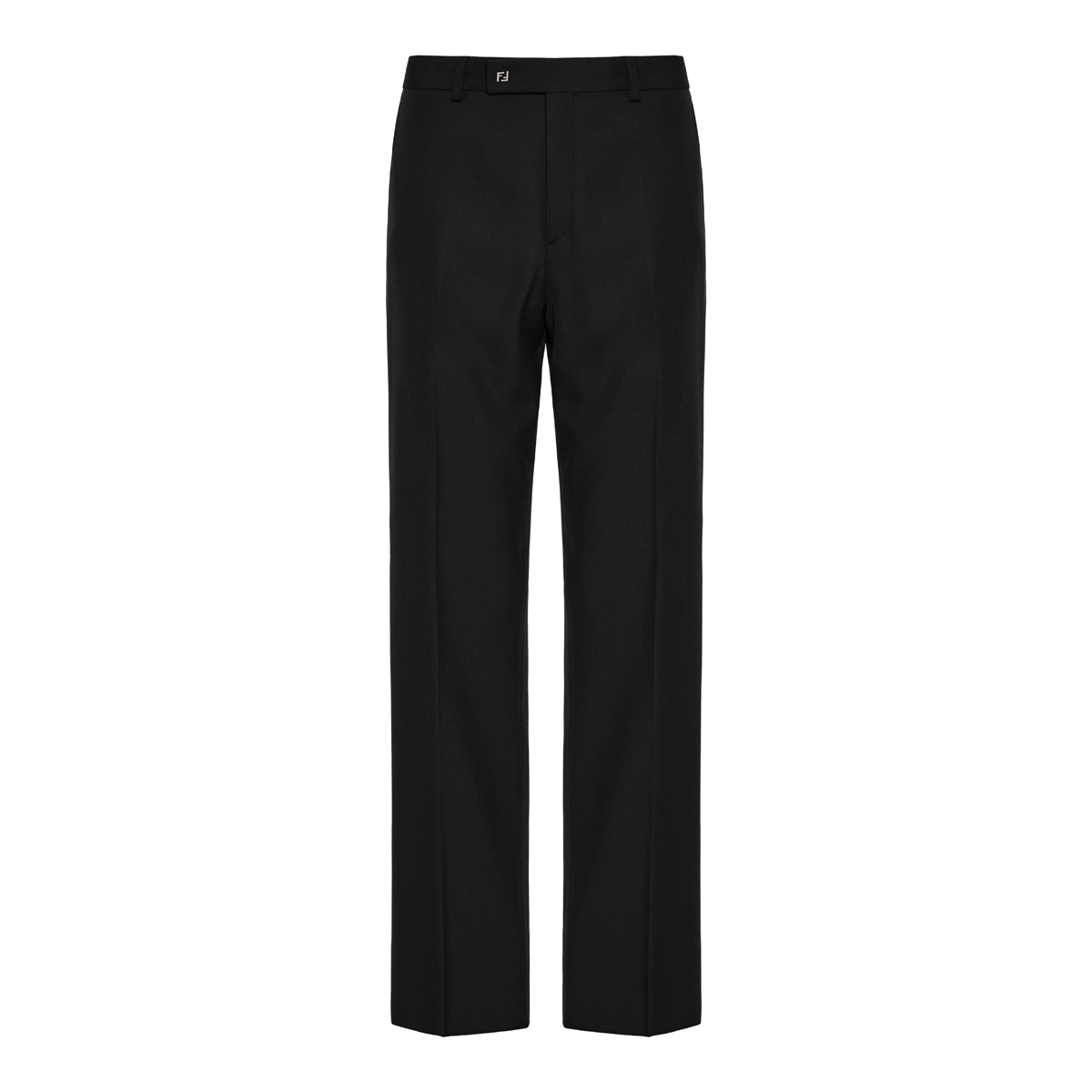 These black wool trousers from Fendi offer a tailored silhouette with a modern edge. Crafted from a stretch cotton blend, they feature a cigarette fit, side pockets, and belt loops. A concealed zip and hook fastening ensures a sleek profile, while the 17.5 cm hem width adds a contemporary touch. The trousers are subtly adorned with a button-effect palladium-finish metal micro FF logo at the waist, showcasing Fendi's signature branding.