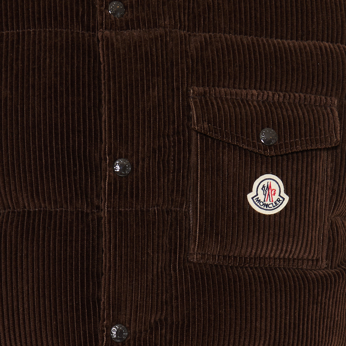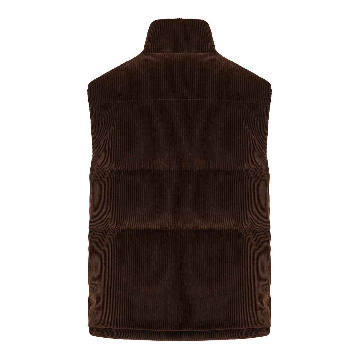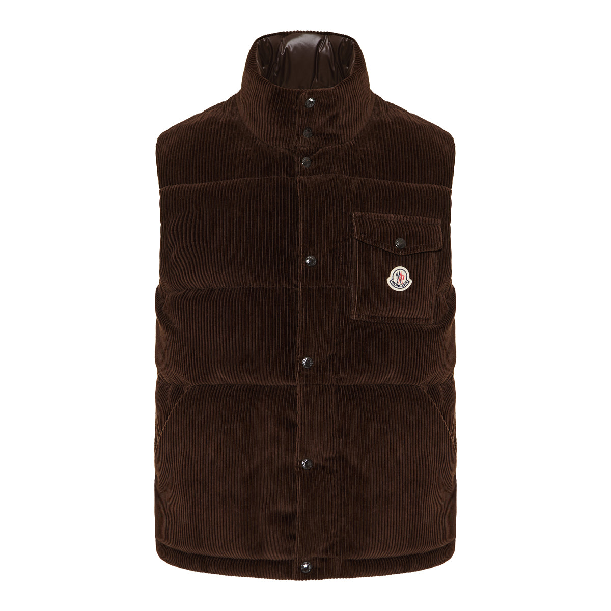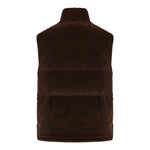 Moncler elevates casual outerwear with the Agen down gilet, cut from rich brown corduroy and filled with insulating down and feathers. Featuring a high collar, zip closure, and streamlined silhouette, it offers warmth and texture for refined layering.