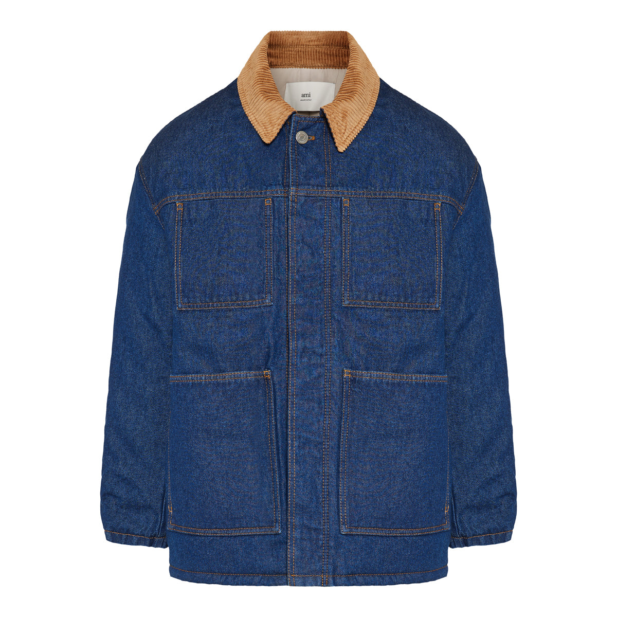 This Ami Paris jacket is crafted in indigo raw cotton with a padded interior for warmth and structure. It features a contrast corduroy shirt collar, metal denim buttons at front and cuffs, and patch + side pockets for utility. With tobacco topstitching and logo detailing, it blends workwear heritage with contemporary street sensibility.