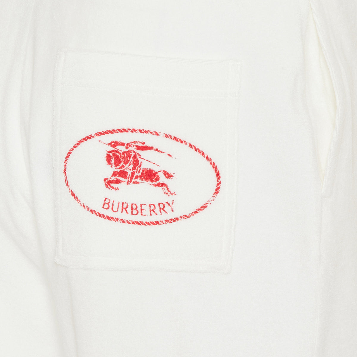 Shorts in a cotton blend towelling, cut to a relaxed fit with a striped waistband. The back pocket is printed with a distressed Knight stamp, an archival motif first seen on Burberry bags in the 1980s.