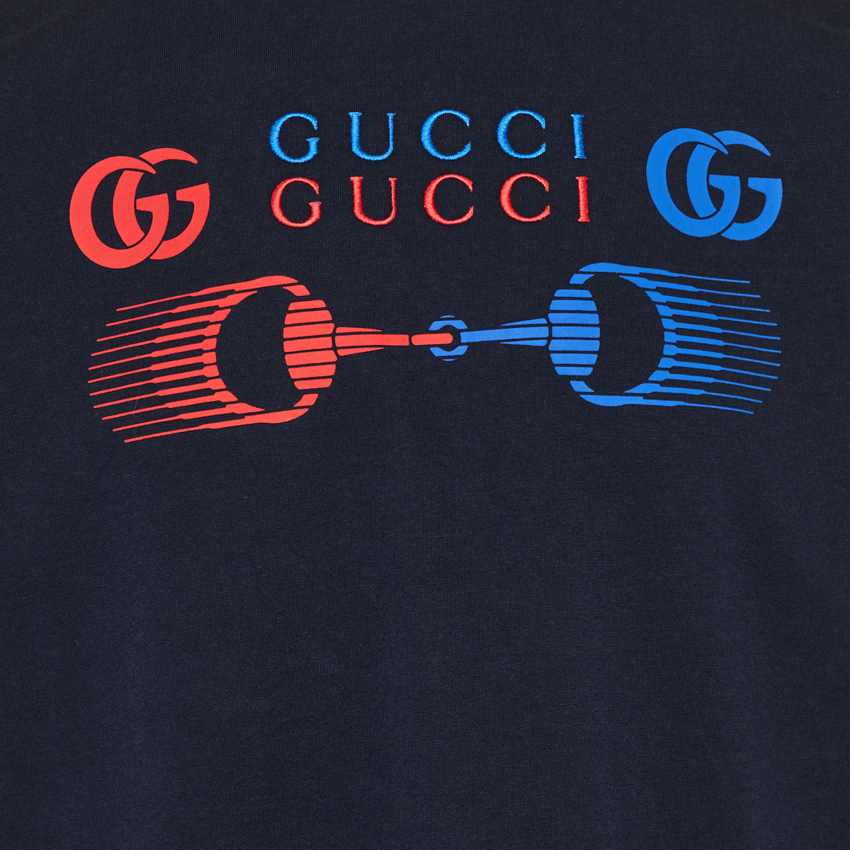 This Gucci T-shirt is crafted from soft navy cotton jersey and features a bold seasonal print across the chest. Ideal for casual looks, streetwear-inspired styling, or layering under tailoring, it fuses retro spirit with contemporary flair.