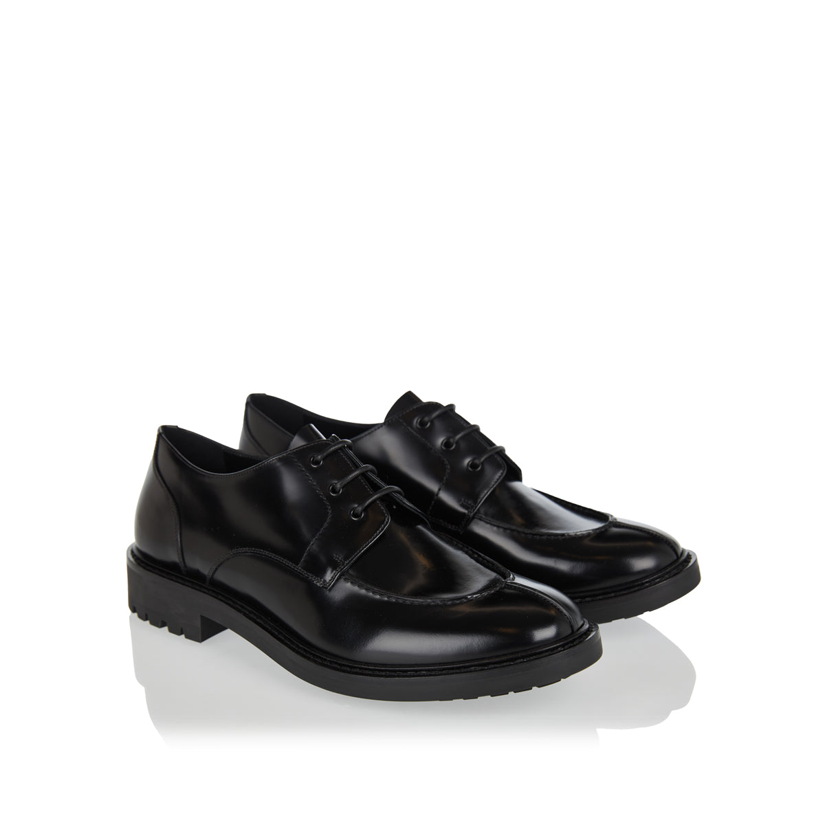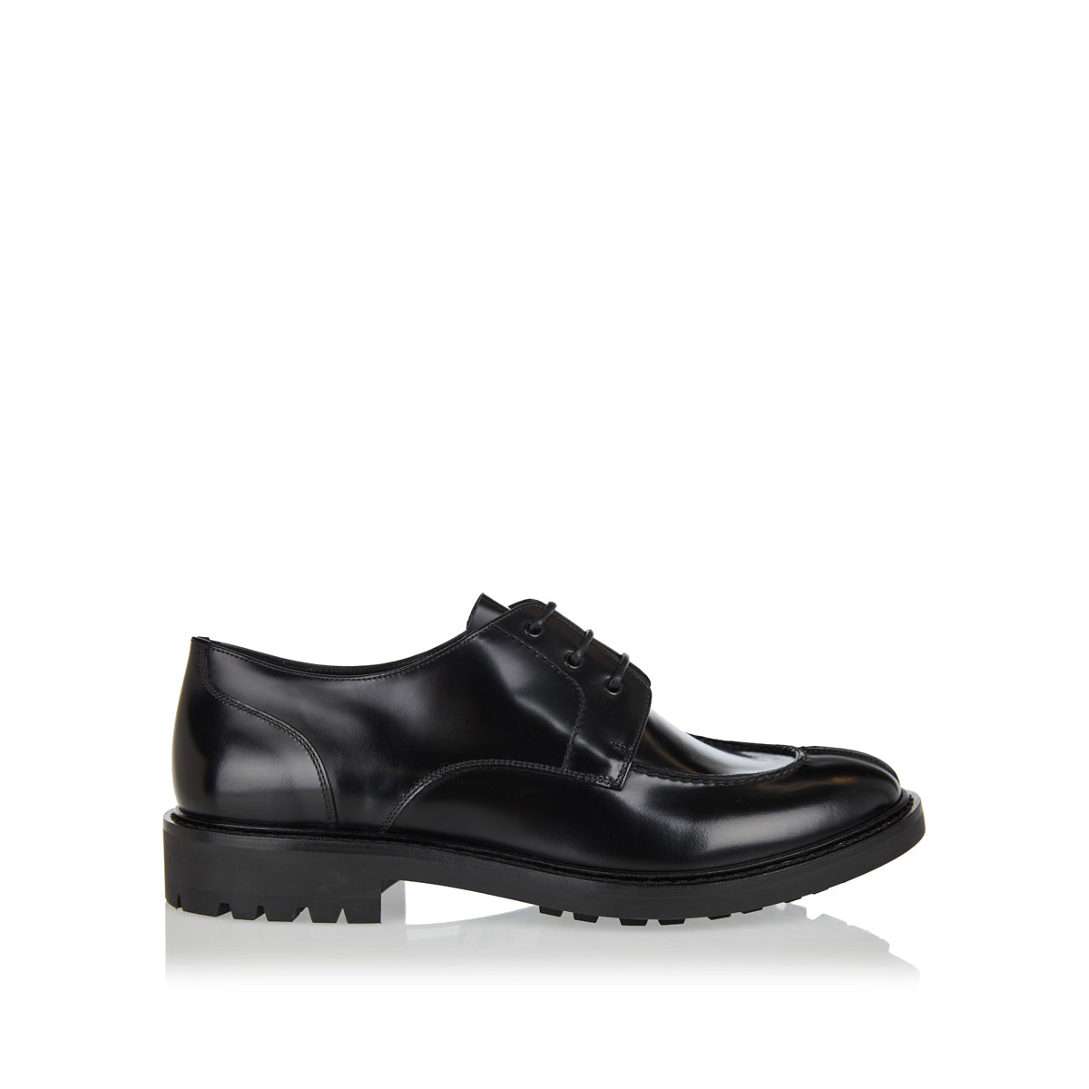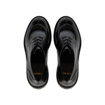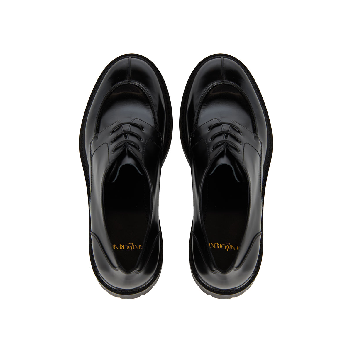 The Saint Laurent Lino leather derby shoes epitomize refined craftsmanship with their sleek almond-shaped apron toe and Goodyear-welted rubber sole. Designed for both formal and smart-casual occasions, these shoes offer versatility and timeless elegance.