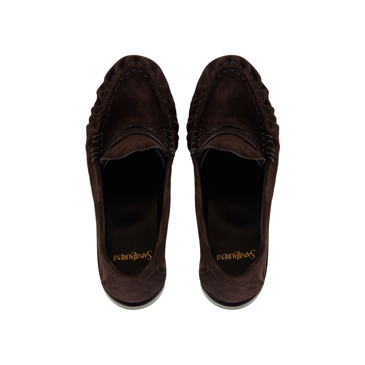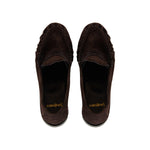 These Saint Laurent loafers are crafted from luxurious dark brown calf suede and feature the iconic Cassandre logo detail. Designed with a stacked heel and stitched accents, they offer a blend of classic elegance and contemporary style. Made in Italy, these loafers are a timeless addition to any wardrobe.