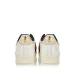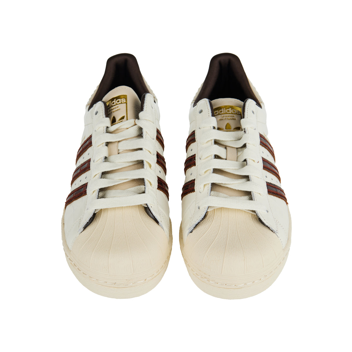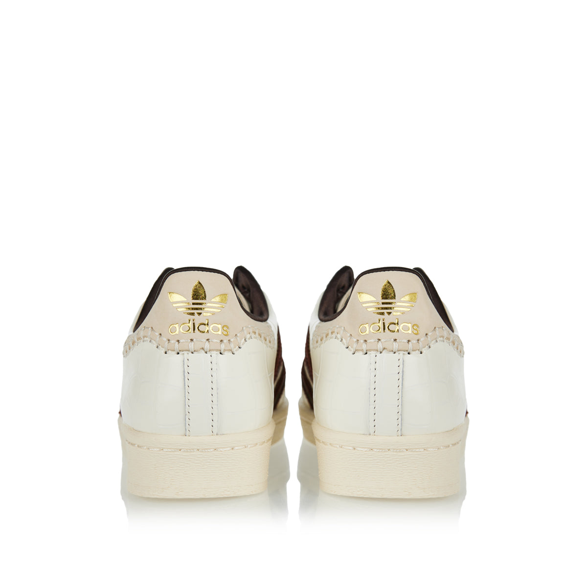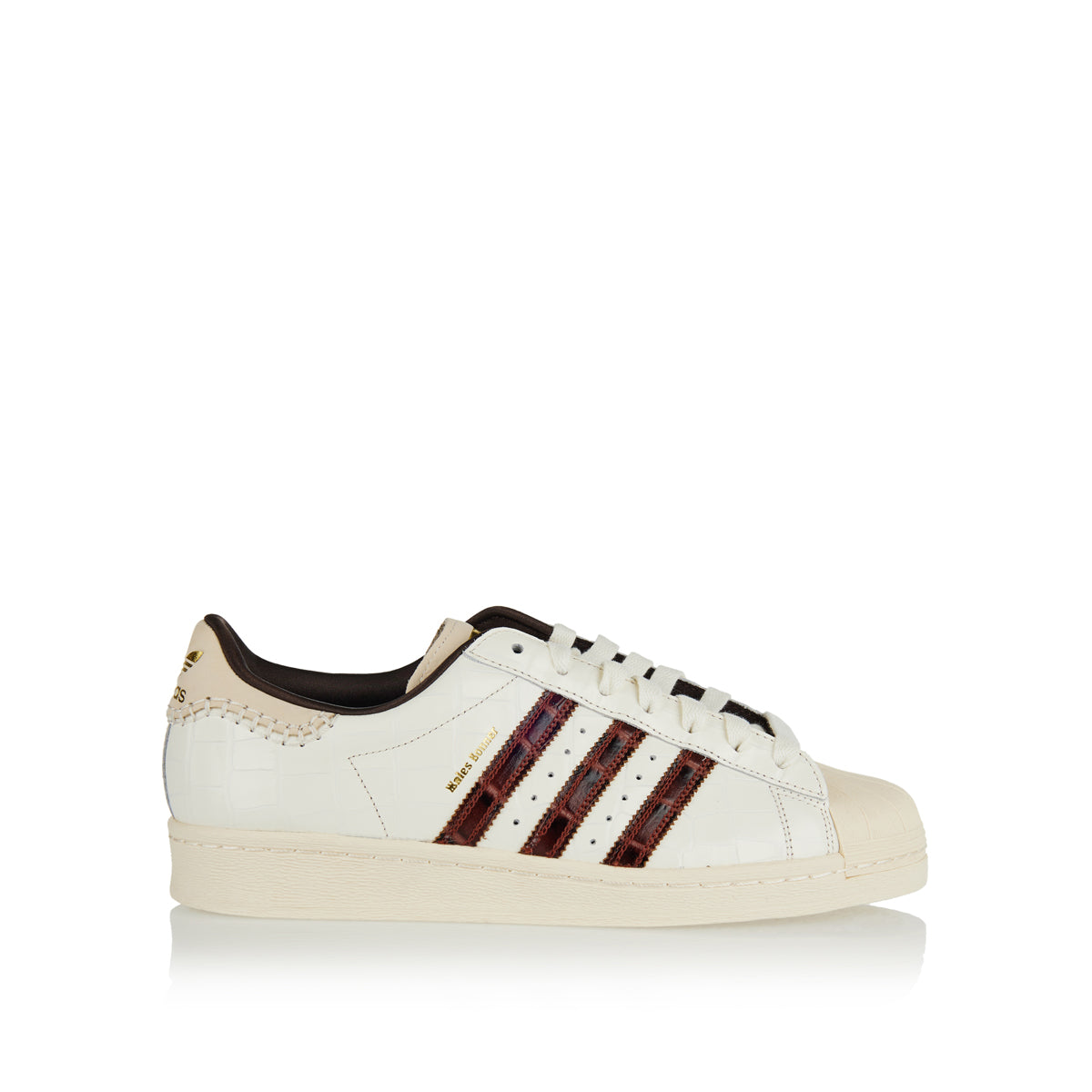 These sneakers from the Adidas × Wales Bonner collaboration are crafted from croc-embossed calf leather with contrast detailing and a rubber shell toe. They feature a lace-up front, fabric lining, and a rubber sole with slight platform and wedge accents. Ideal for upscale casual wear, they blend heritage sport aesthetics with refined luxury.