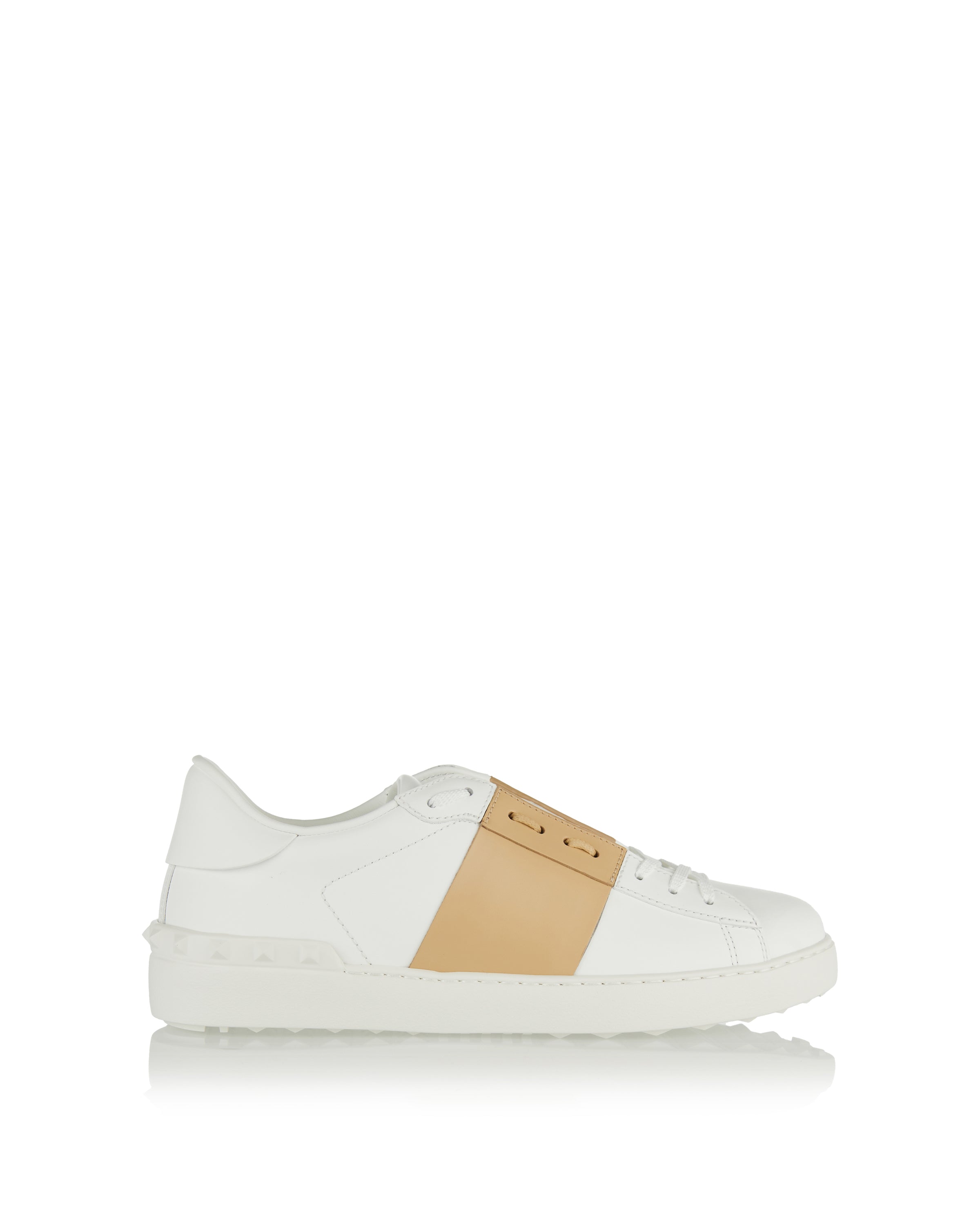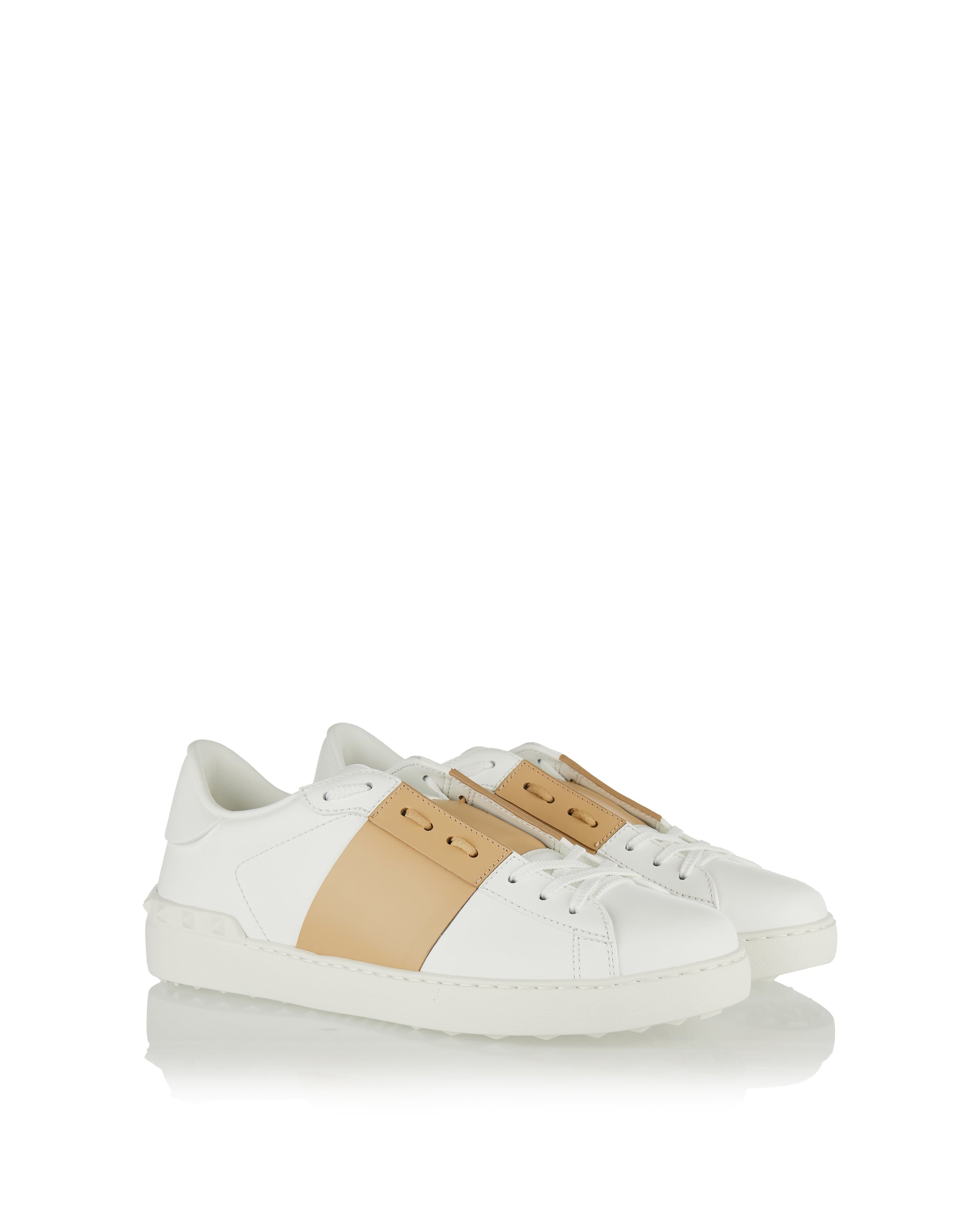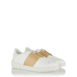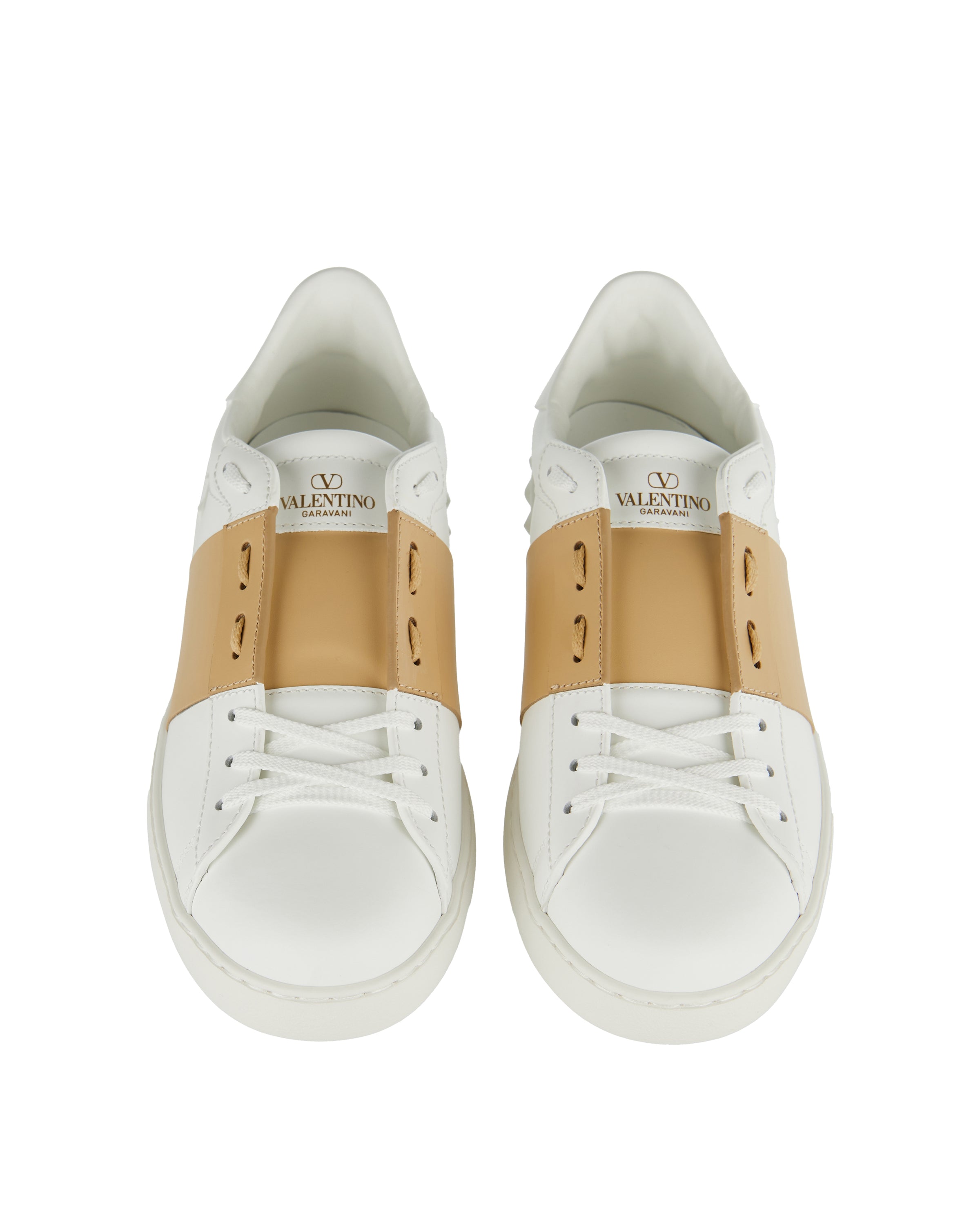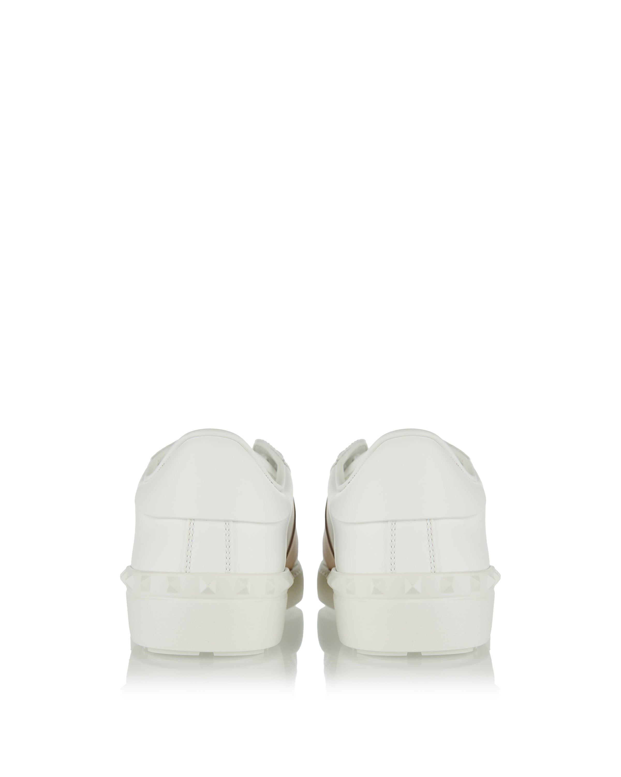 Refined Valentino Garavani leather open sneakers crafted in premium Italian leather with contrast detailing and a clean, contemporary silhouette. Set on a rubber sole with subtle stud accents at the heel, they are designed for elevated casual and city wardrobes, blending luxury craftsmanship with everyday versatility.