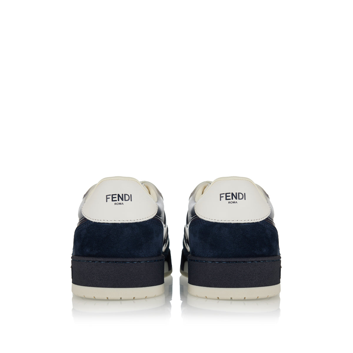 These Fendi Match sneakers are crafted in smooth white calf leather with contrasting blue suede detailing. The semi‑transparent FF appliqués on the sides add a signature touch, and the durable rubber sole features the Fendi logo for sculptural presence. Elegant yet sporty, perfect for elevated casual styling.