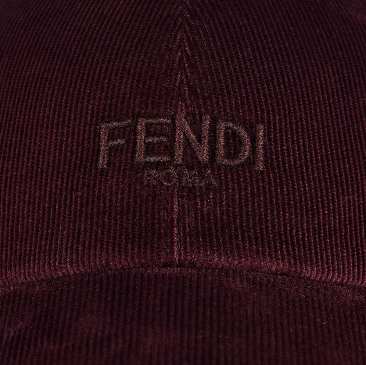 A refined and contemporary baseball cap from Fendi crafted in rich burgundy corduroy with a semi-stiff peak. It features a Velcro closure at the back for adjustable fit and a tonal embroidered Fendi logo at the front, offering a blend of understated luxury and heritage style. Ideal for elevated casual wear.