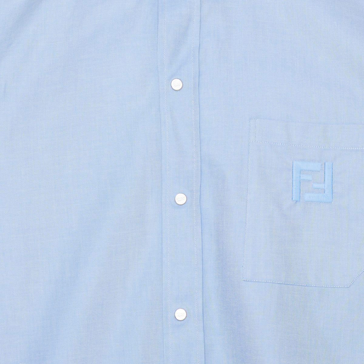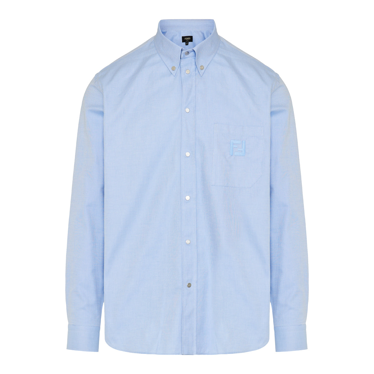 A refined Fendi shirt crafted in soft Oxford woven 100% cotton, finished in a subtle light-blue hue. It features a button‑down collar, long sleeves, and a chest patch pocket embroidered tone‑on‑tone with the iconic FF motif. Tailored with a comfortable fit, it’s perfect for elevated business wear, smart-casual layering, or polished daily style.