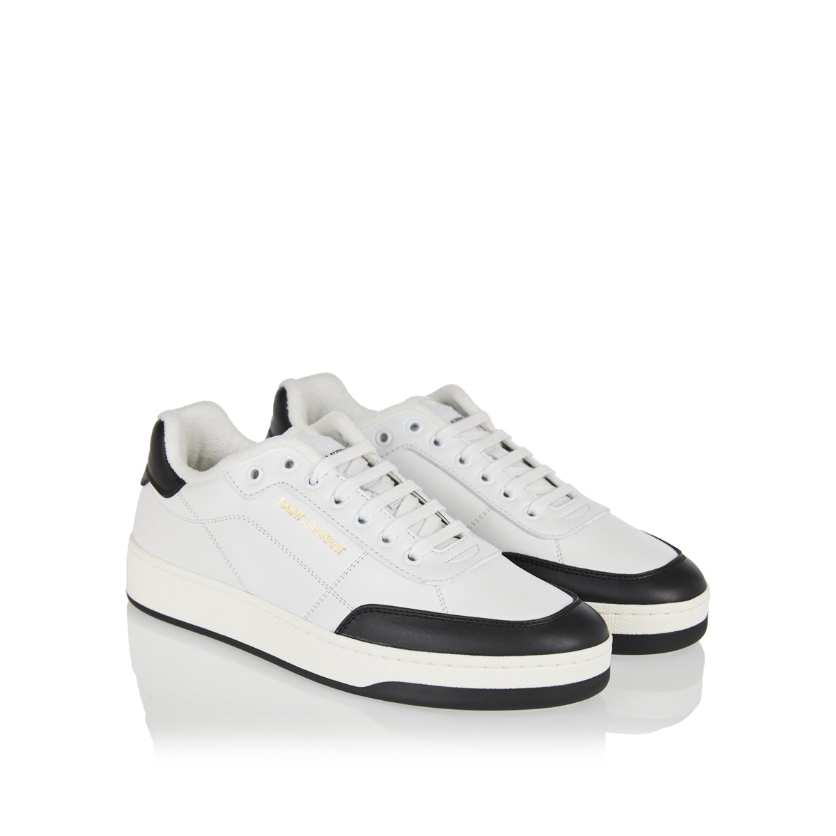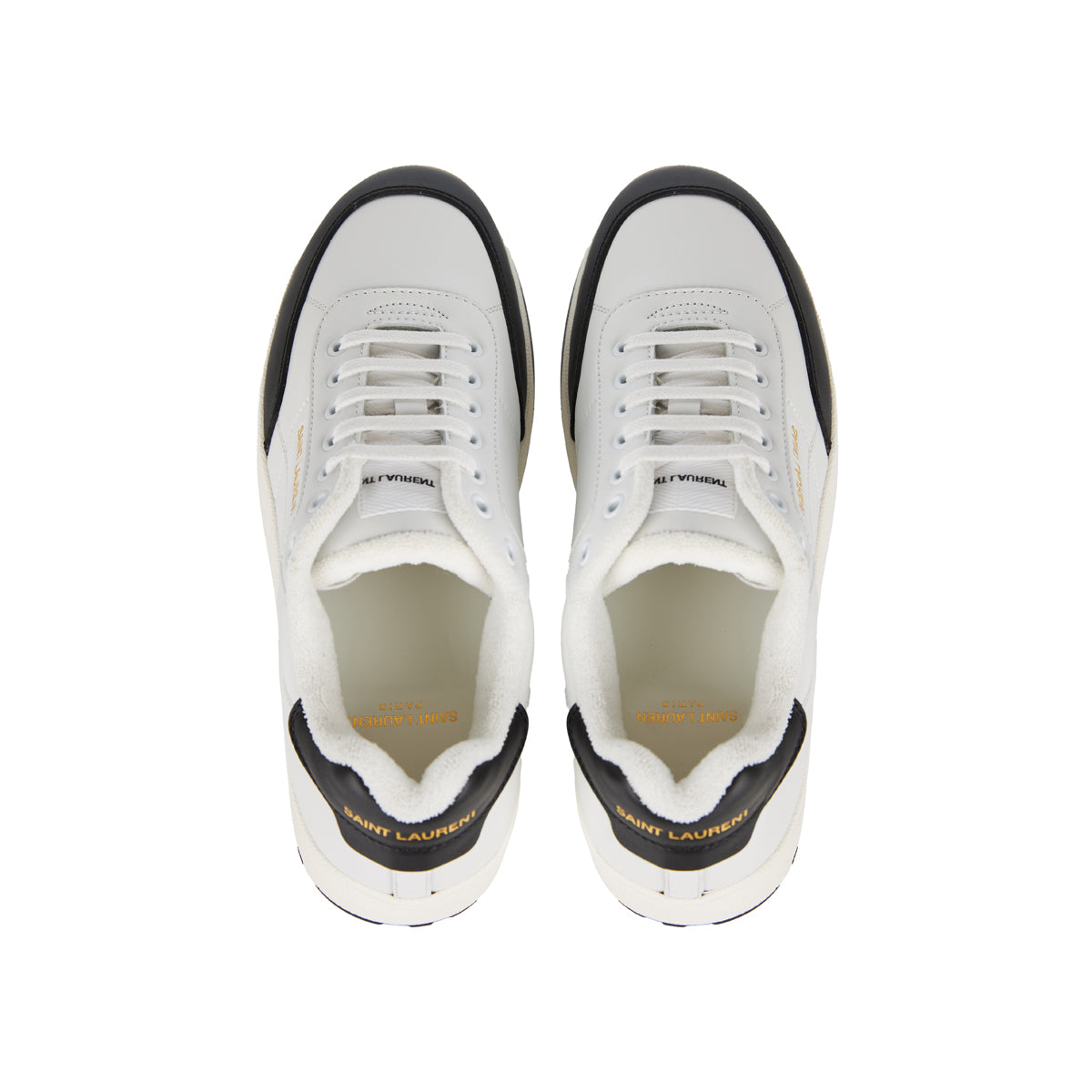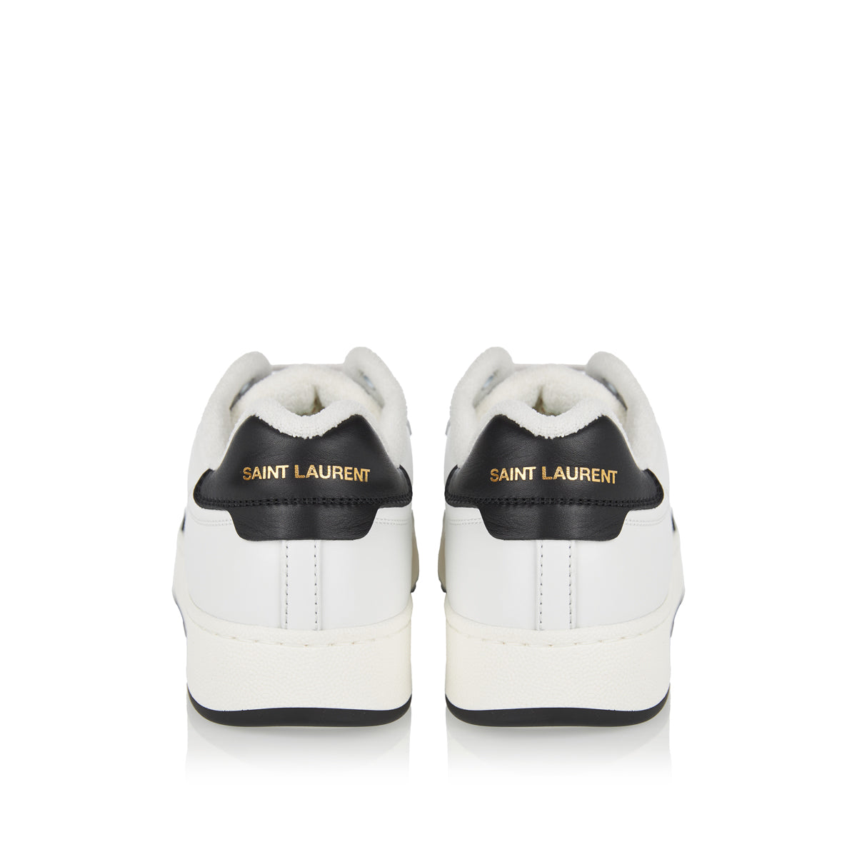 These white sneakers feature a two-tone design with black accents, a perforated toe box for breathability, and a flat rubber sole. The minimalist silhouette is complemented by subtle logo lettering, embodying Saint Laurent's understated luxury.