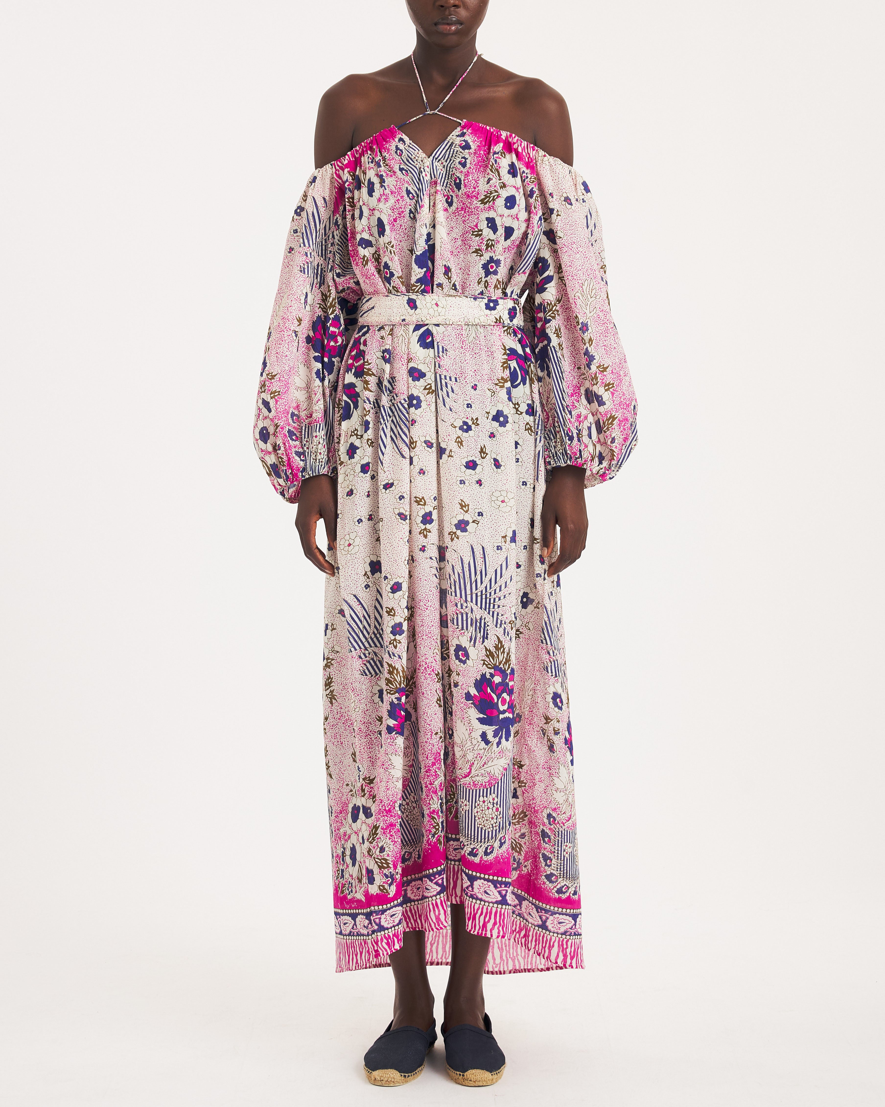 A flowing maxi dress that blends lightweight cotton voile with delicate floral embroidery.