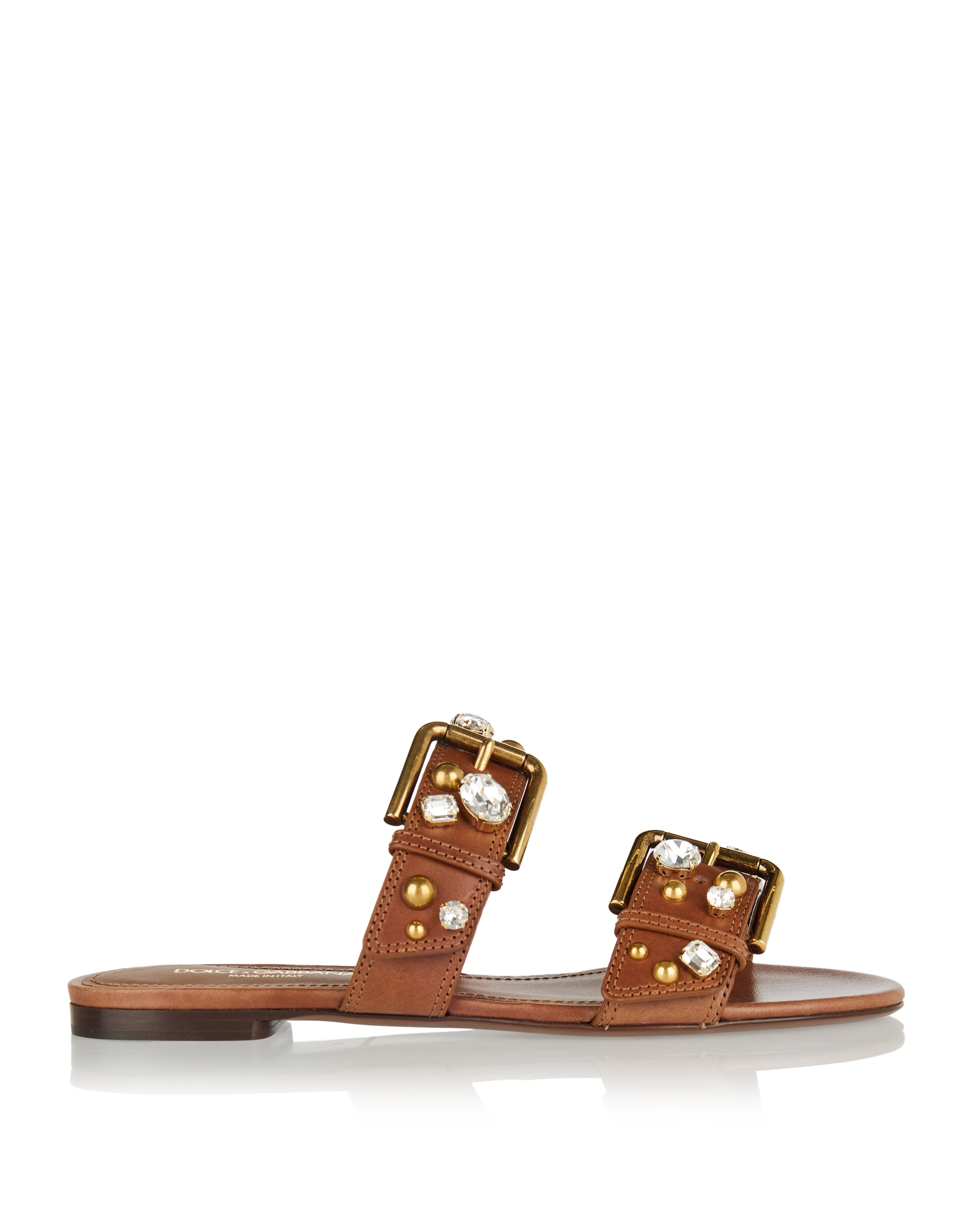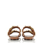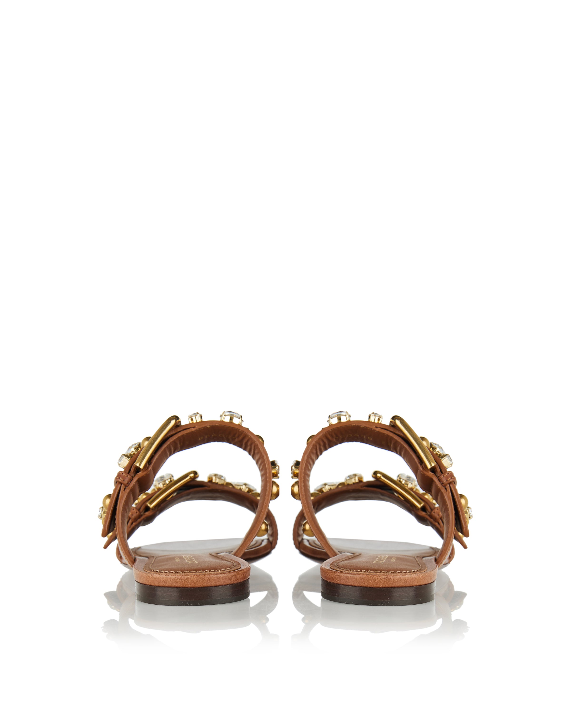Flat slippers crafted in printed cowhide, enriched with decorative embellishments that elevate their relaxed silhouette. A bold yet effortless design that merges texture and glamour for distinctive summer styling.- Printed cowhide upper