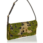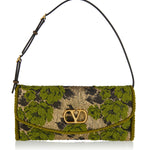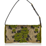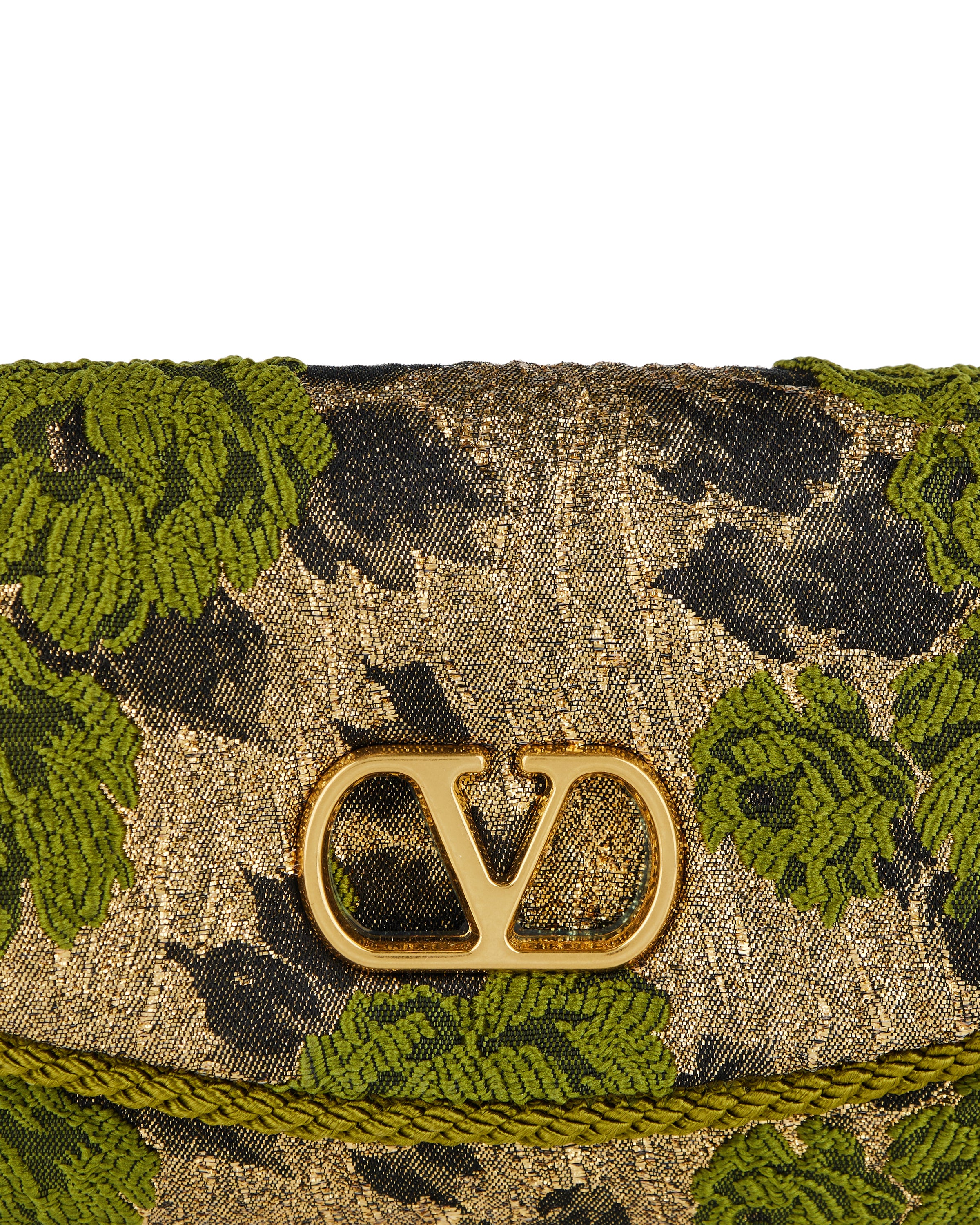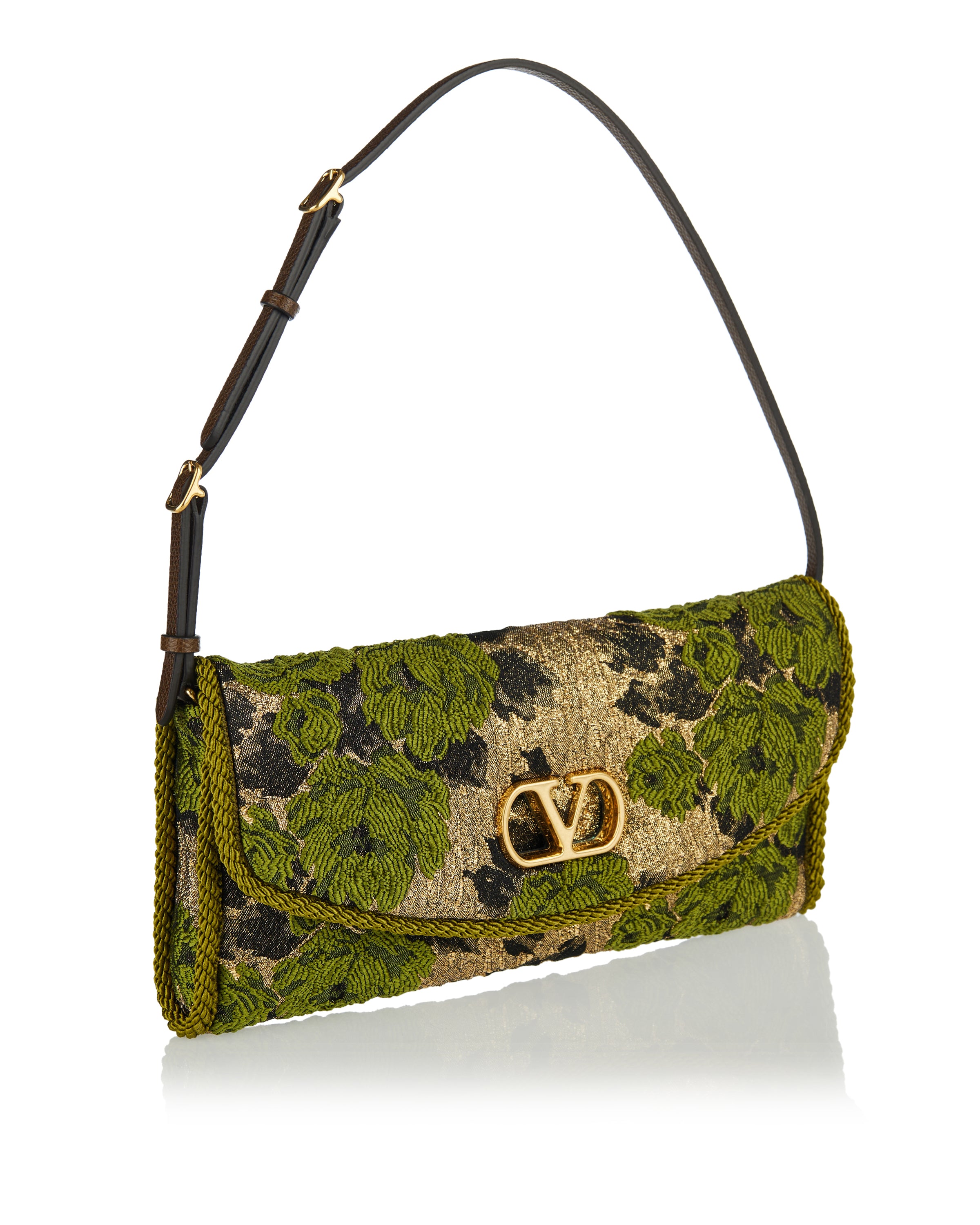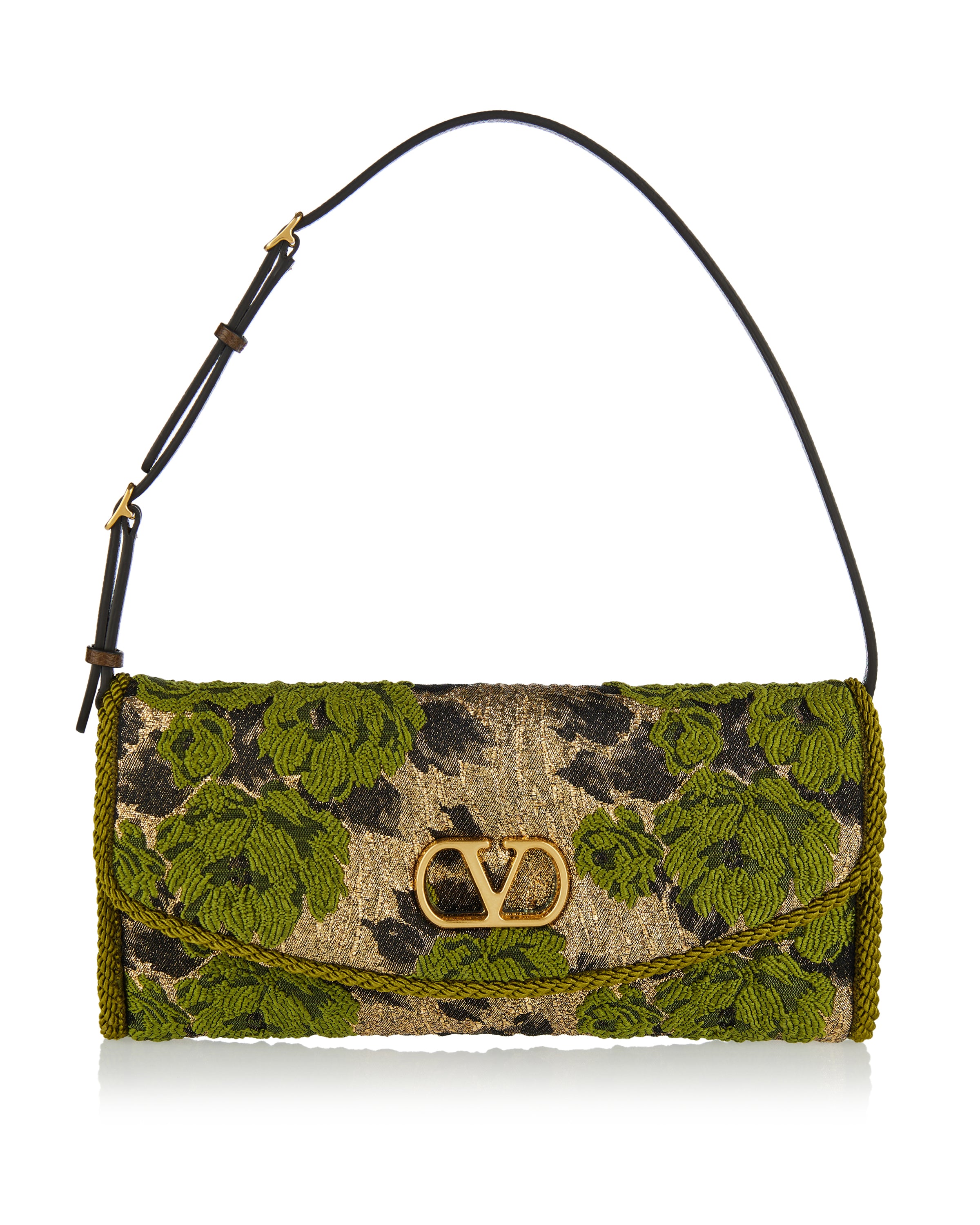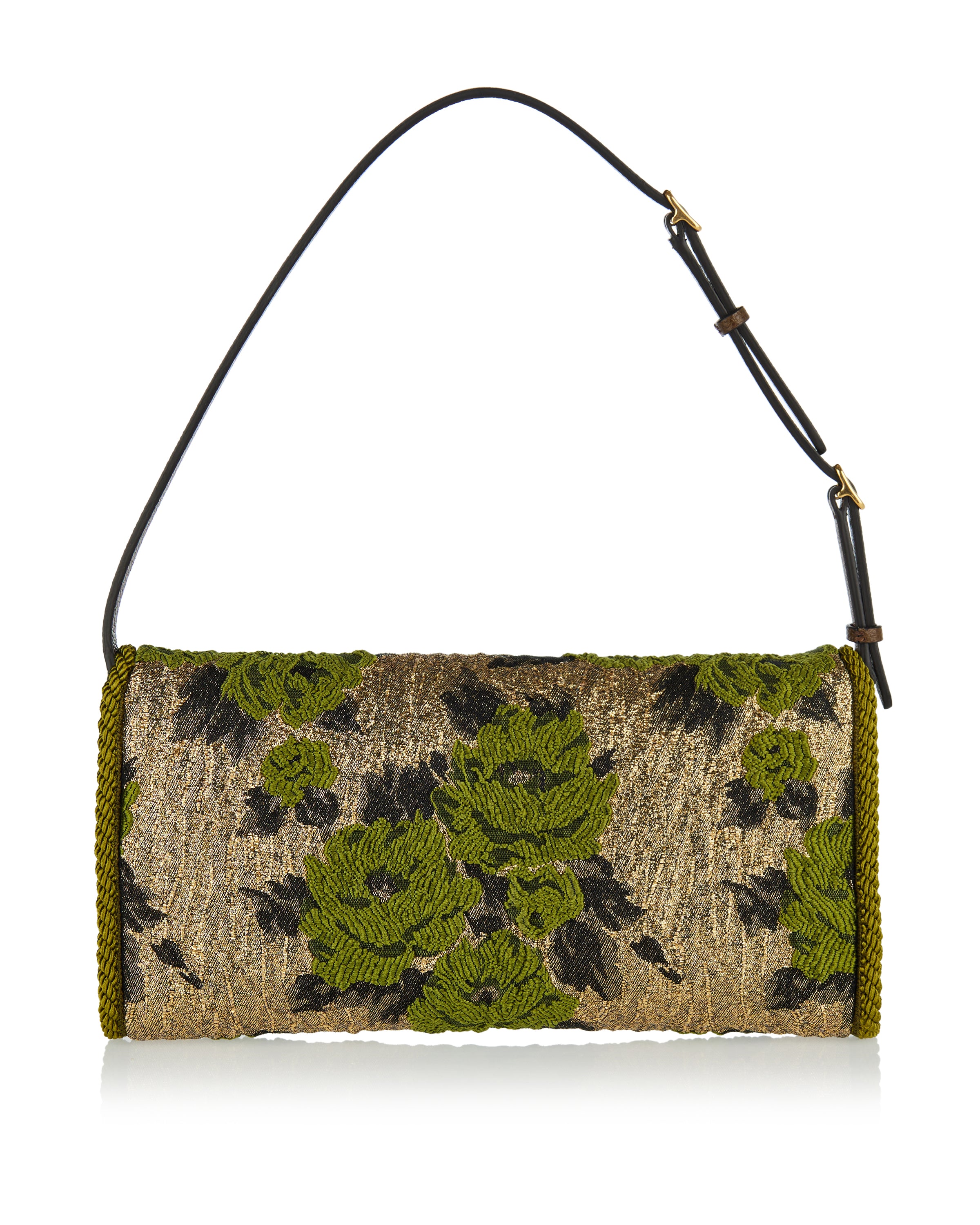 A structured shoulder bag crafted in metallic brocade, featuring leather trim and a streamlined silhouette for refined, modern elegance.