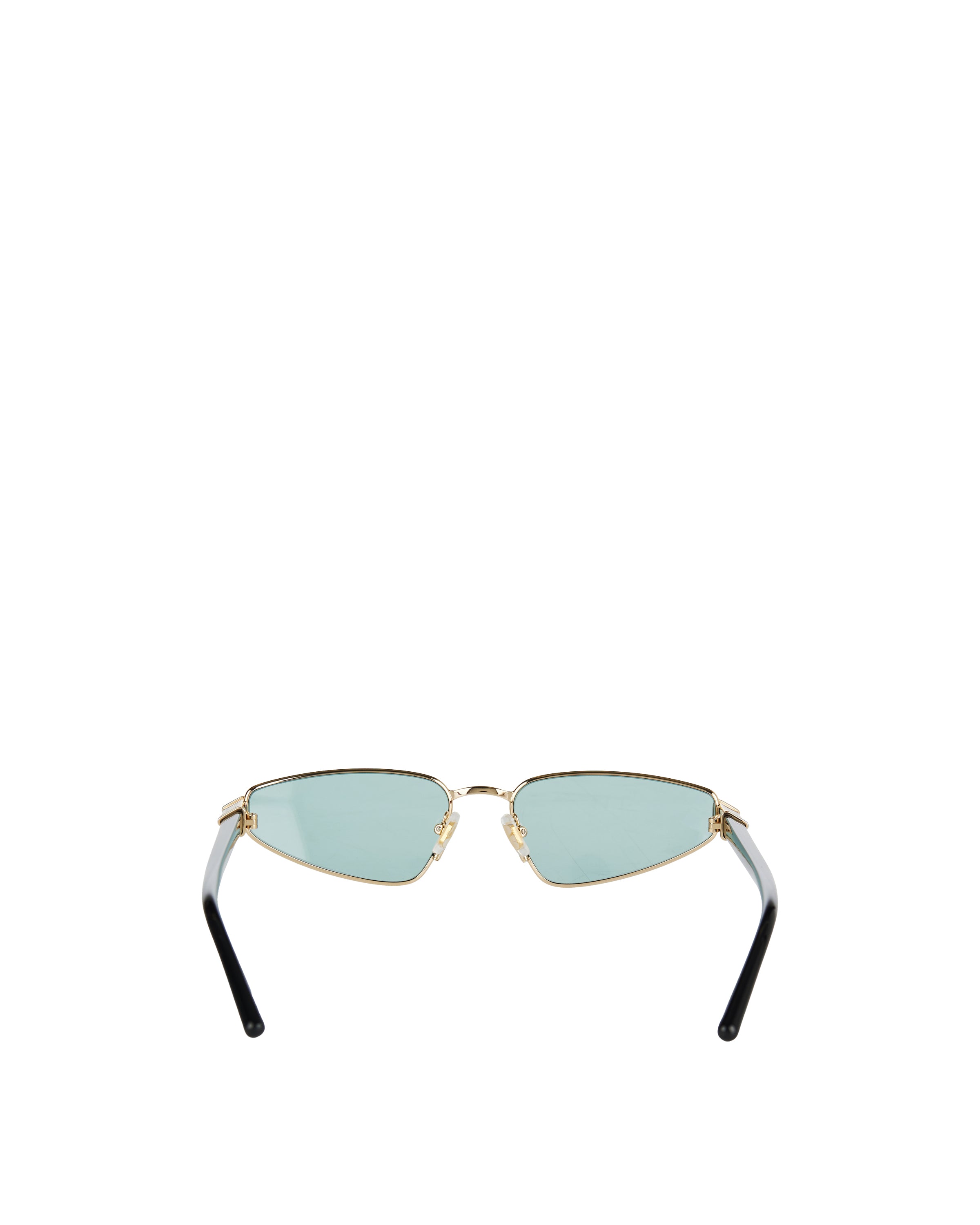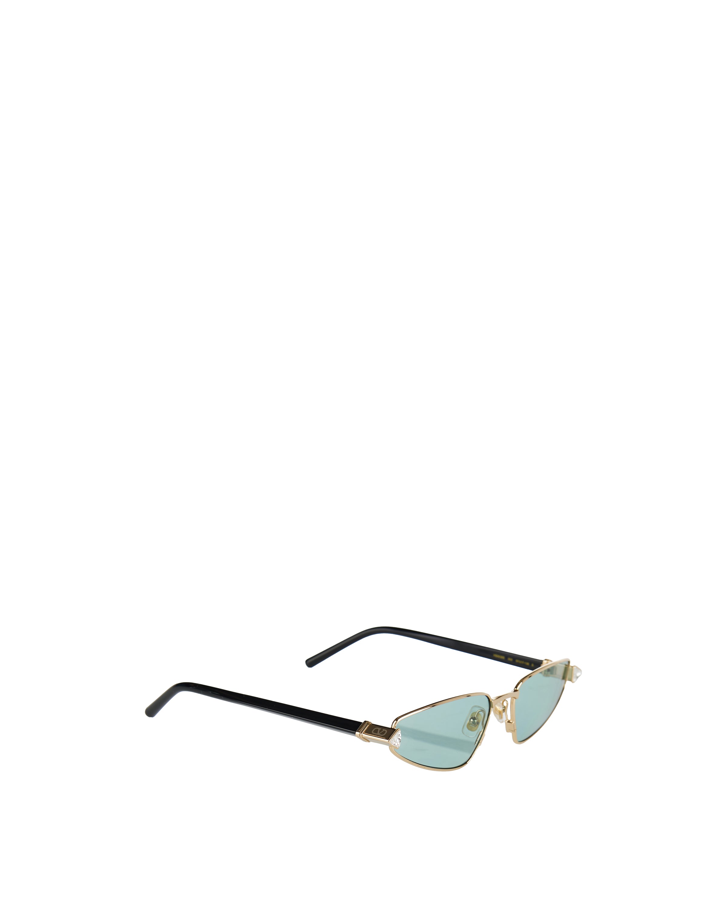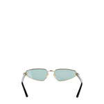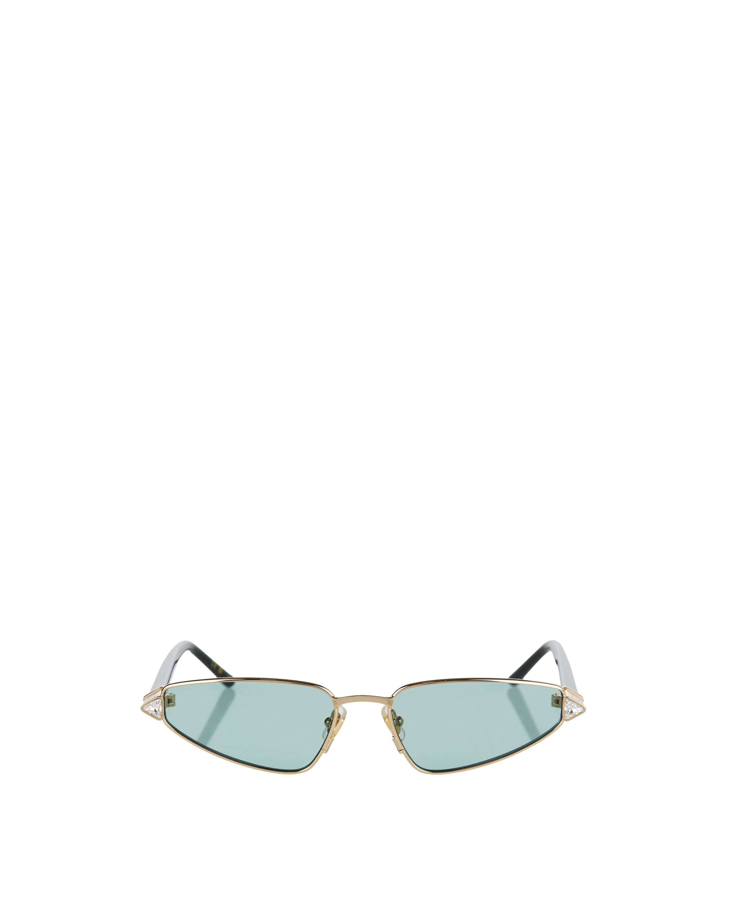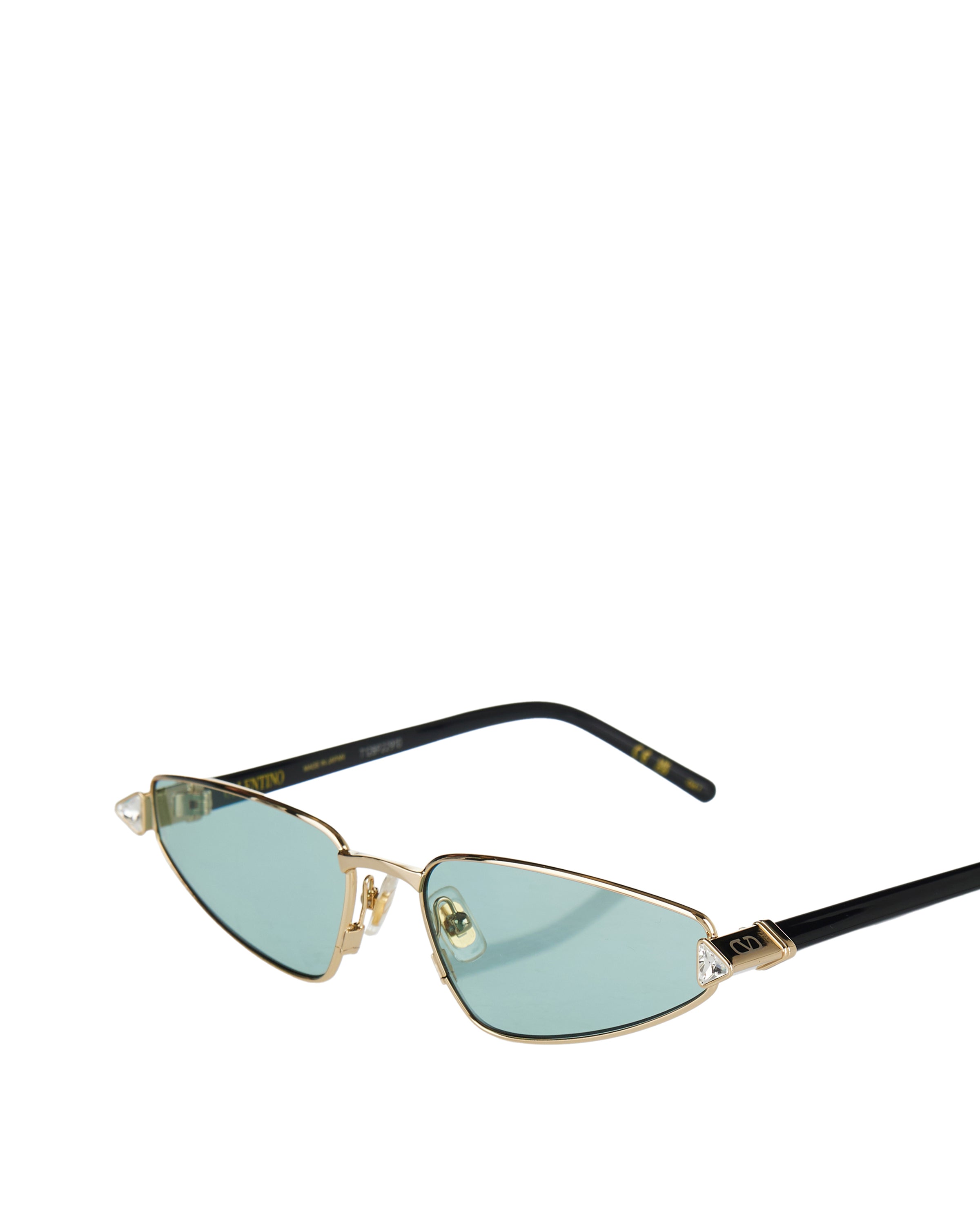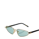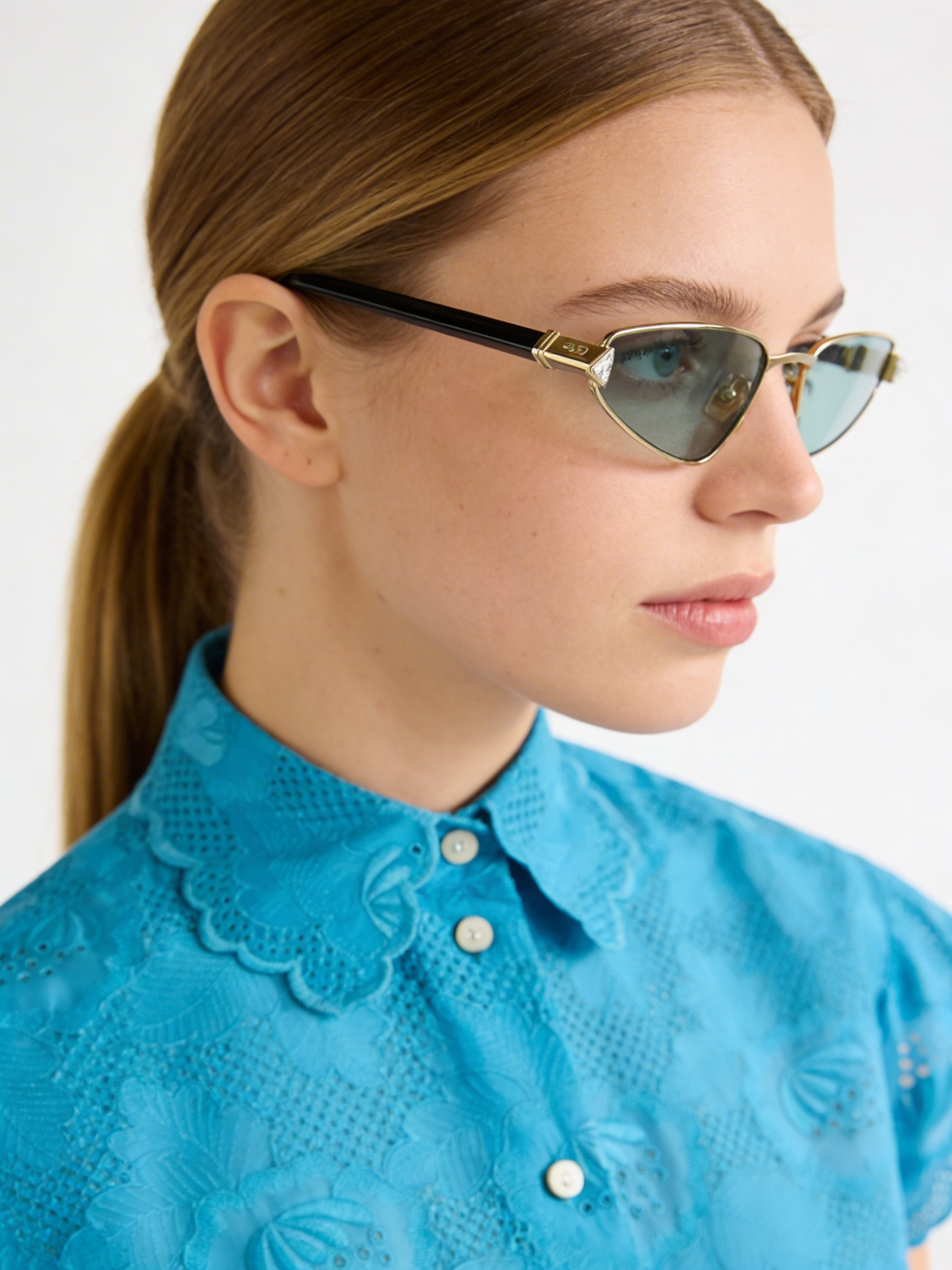 A sharp cat-eye silhouette crafted in metal, featuring sleek lines and subtle branding for a modern, architectural finish.