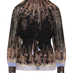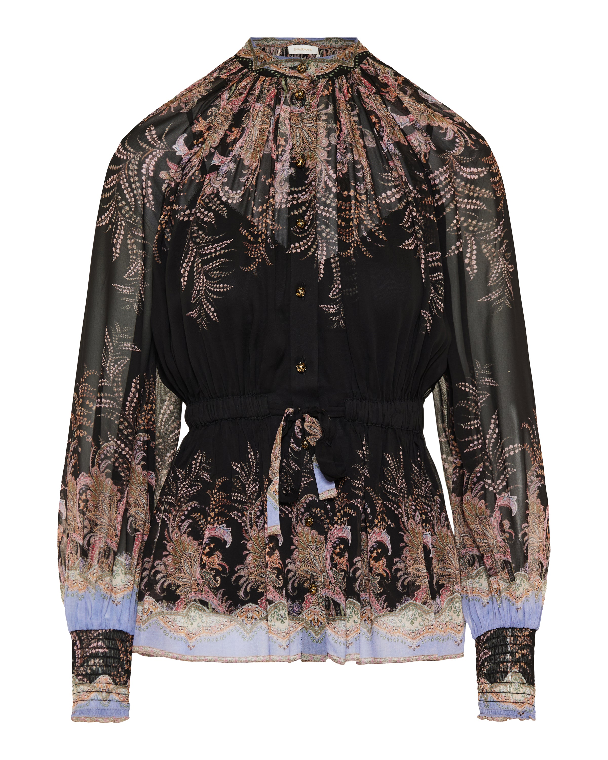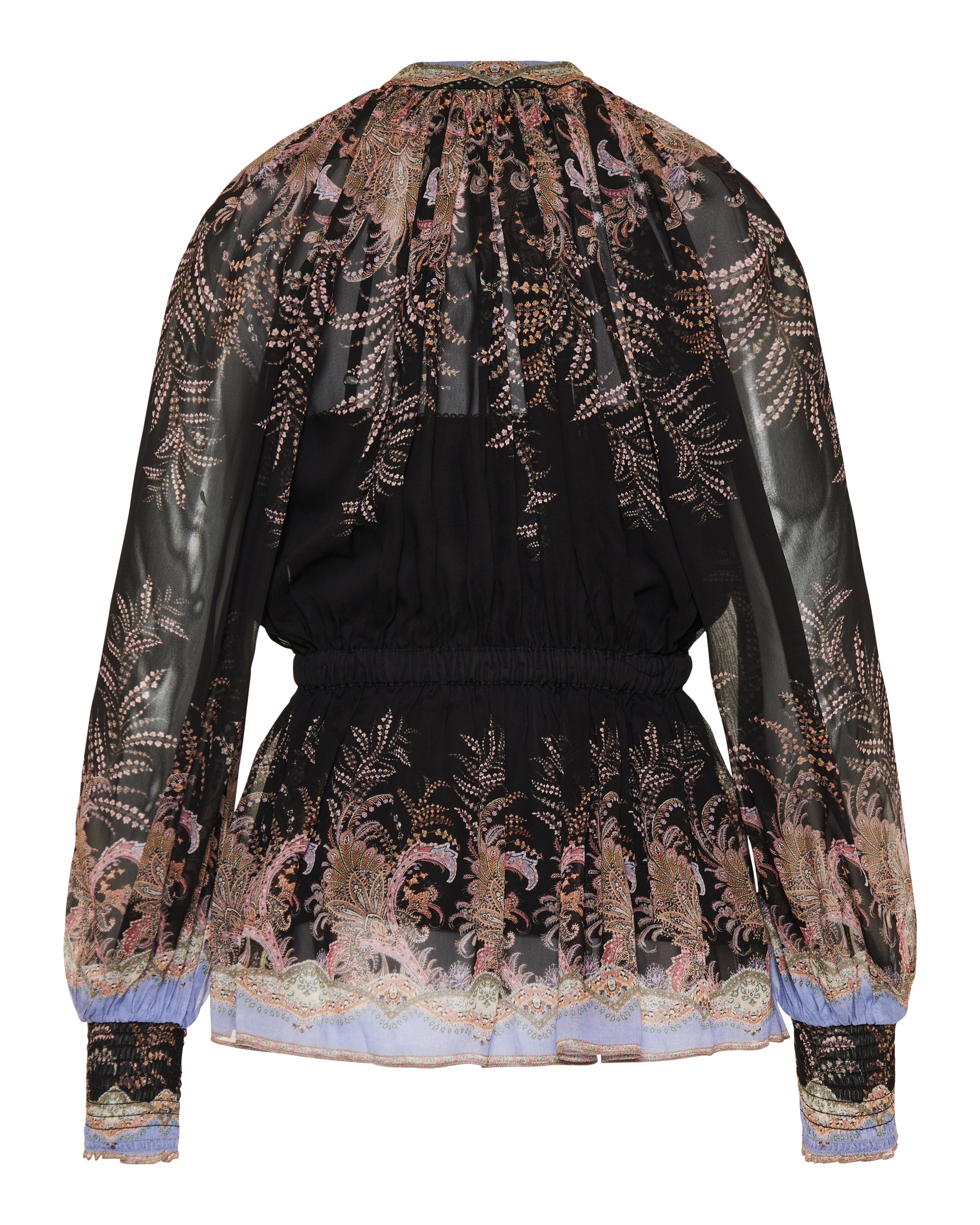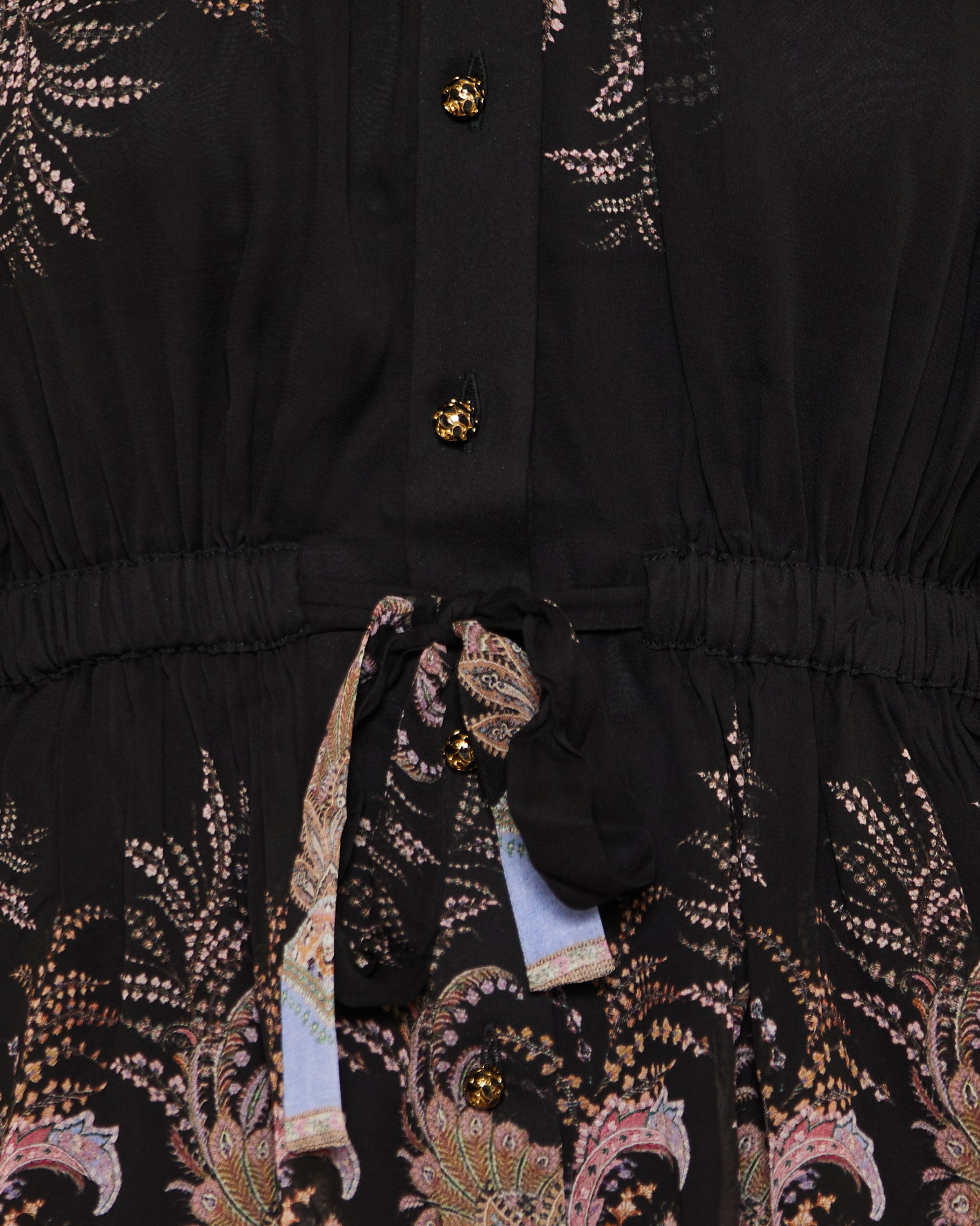A fluid silhouette in lightweight fabric, defined by an intricate floral print and soft, feminine movement.