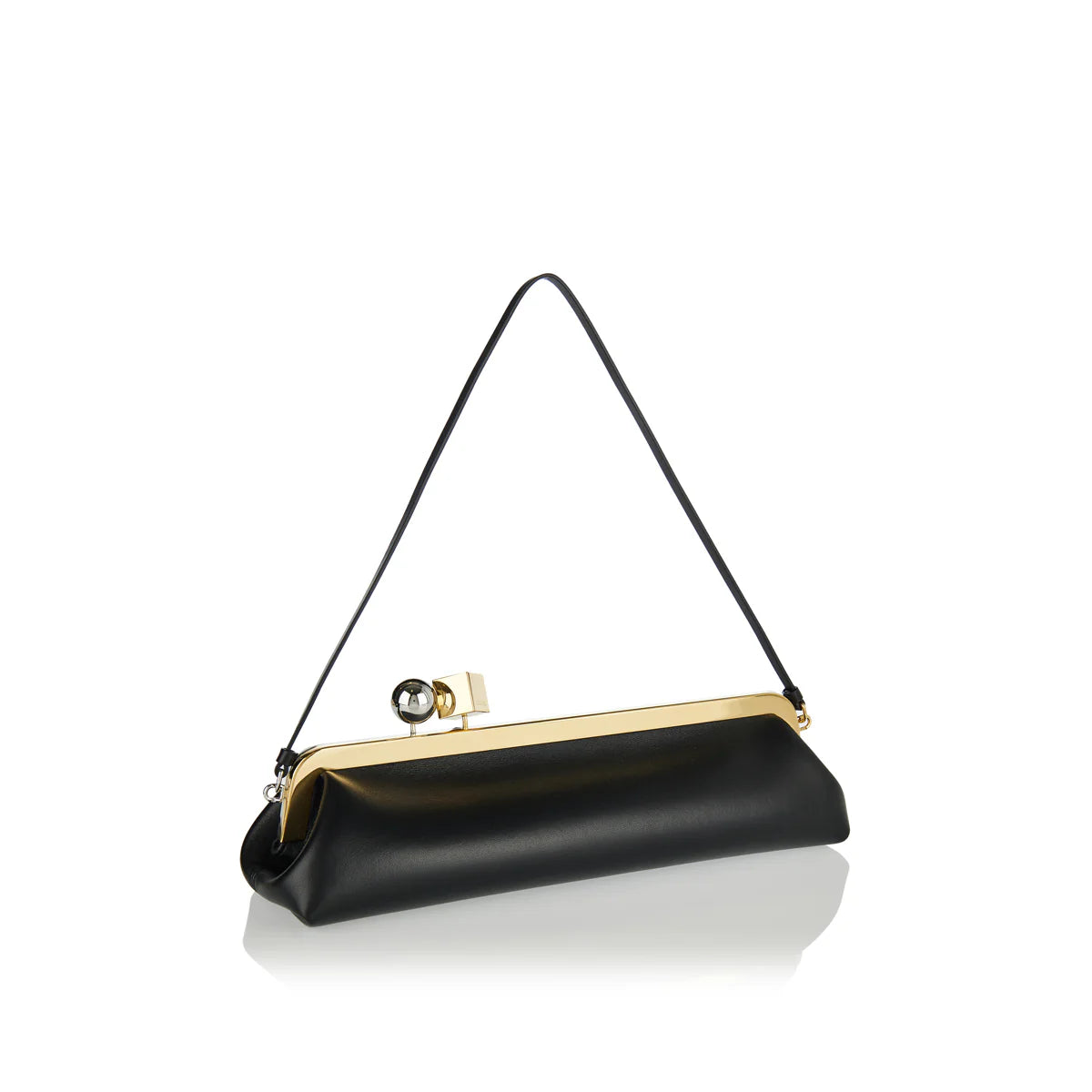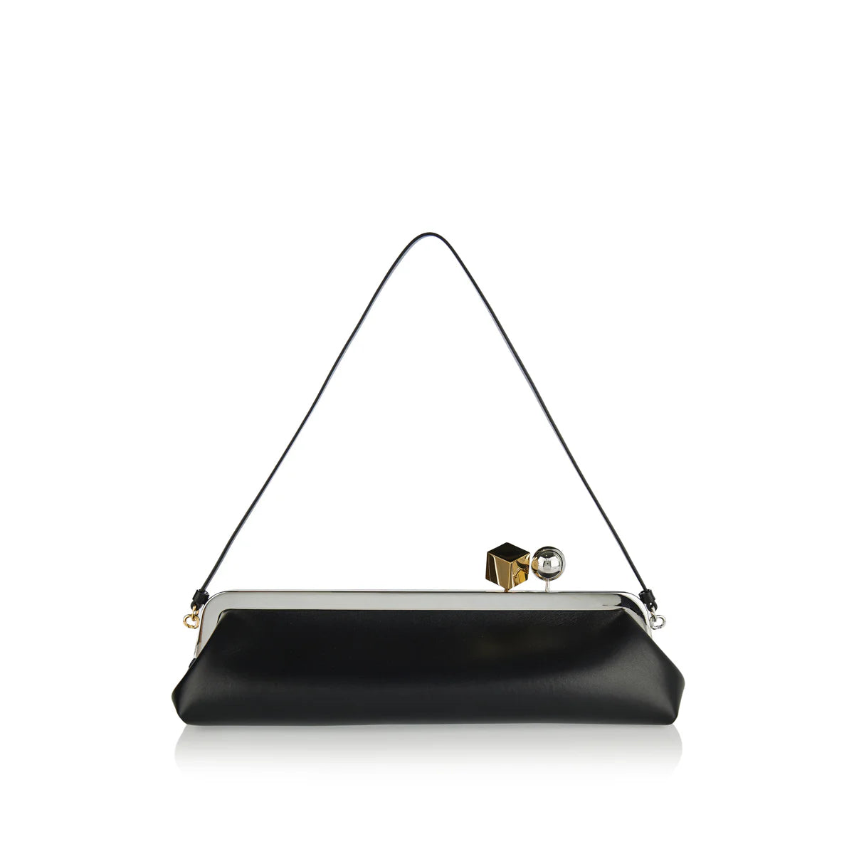 Designed with a sleek, elongated silhouette, this clutch is defined by clean lines and a sculptural, minimalist profile. The structured form creates a refined balance between modern elegance and understated functionality, allowing it to sit effortlessly in the hand. Polished and architectural in character, it is suitable for evening occasions, formal events, and elevated styling, offering contemporary sophistication with a confident, refined edge.