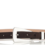 A refined Khaite Lucca suede belt crafted in Italy from rich brown calf-suede with a slender 2 cm width and a polished silver-tone adjustable buckle. Its minimalist silhouette and subtle texture make it an elegant choice to cinch waists or accent tailored trousers, dresses or denim — a versatile accessory for refined everyday or elevated casual outfits.