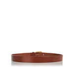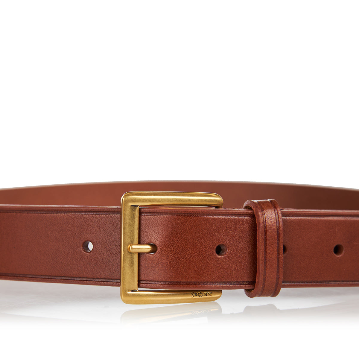 The Saint Laurent leather logo-buckle belt is a refined accessory that seamlessly complements both formal and casual attire. Crafted from 100% calfskin leather, it features a polished brass buckle engraved with the brand's logo, adding a touch of sophistication to any ensemble.