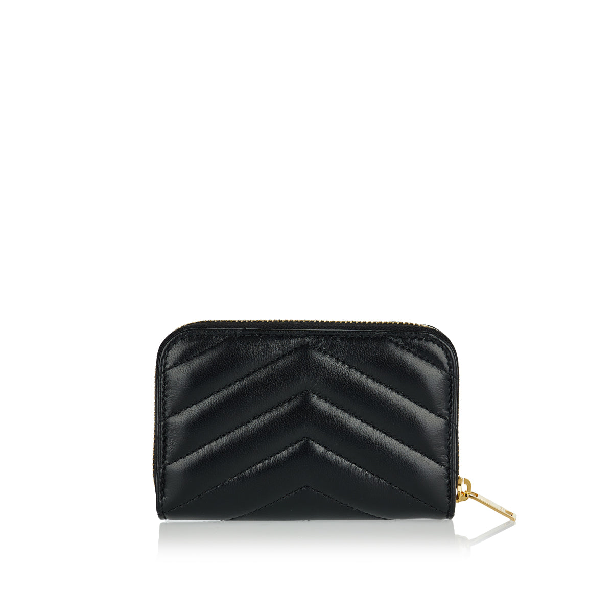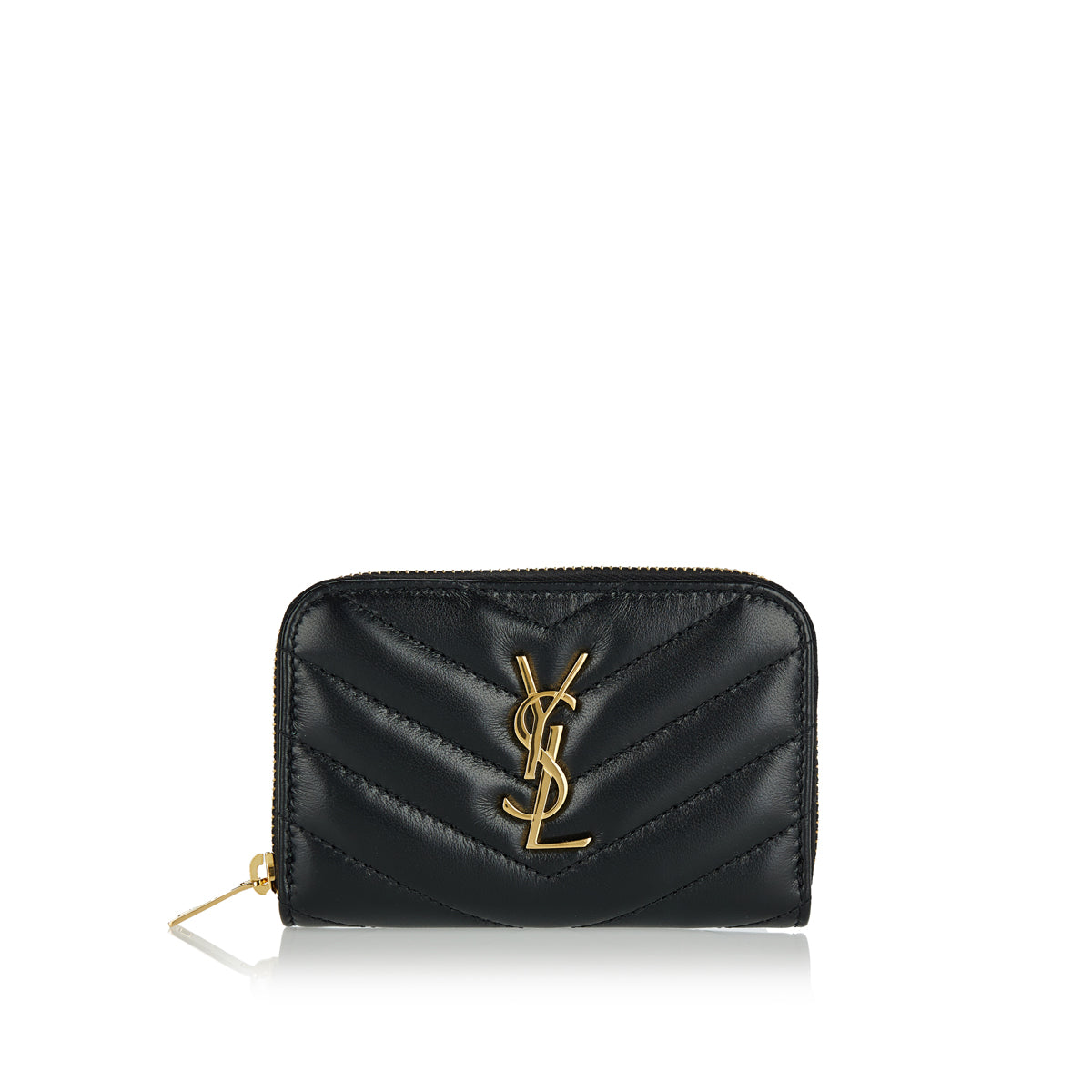 The Saint Laurent Cassandre Matelassé Coin & Card Wallet in black lambskin features the iconic YSL logo, chevron-quilted stitching, and gold-tone hardware. This compact zip-around wallet offers three gusseted compartments, providing ample space for your essentials. Crafted in Italy, it combines luxury with functionality.