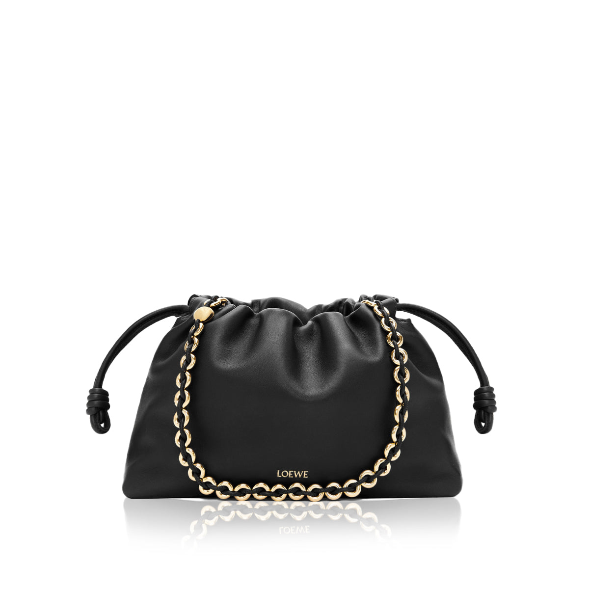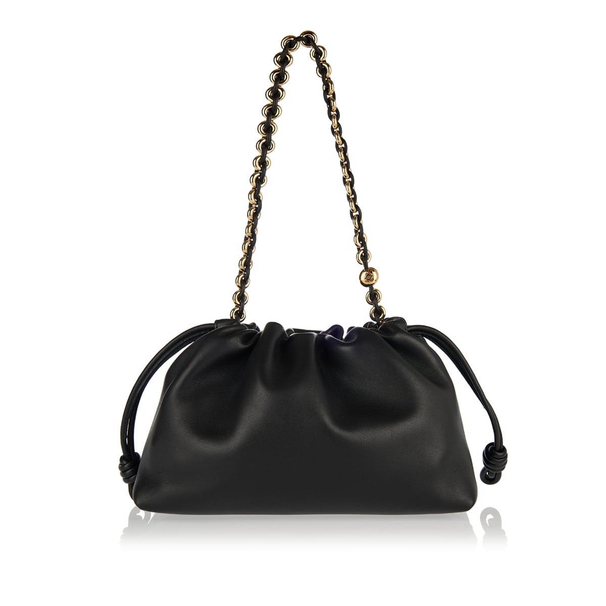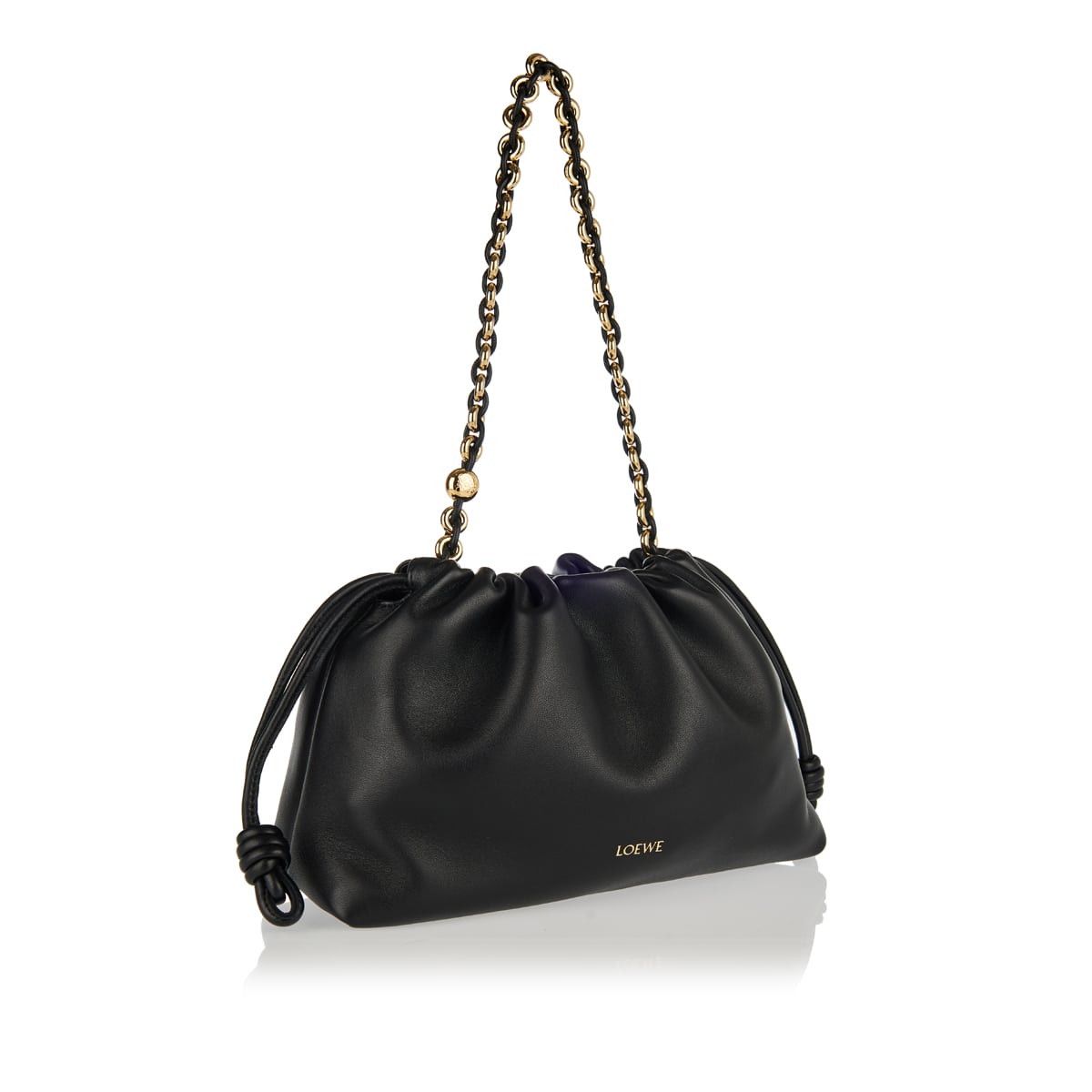 The Flamenco Purse is made from leather in a ruched design detailed with Loewe's signature knots at the sides. It comes with detachable chain strap and removable leather strap. Shoulder, crossbody or hand carry.