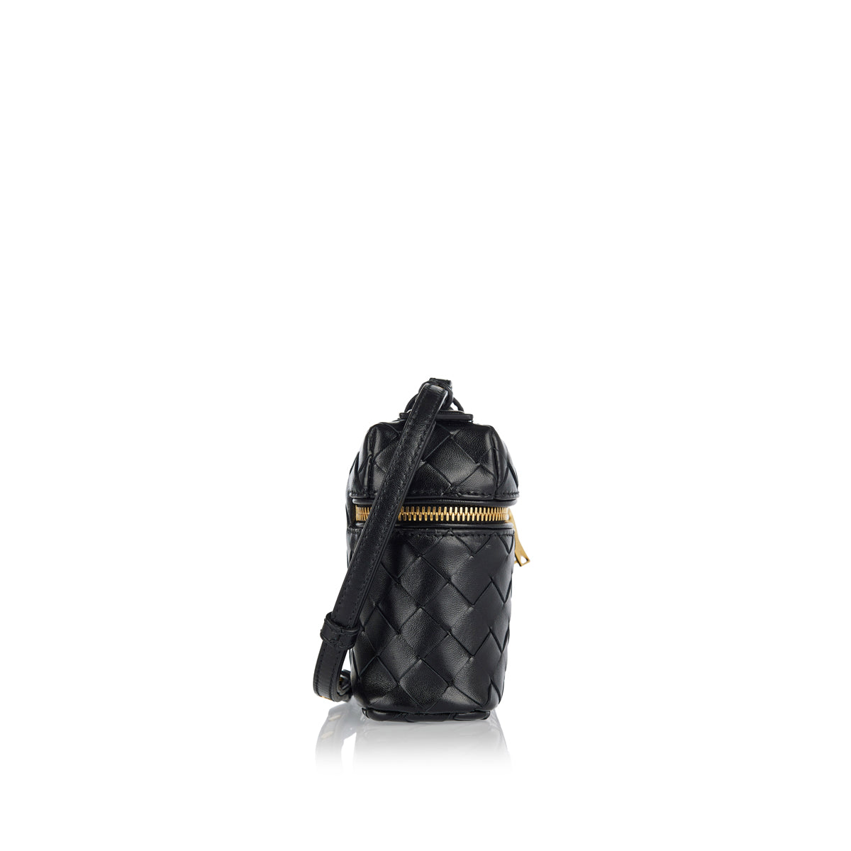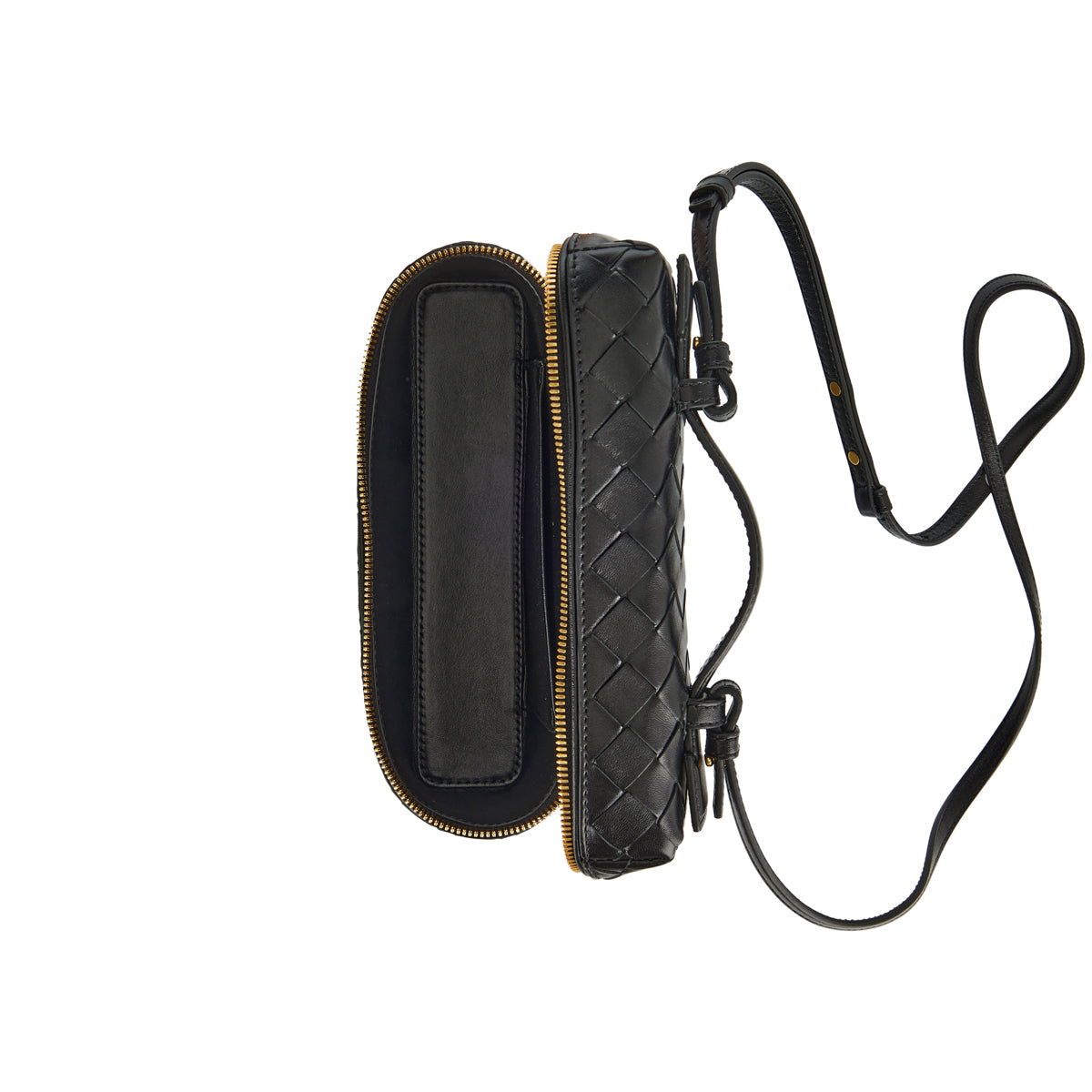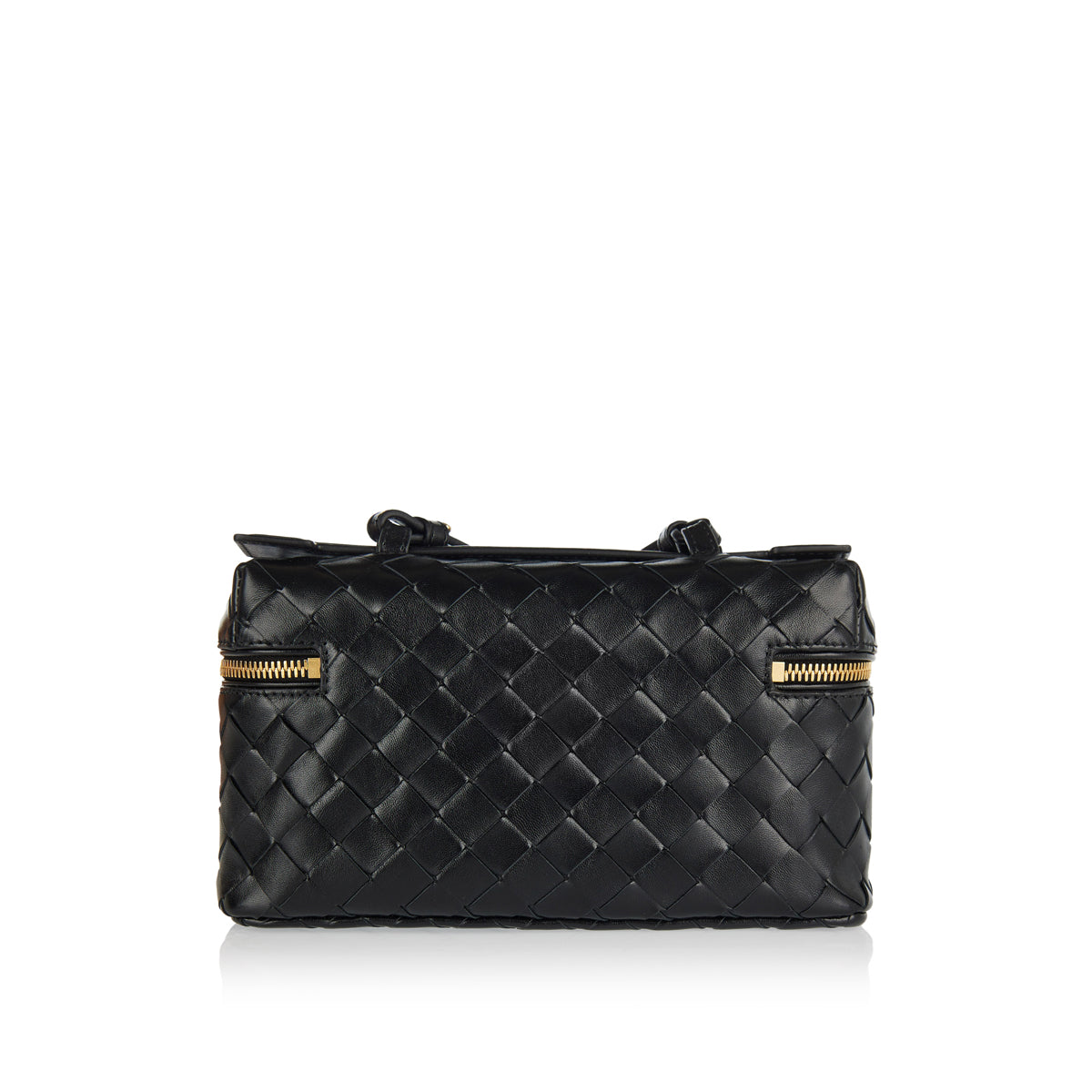 The Bang Bang Intrecciato leather vanity case with detachable strap features one main compartment and zip closure.