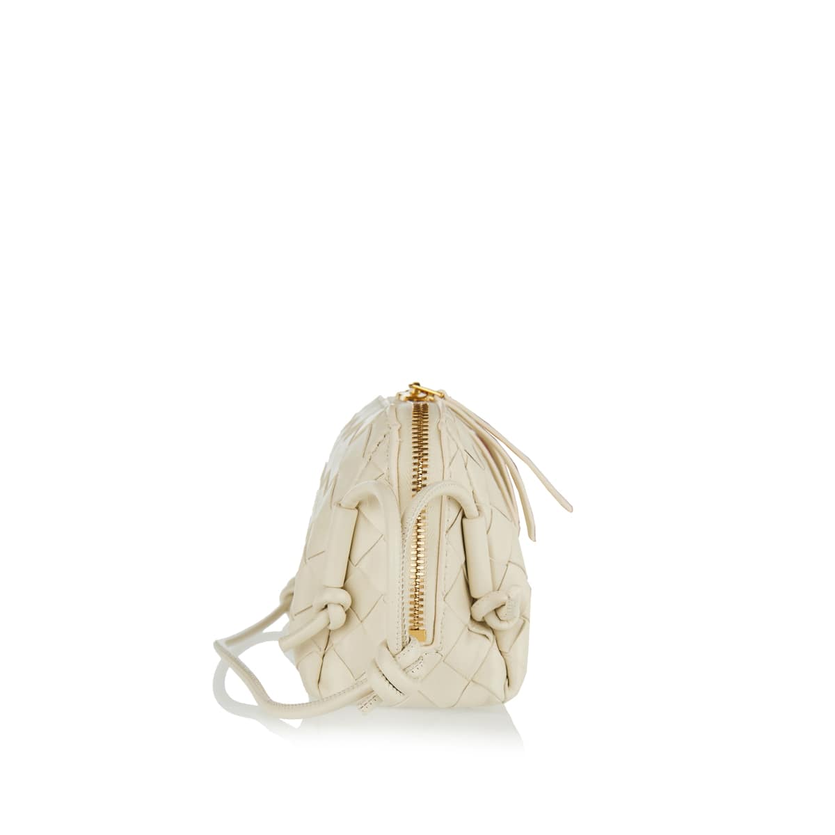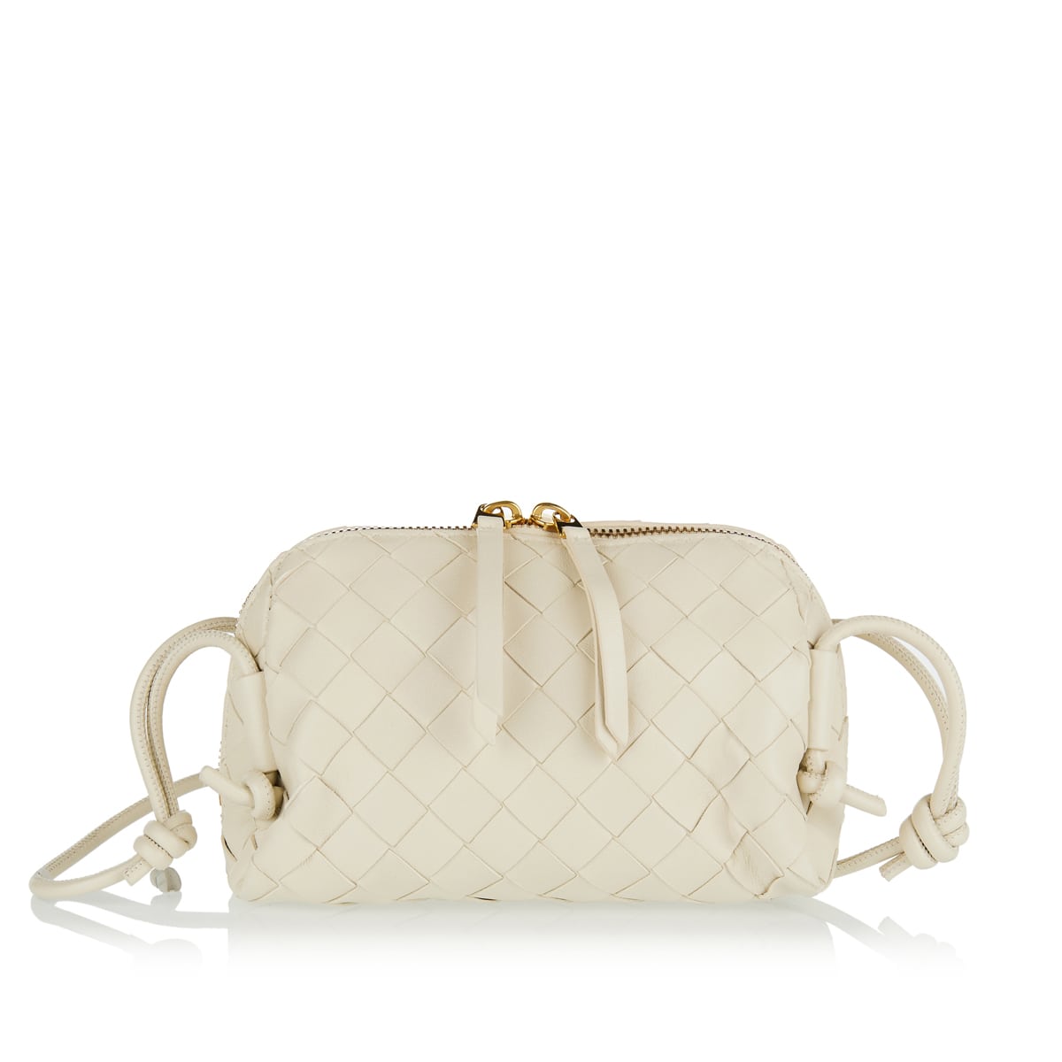 This Intrecciato leather pouch in neutrals comes with adjustable tubular strap and features one main compartment, one interior flat pocket and zip closure with leather zip puller