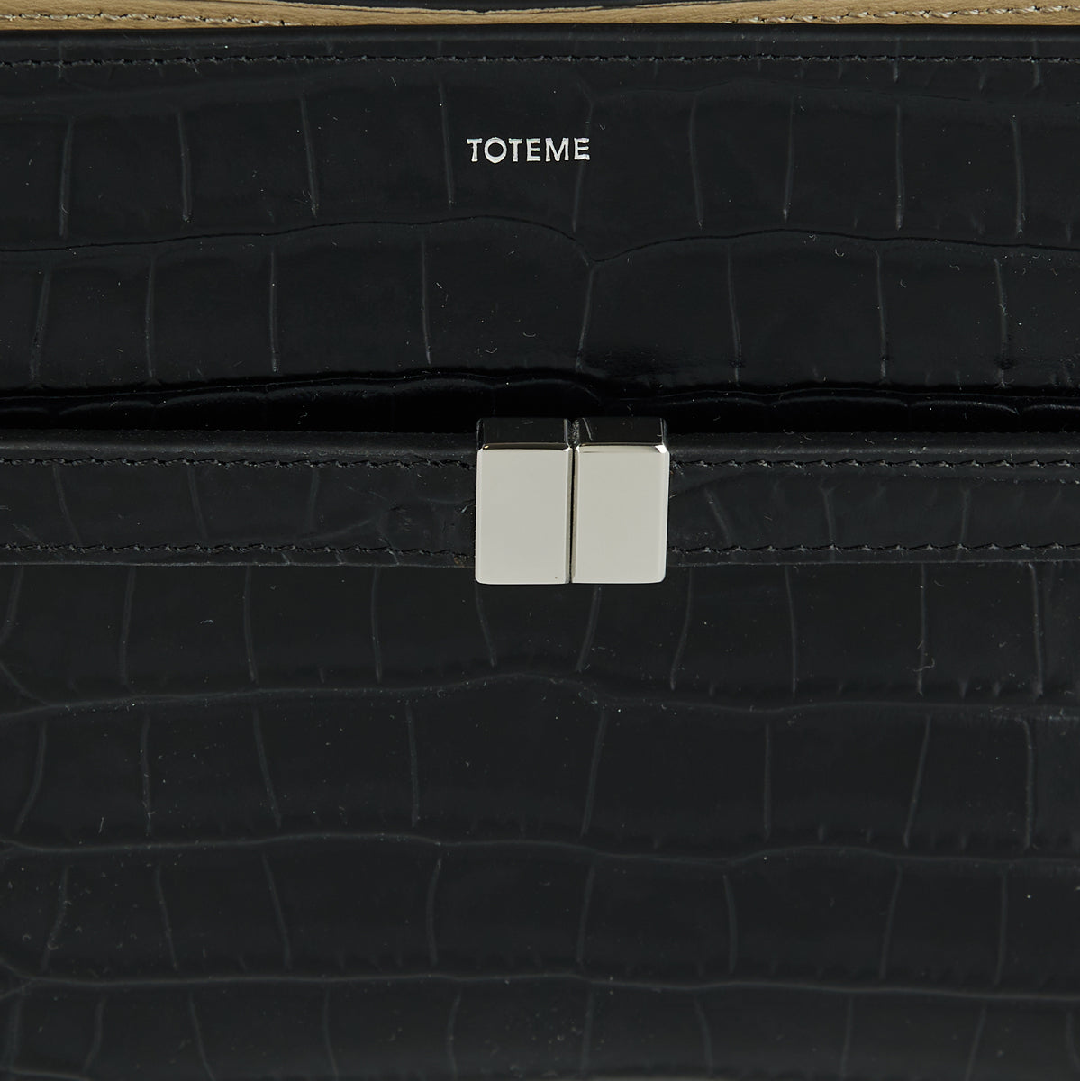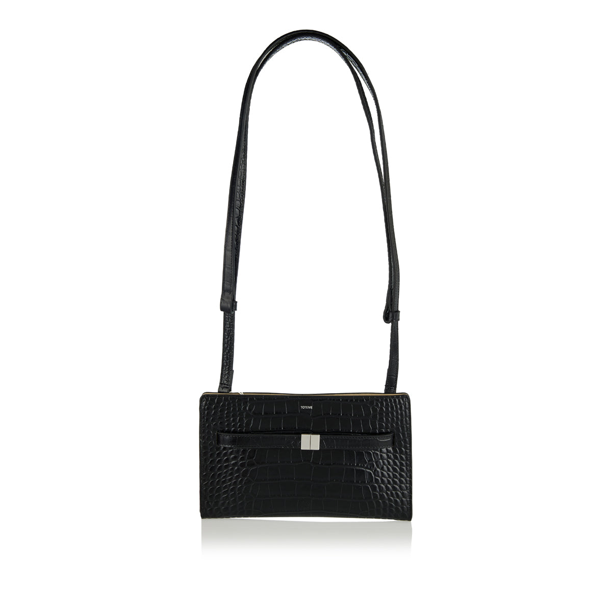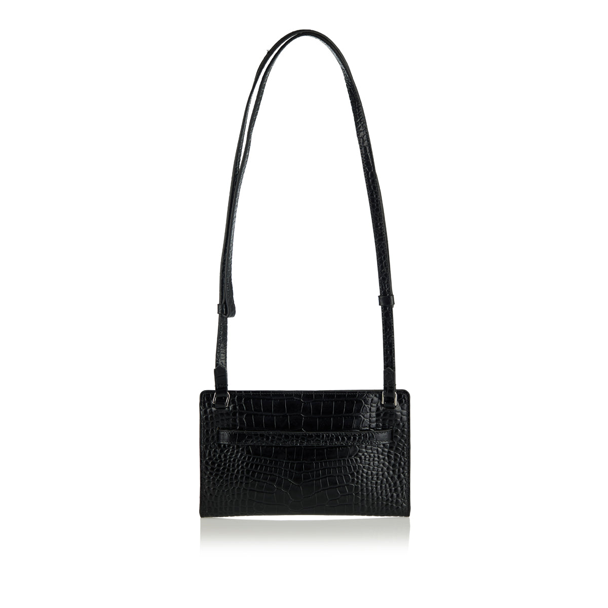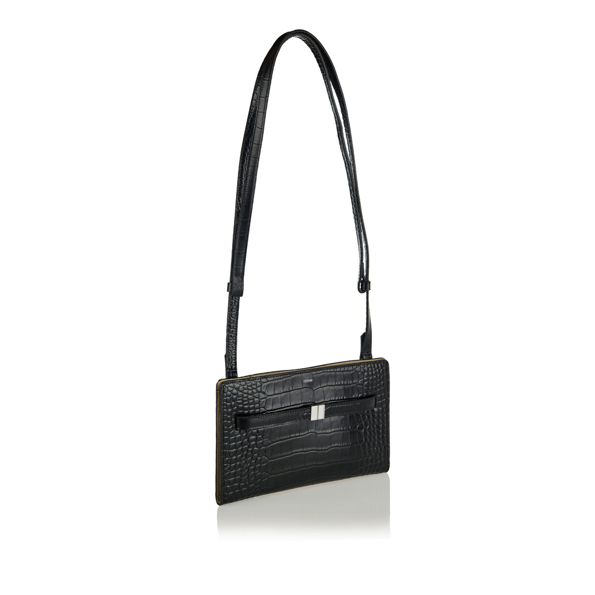A sleek shoulder bag in glossy croc‑embossed leather, refined by a slim belt detail that threads through the structured shape for a minimal, modern profile. Compact yet functional, it accommodates essentials — ideal for elevated everyday wear or refined city outfits. The detachable strap and interior slip pocket balance practicality with subtle luxury.