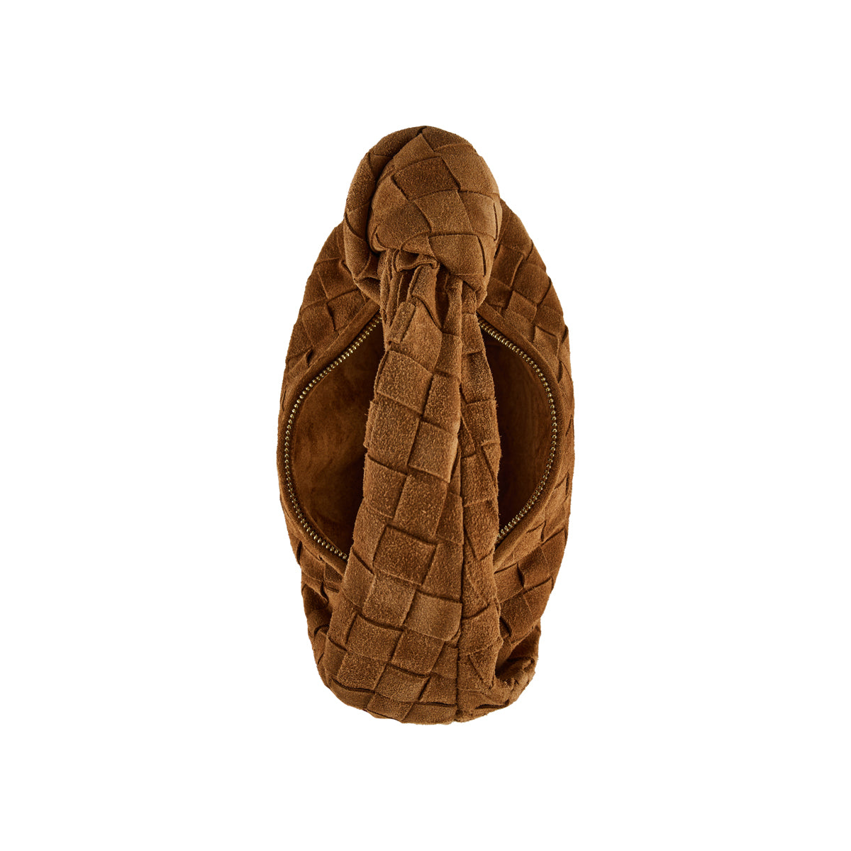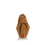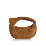 Crafted from soft suede in amber, the Teen Jodie model has a rounded hobo silhouette handwoven in the label’s iconic Intrecciato pattern. It is shaped to a slouchy design with draping, finished with a knot on the top handle. The gold tone zipper opens to one internal compartment equipped with a zipper pocket.