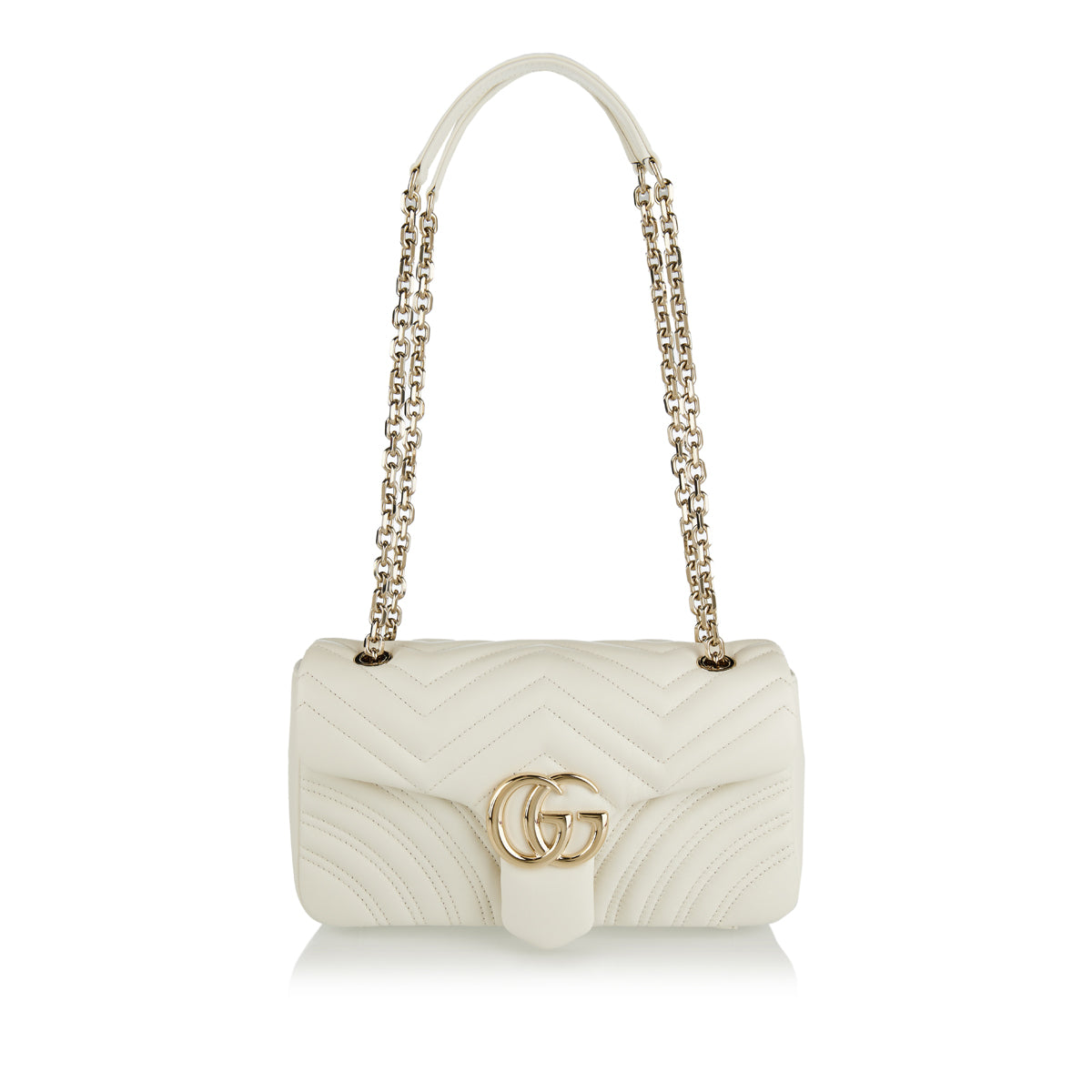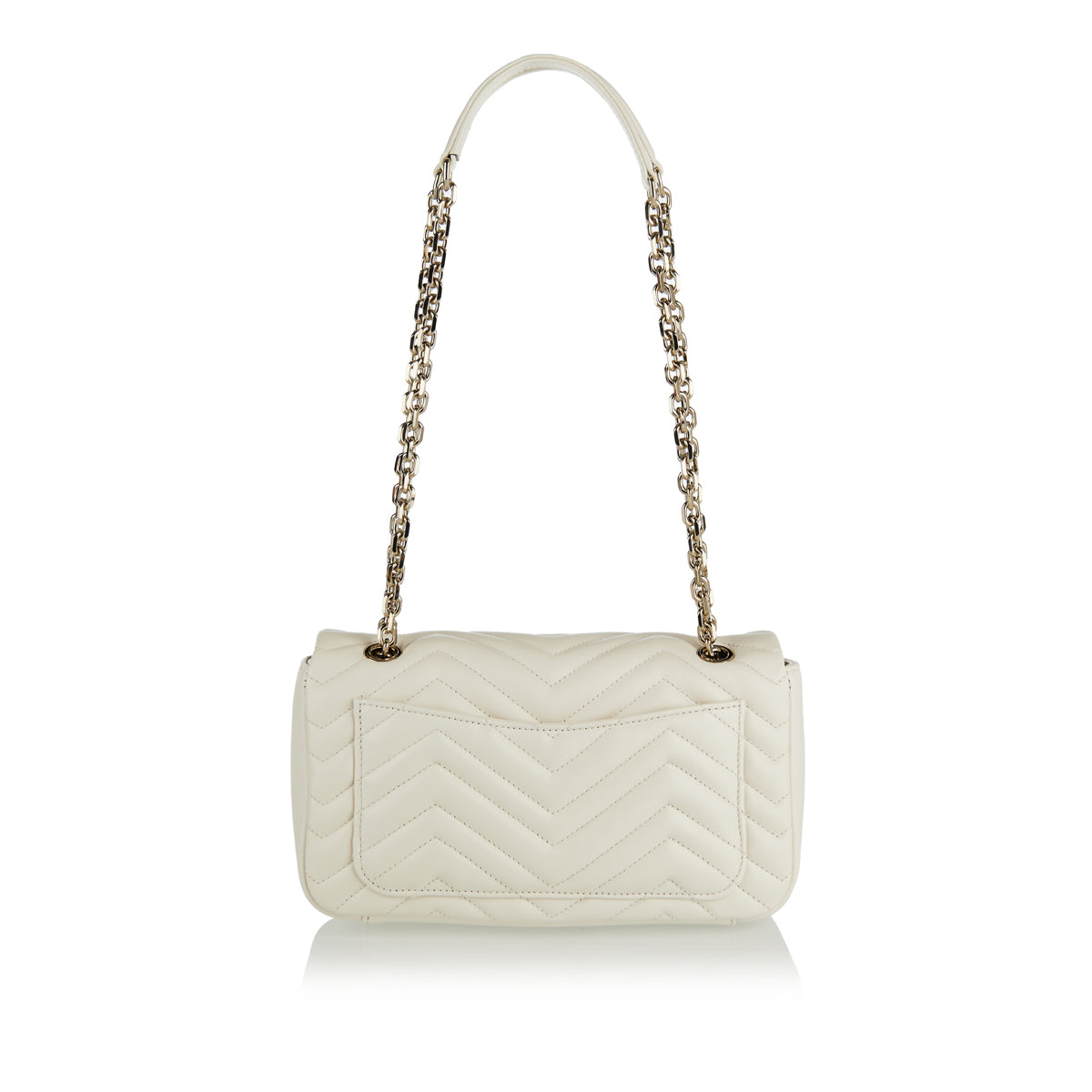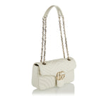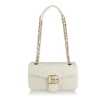 A soft‑structured shoulder bag crafted in matelassé chevron leather and defined by the iconic Double G hardware, this medium‑size GG Marmont offers a refined balance of elegance and everyday practicality. Its sliding chain‑link strap provides versatile wear — over the shoulder, crossbody or as a top handle — while the interior zip pocket and flap closure ensure subtle sophistication. Perfect for polished daytime looks or chic evening ensembles where understated luxury speaks volumes.