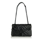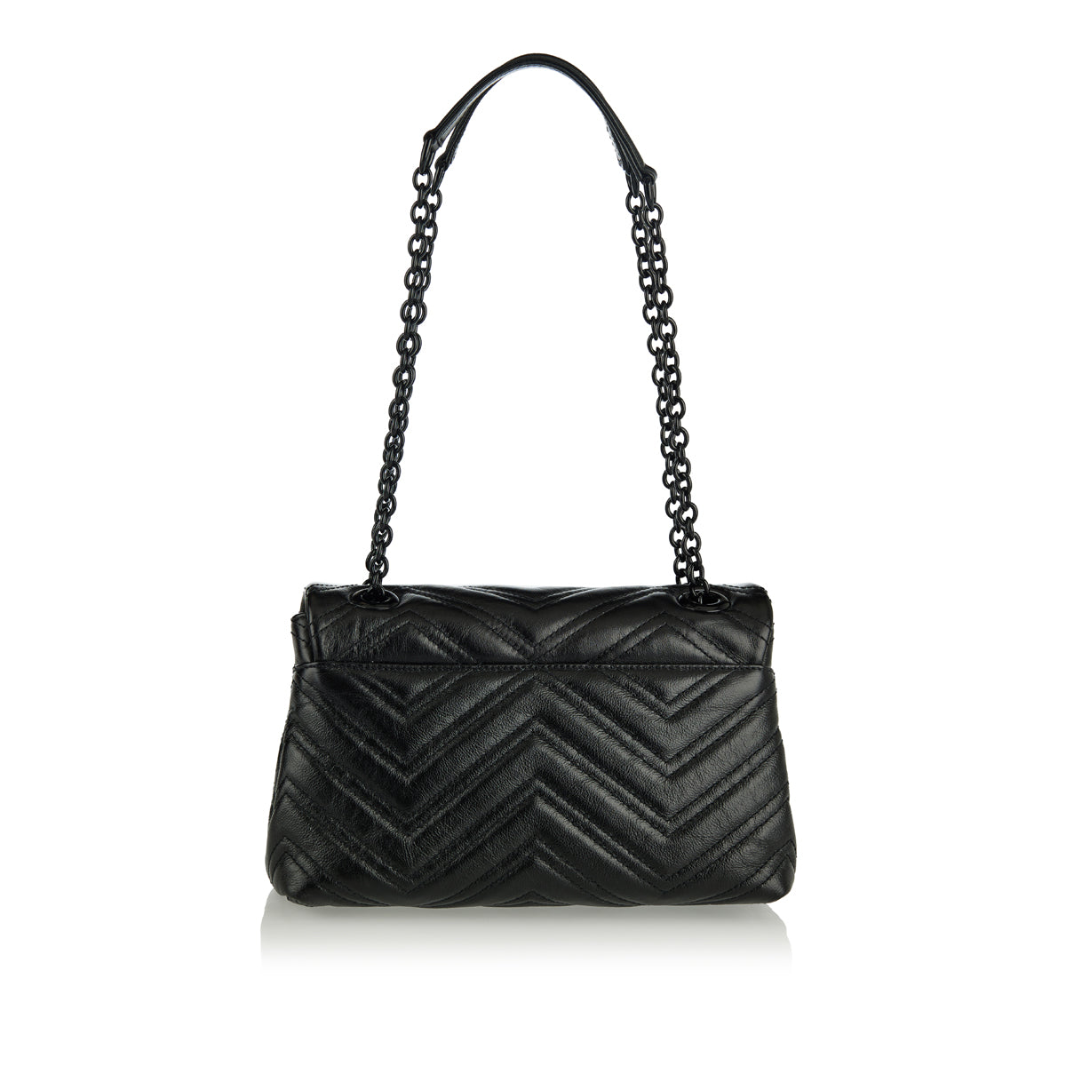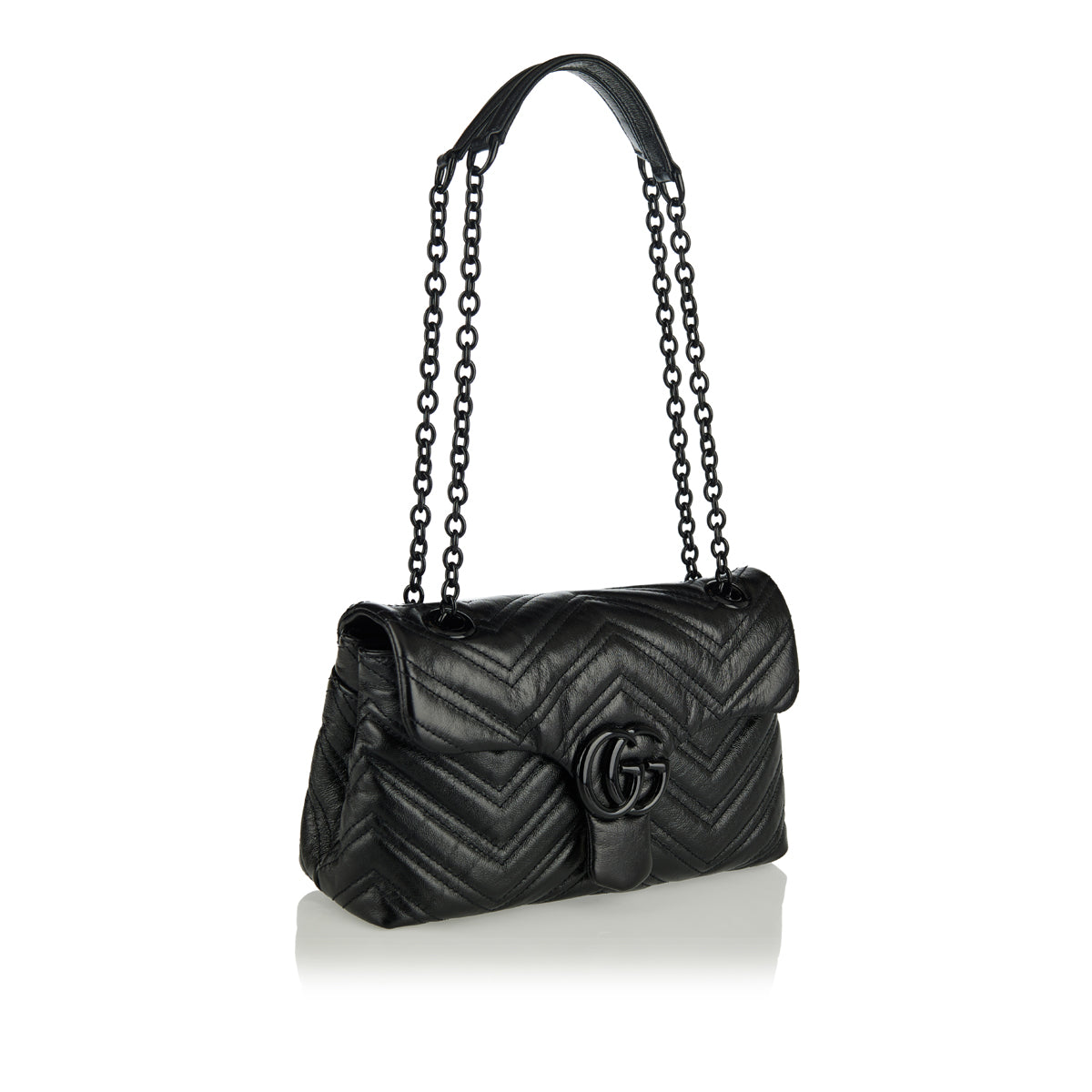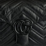 A refined Gucci GG Marmont small shoulder bag in supple matelassé chevron nappa leather, featuring gold‑tone Double G hardware and a sliding chain‑link shoulder strap that adjusts from shoulder to crossbody wear. Finished with a magnetic snap closure and internal slip pocket, its compact silhouette carries daily essentials with understated elegance — ideal for polished daytime outfits or chic evening looks.