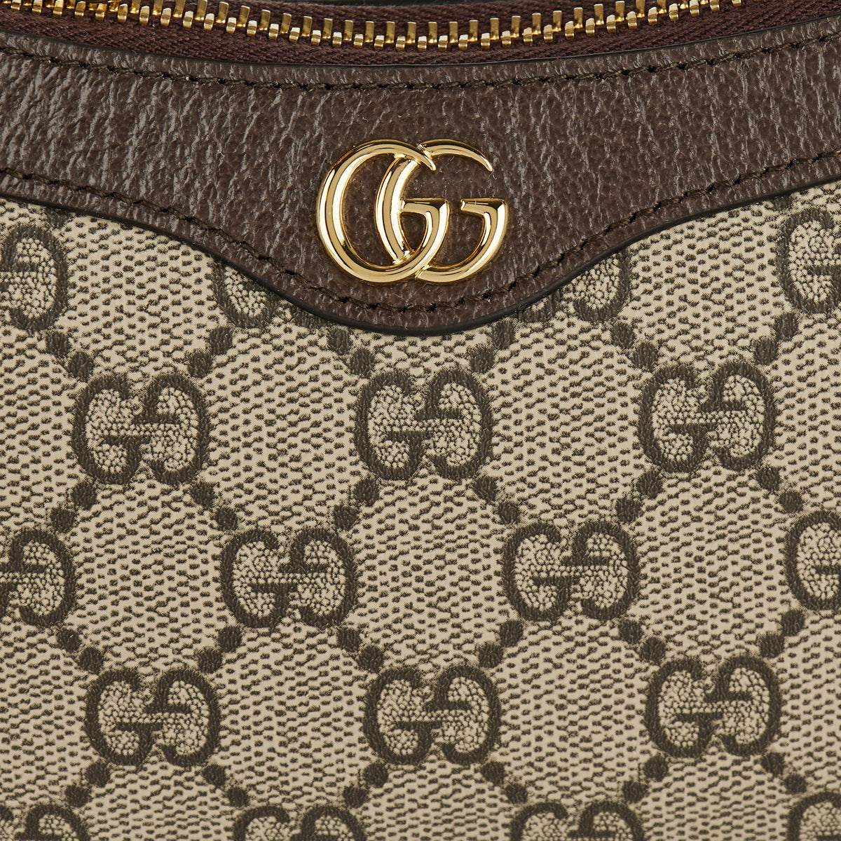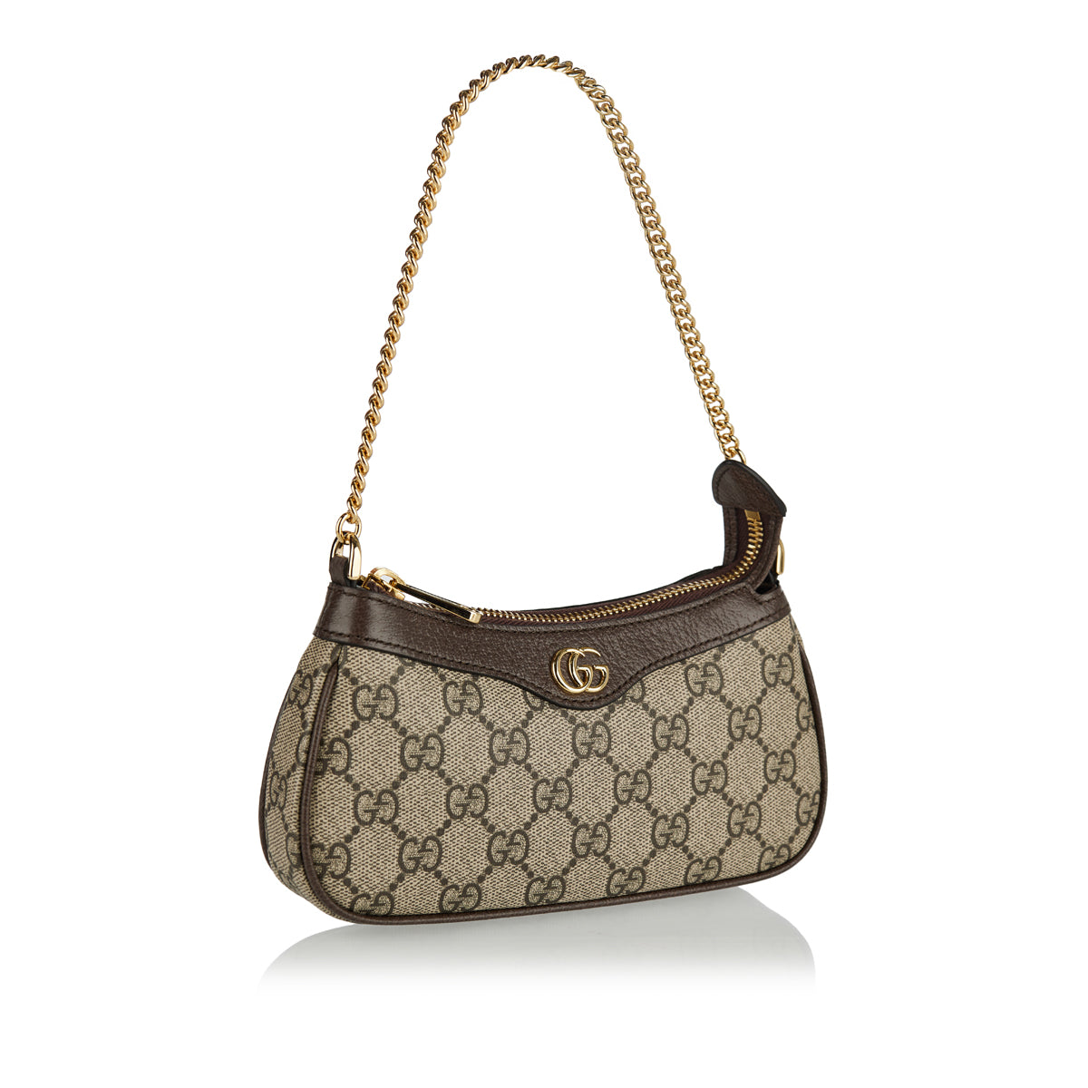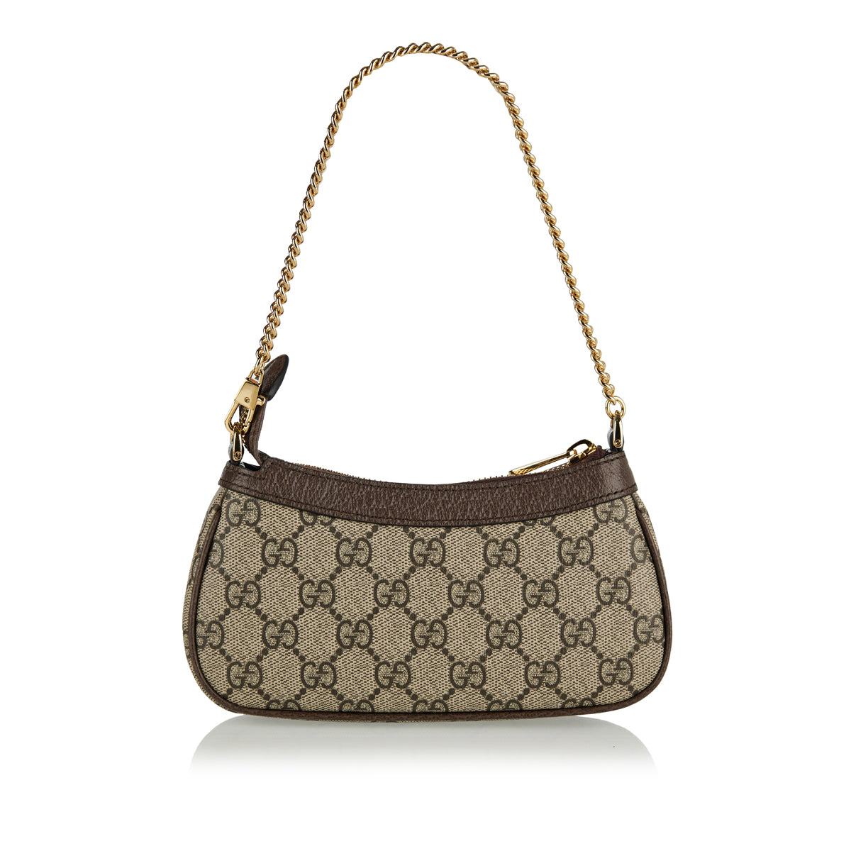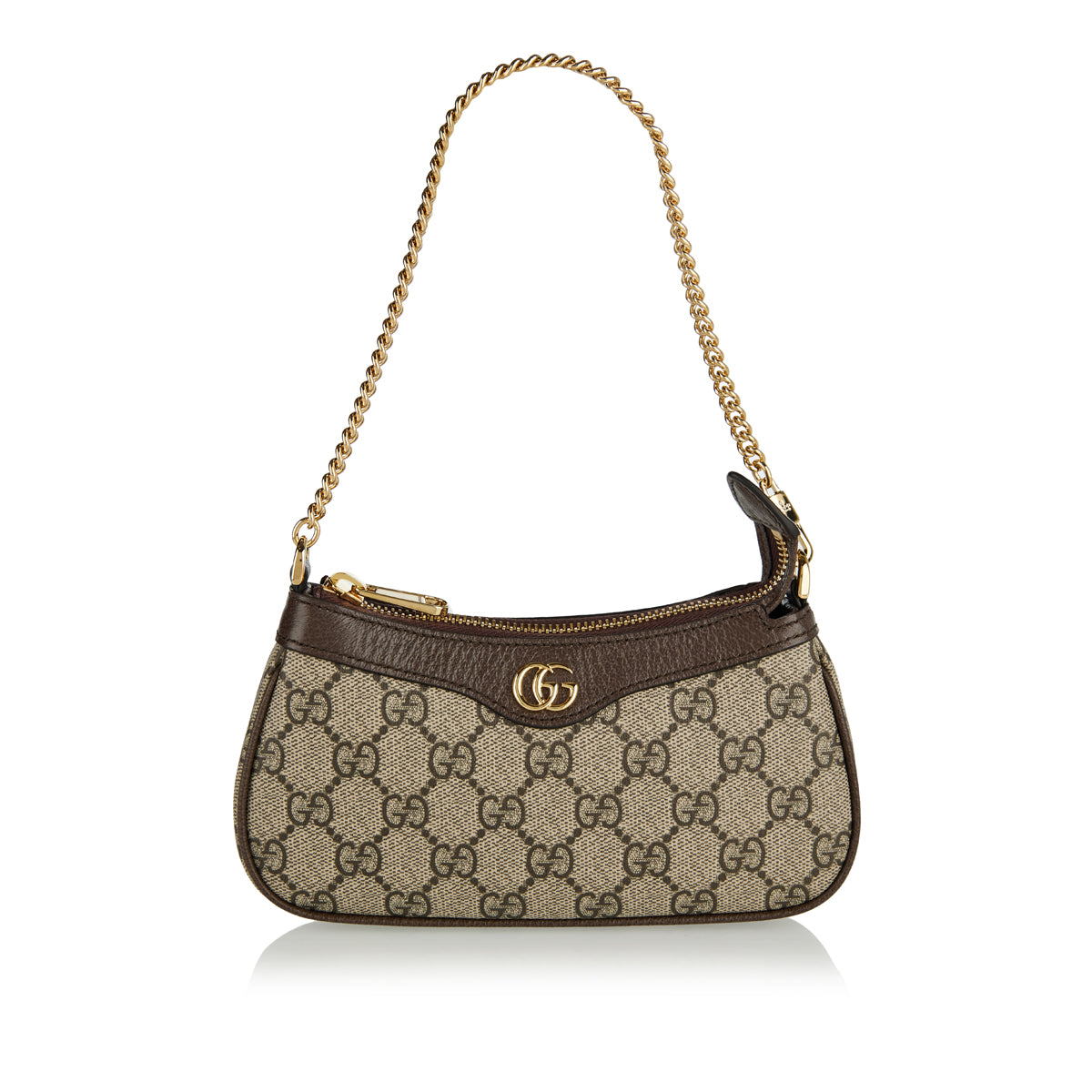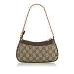 This beige and ebony GG Supreme canvas mini bag features brown leather trimming Double G hardware top zip closure and chain shoulder strap.
