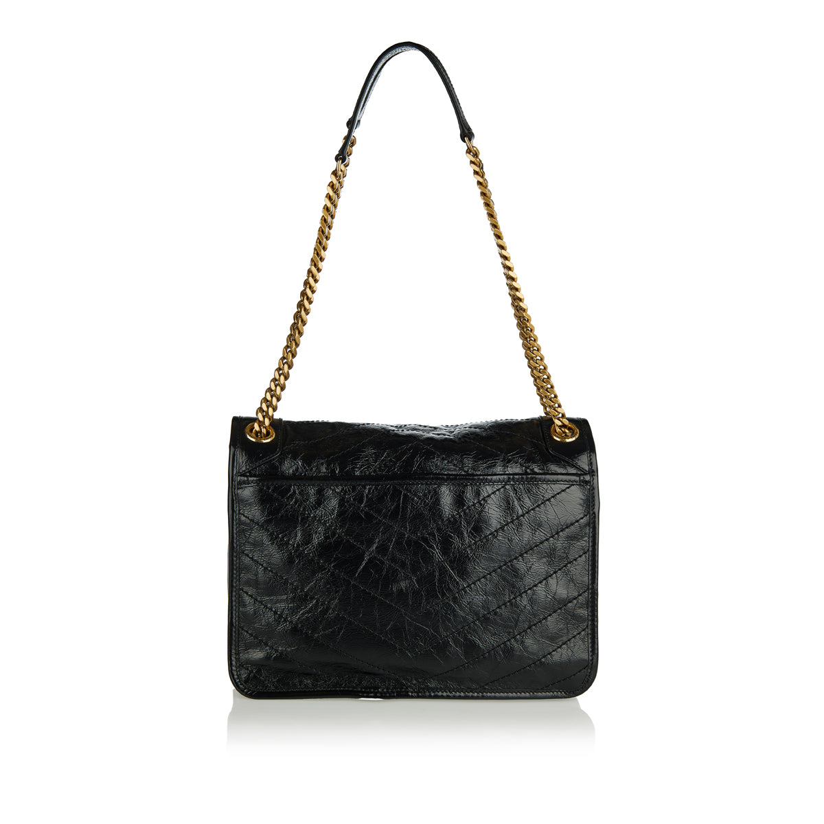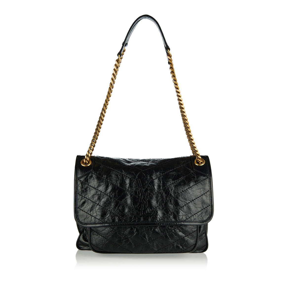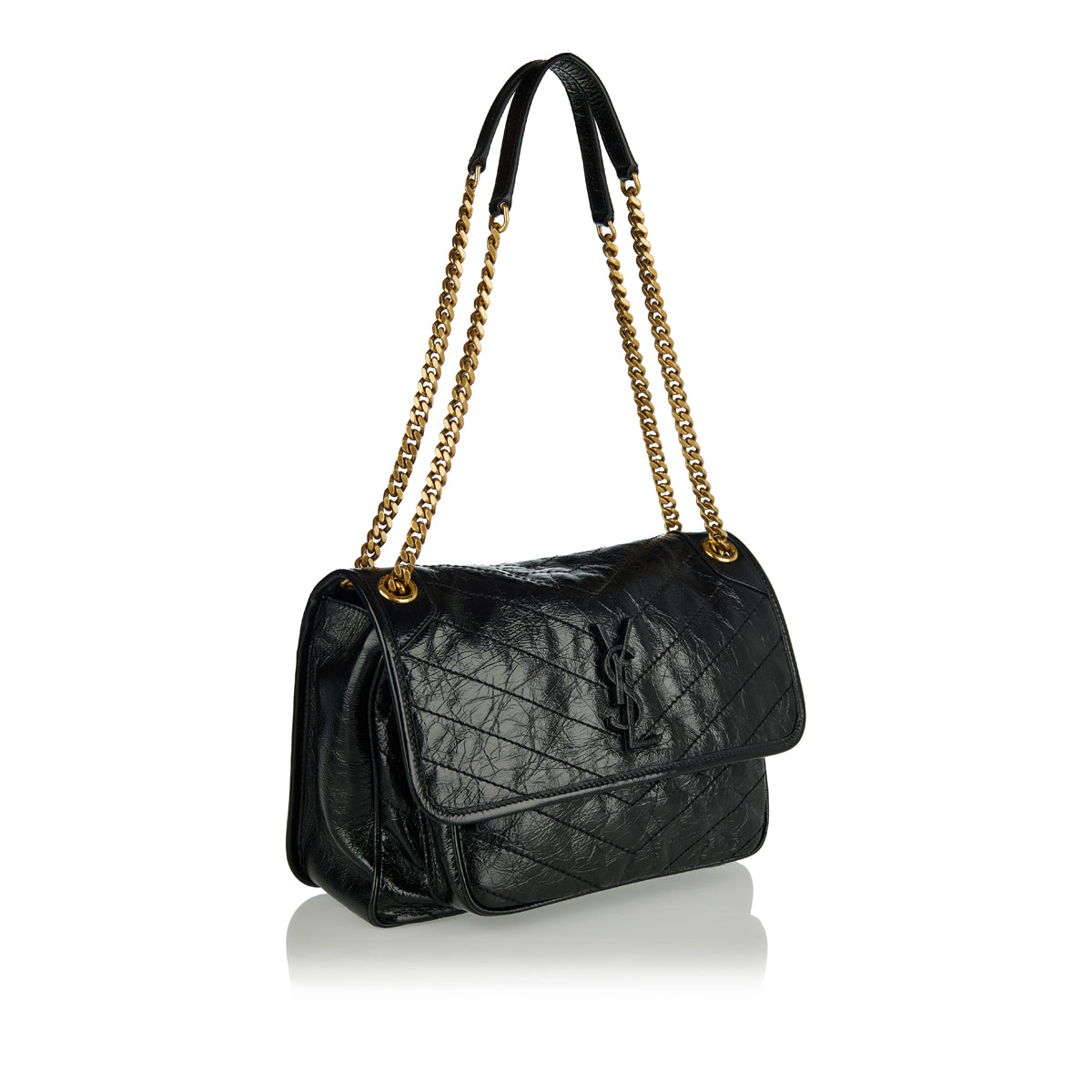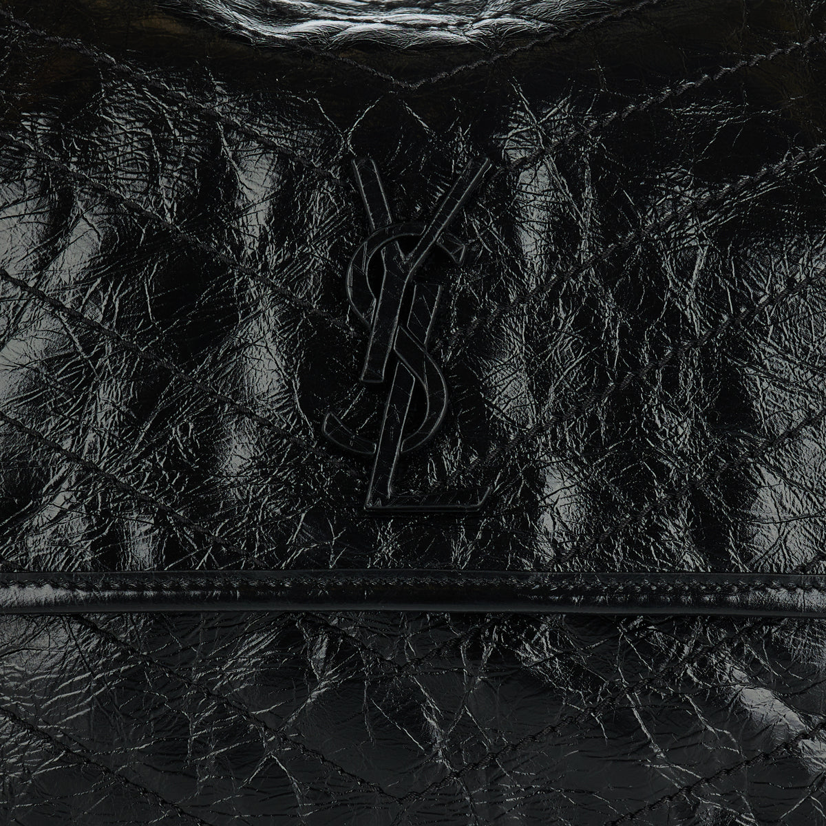 The Niki medium bag from Saint Laurent is crafted from supple vintage-effect leather in black. Featuring a tonal YSL monogram, a flap closure, and a sliding chain shoulder strap, it embodies the house’s Parisian elegance with a contemporary edge.
