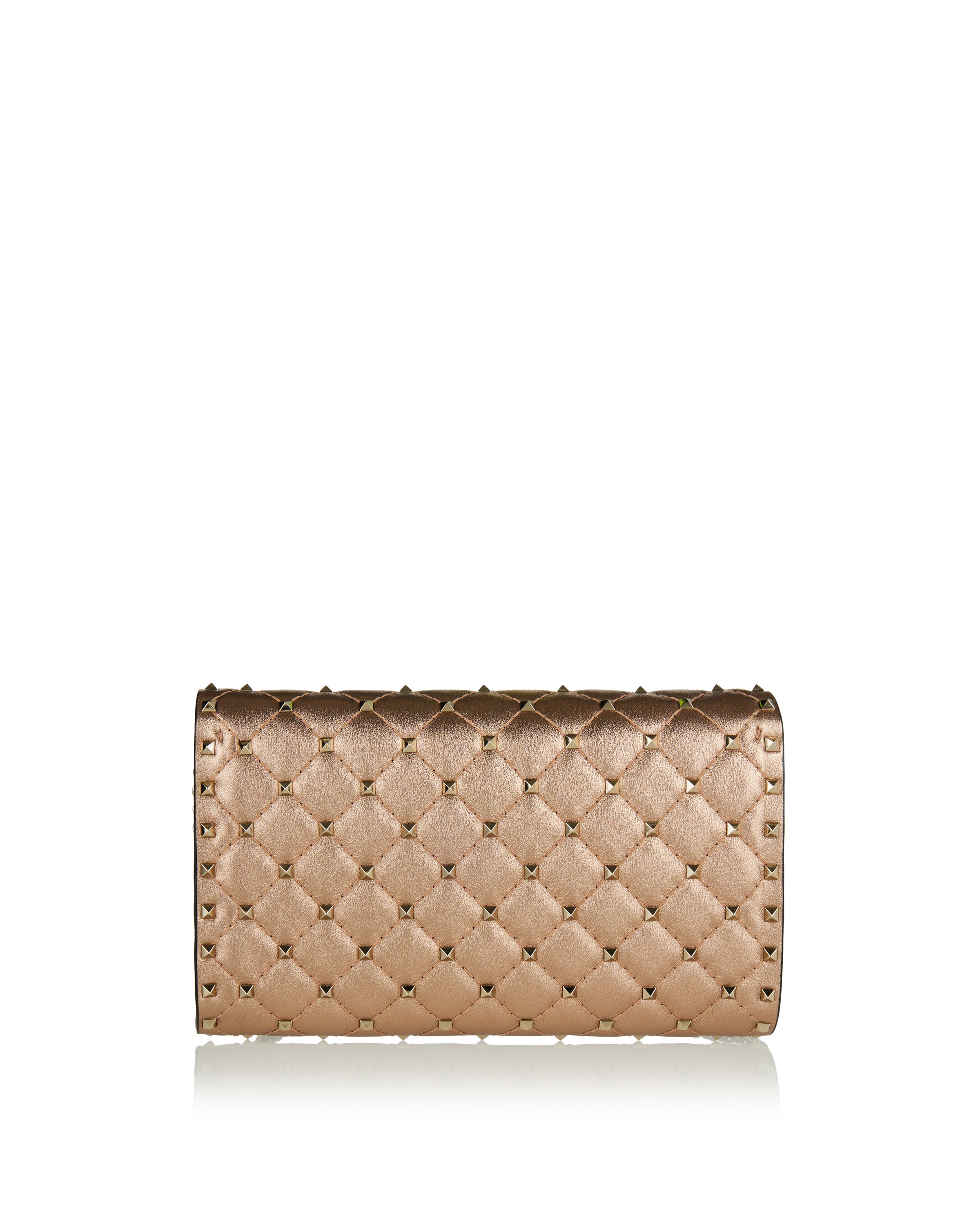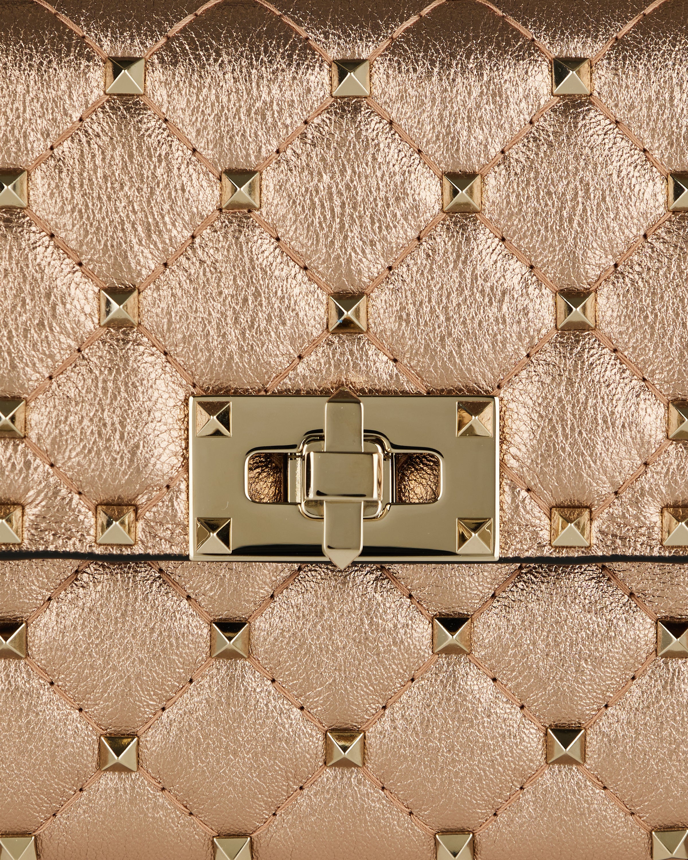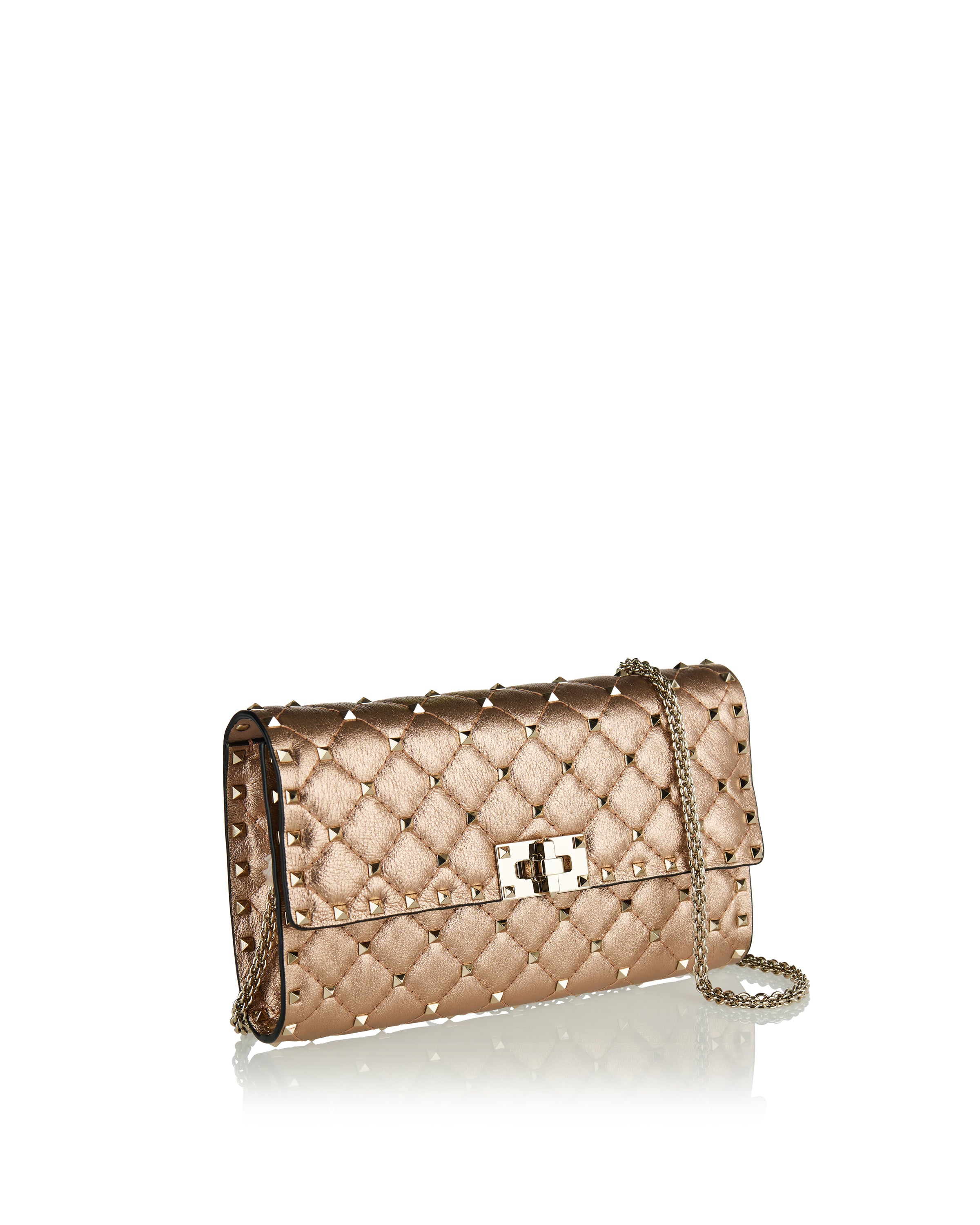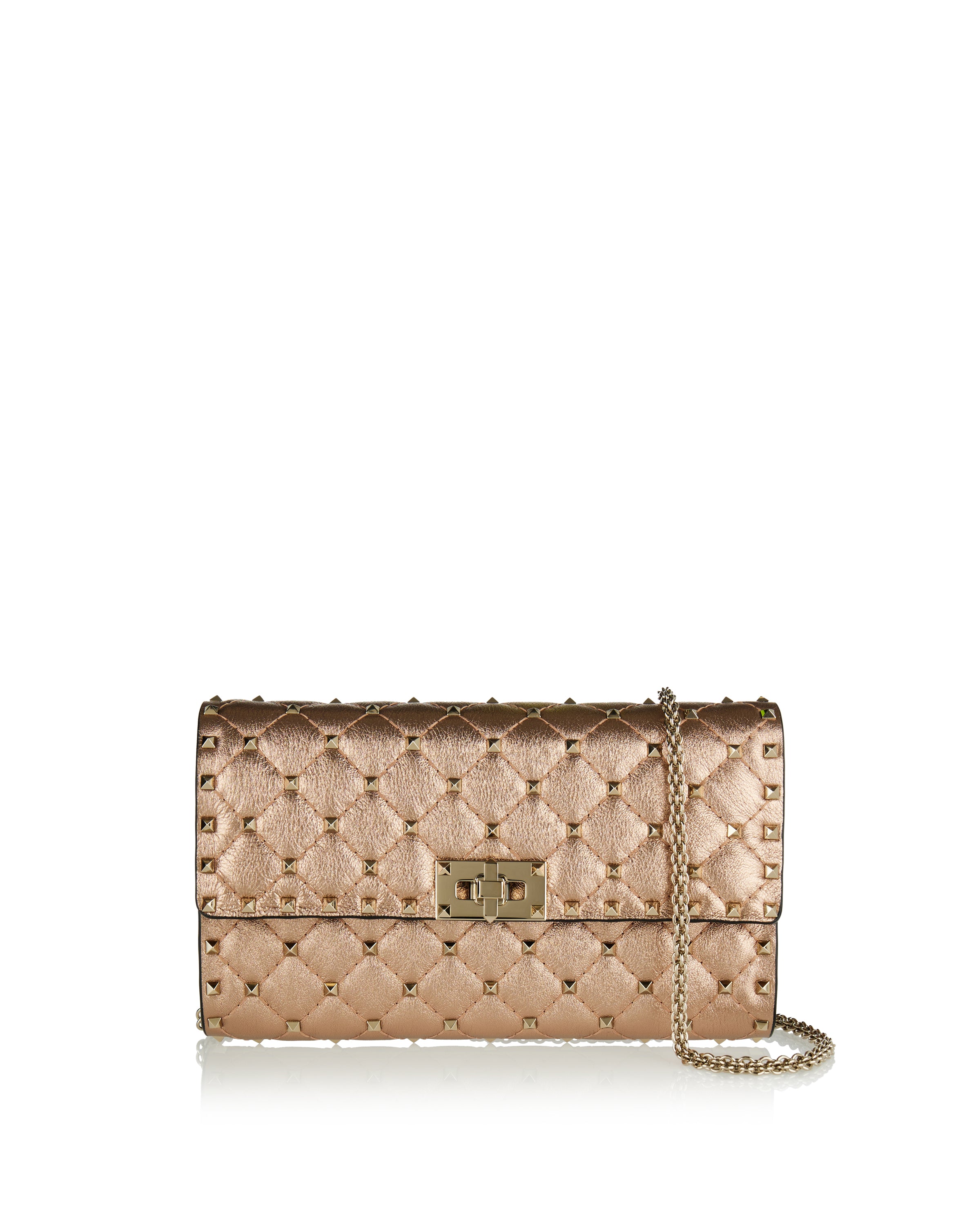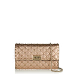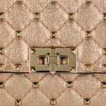 Defined by a quilted, structured silhouette, this shoulder bag is crafted from laminated nappa leather for a refined yet expressive finish. The design is accented with signature stud detailing that adds texture and dimension while maintaining a balanced, elegant profile. Designed for versatile wear, it features a compact construction with a chain strap that transitions effortlessly from day to evening. Suitable for everyday styling, refined city looks, and elevated occasions, it delivers modern sophistication with a bold, polished attitude.