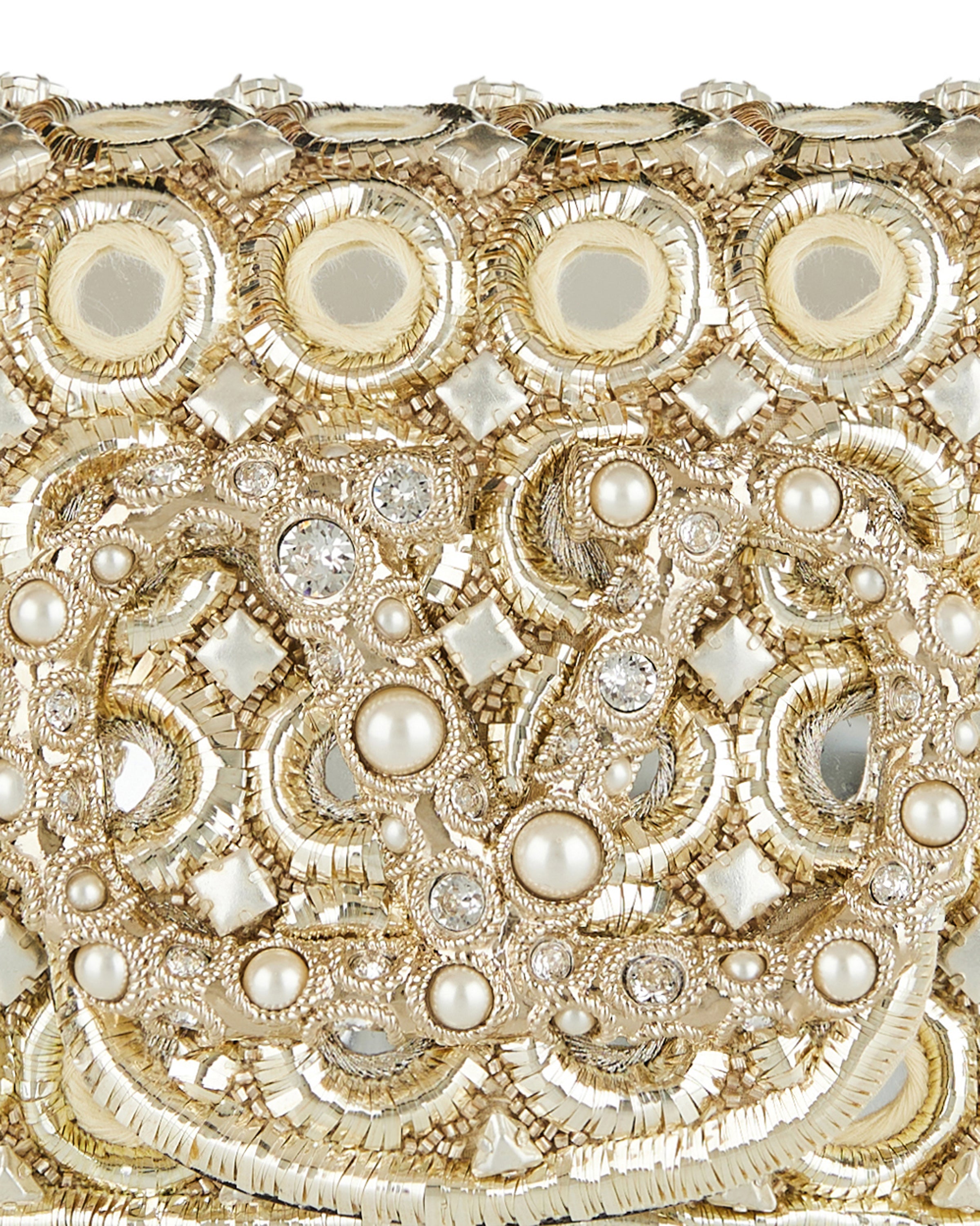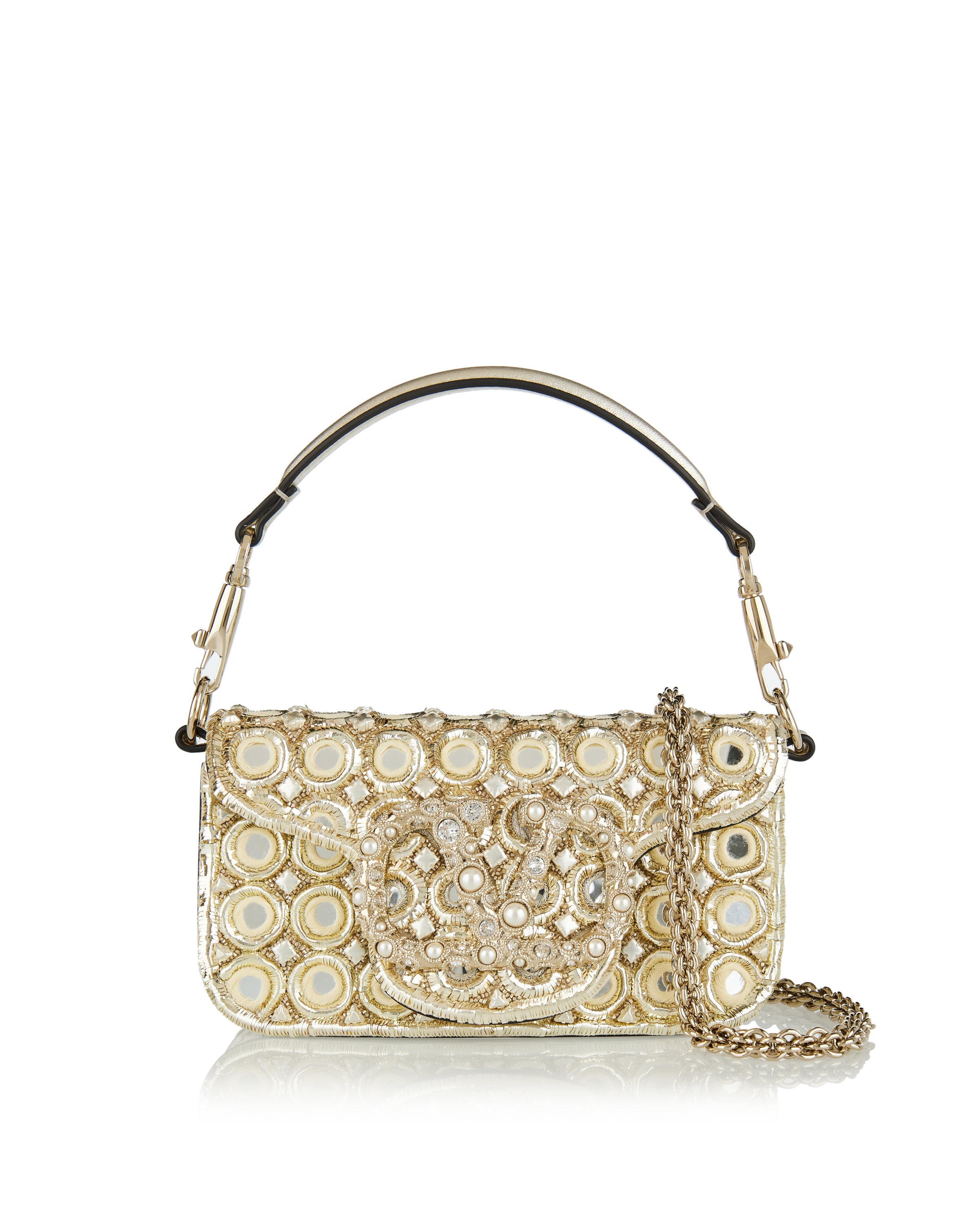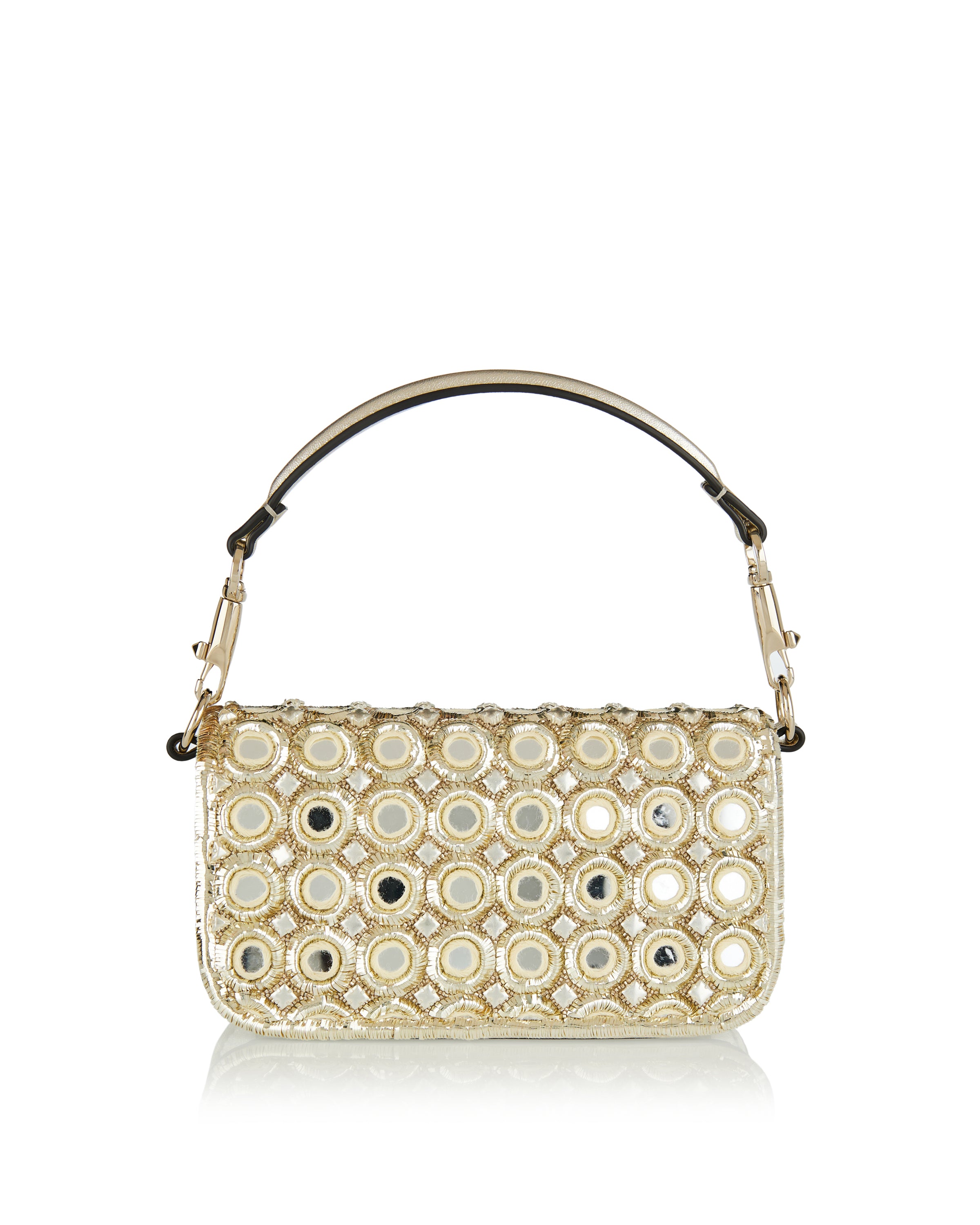 Small shoulder bag defined by a sleek silhouette and an embroidered jewel logo, designed to carry essentials with refined elegance and subtle glamour.