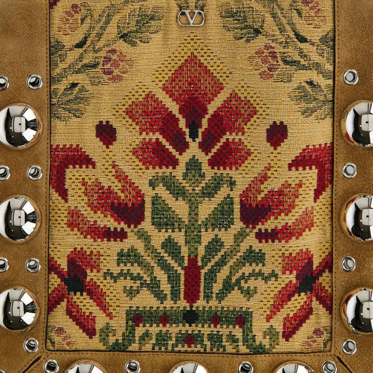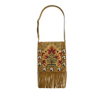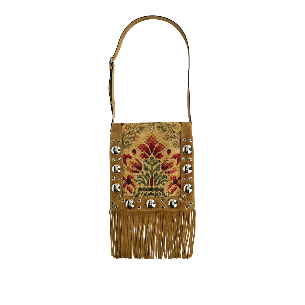 Valentino Garavani’s Nellcôte shoulder bag is crafted in richly textured jacquard fabric with leather trims, accented by cascading fringes that add dynamic movement. Featuring a spacious interior, flap closure, and adjustable strap, it blends artisanal detailing with a bohemian spirit, making it a distinctive accessory for both day and evening styling.