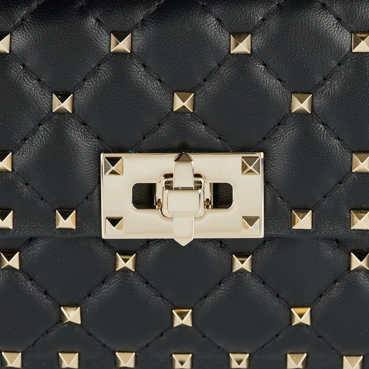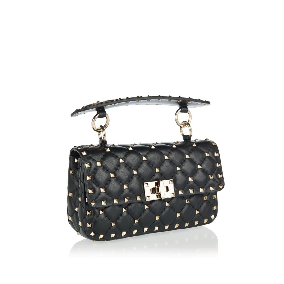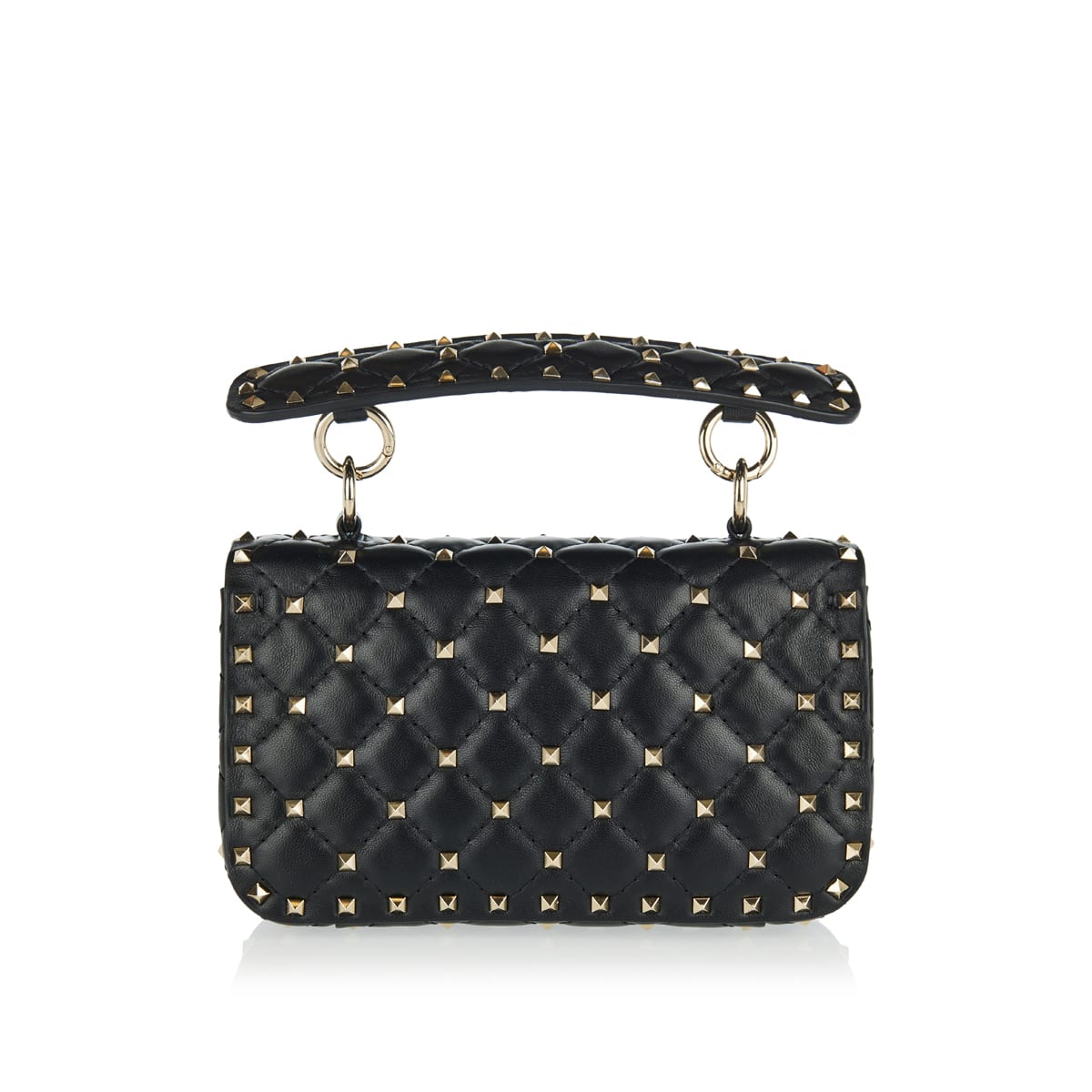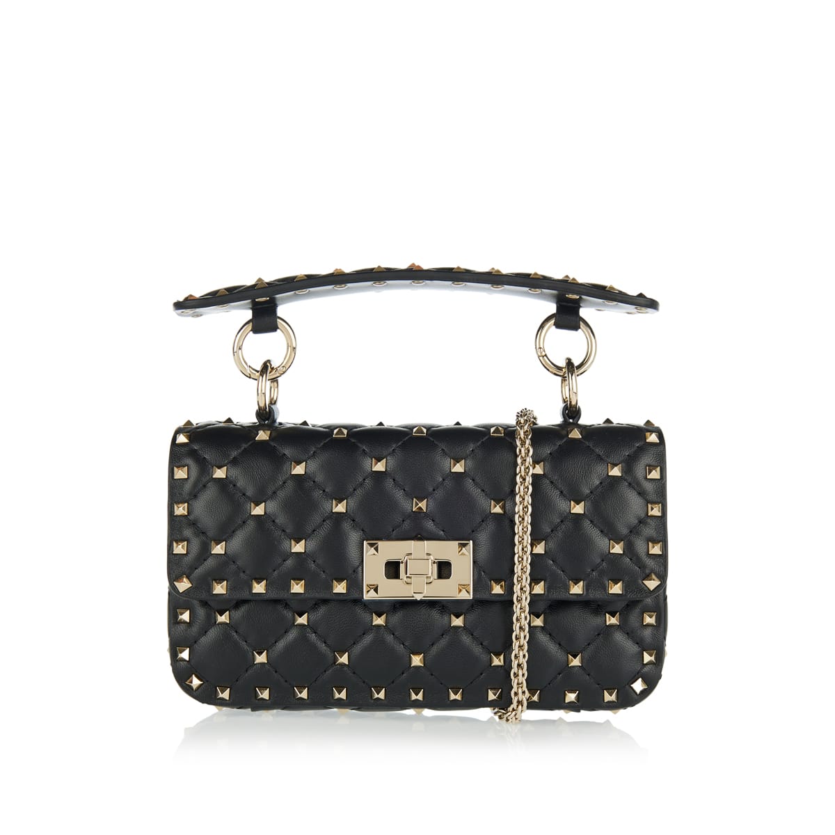 Elevate your style with the Valentino Garavani Rockstud Spike Small Leather Bag—a timeless statement of luxury and sophistication. Crafted from supple leather in a diamond-quilted design, this iconic piece is adorned with signature gold-tone Rockstuds. Featuring a structured flap top with a twist-lock closure, a removable handle, and a single compartment with an open pocket, it offers both elegance and practicality. Wear it as a shoulder bag with the detachable chain strap for effortless versatility.