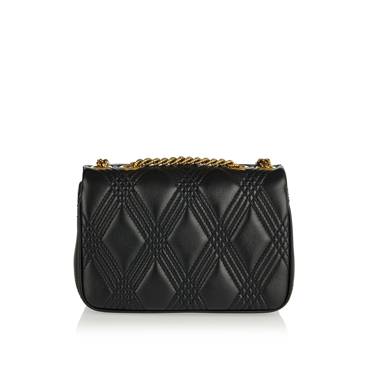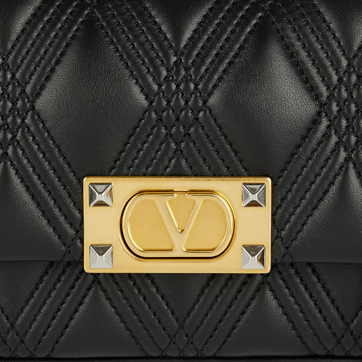 The Valentino Garavani Quiltie 67 Small Shoulder Bag in quilted nappa leather offers a perfect balance of timeless elegance and modern sophistication. This exquisite piece features a diamond-patterned construction, highlighted by tone-on-tone stitching and an antique gold finish hardware. With its versatile sliding chain, the bag can be worn on the shoulder or crossbody for effortless style. The VLogo Signature plaque and palladium-finish studs add a touch of luxury, while the interior slip pocket ensures practicality. A must-have accessory for the discerning fashion connoisseur.