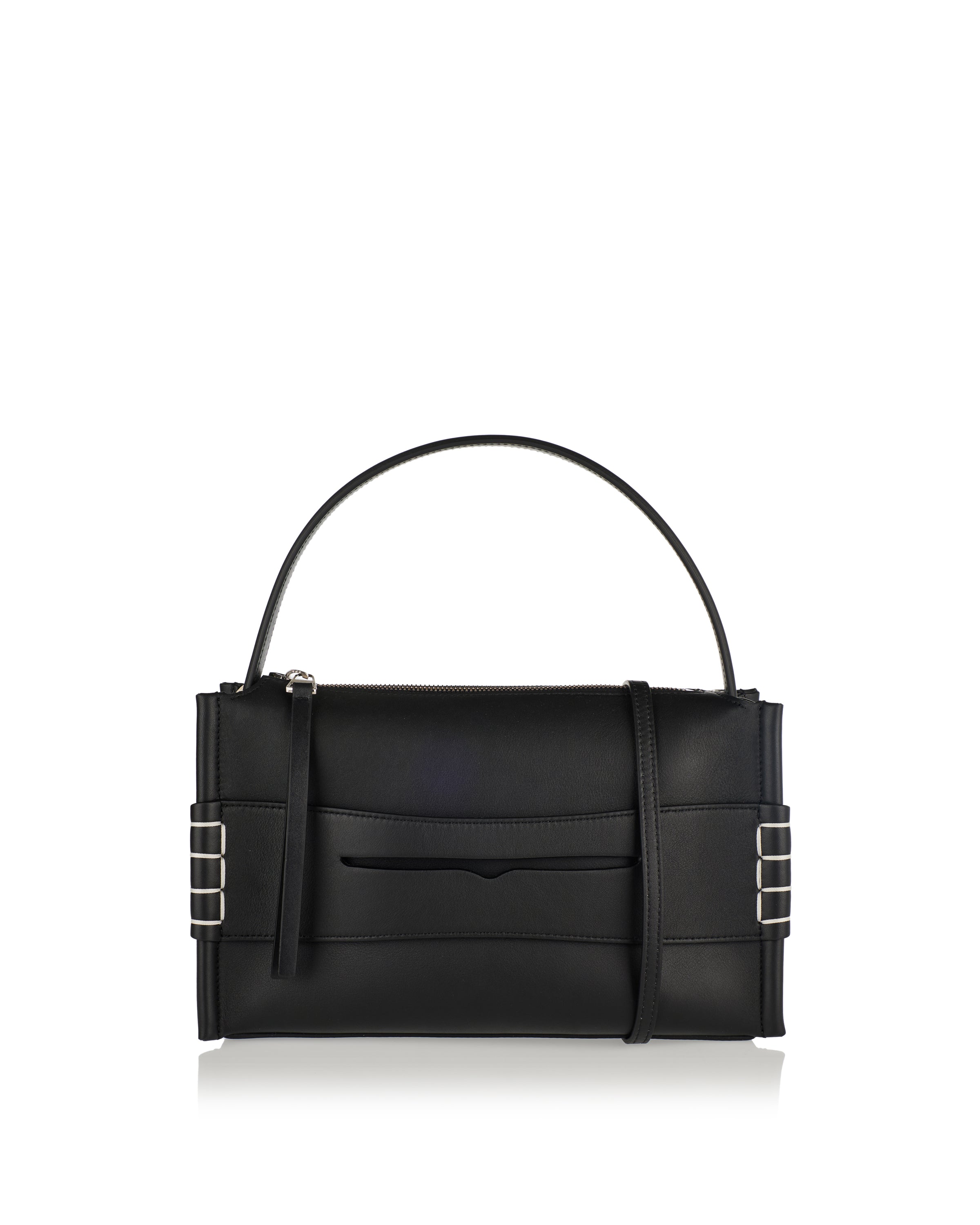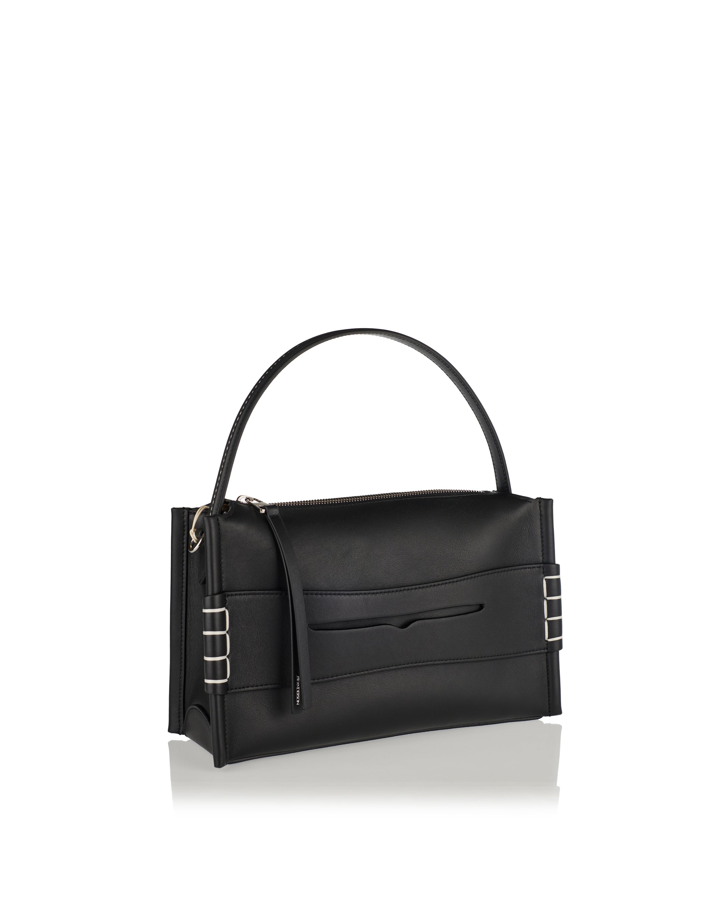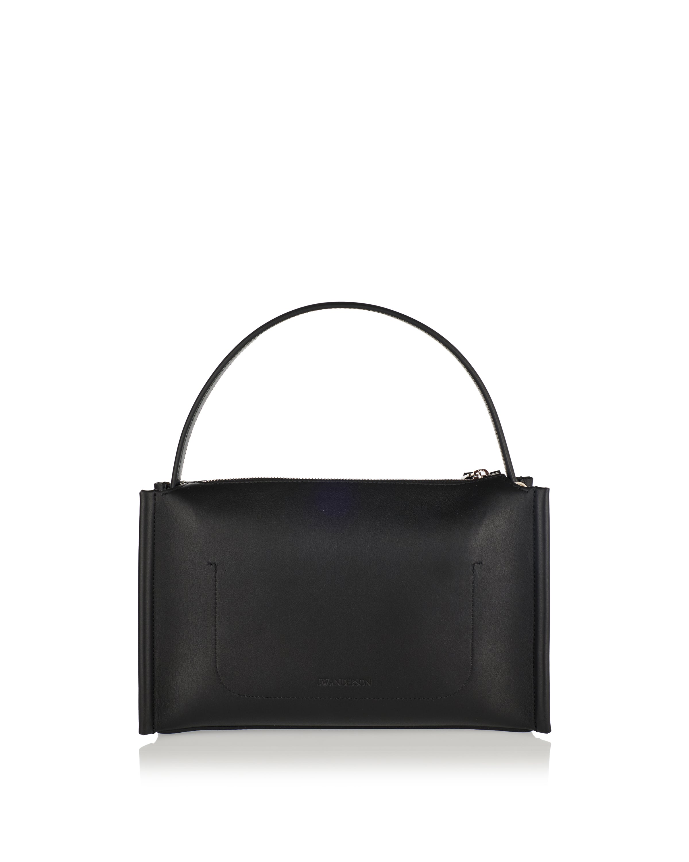 A sculptural JW Anderson Loafer bag in smooth black calf leather, reimagining classic penny-loafer motifs with hand-stitched box-stitch detailing and a sole-inspired base. Featuring a structured top handle, adjustable crossbody strap and zip-top closure with silver-tone hardware, it combines heritage-inspired design with everyday practicality. Ideal for elevated daywear or refined city outfits.