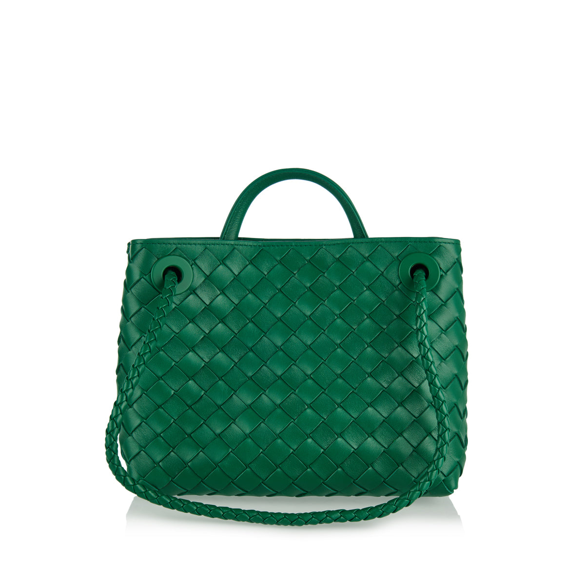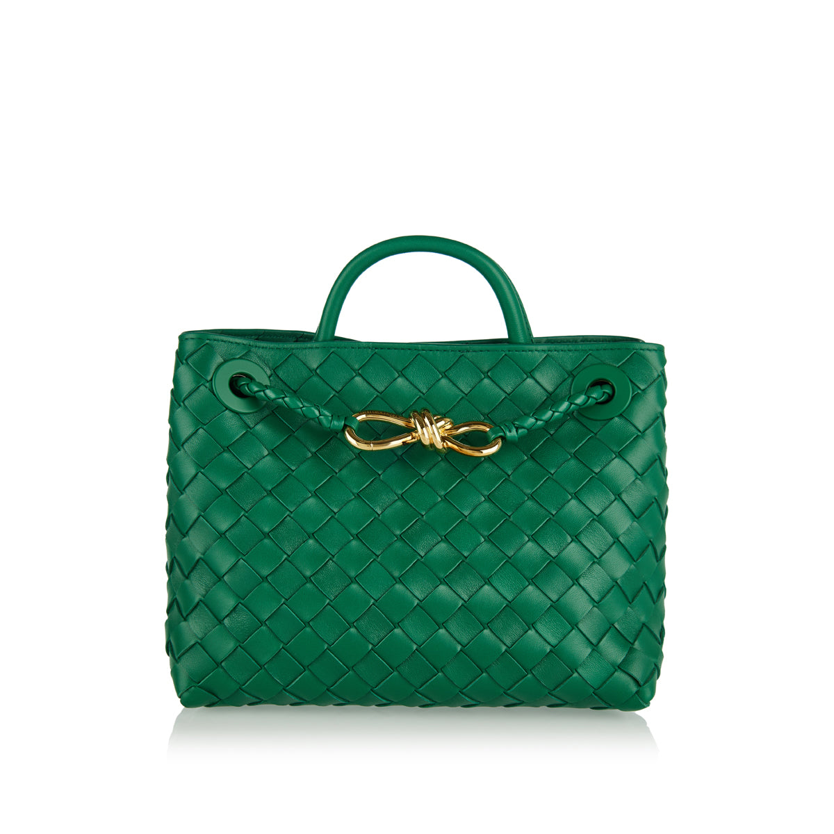 The Andiamo medium top-handle bag is crafted in supple Intrecciato nappa leather with sliding cross-body strap and signature knot detail in gold at the front. It features compartmented interior with one zip pocket, two open pockets and magnet closure.