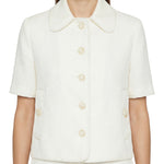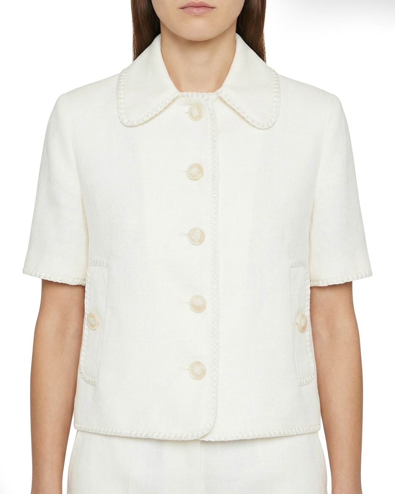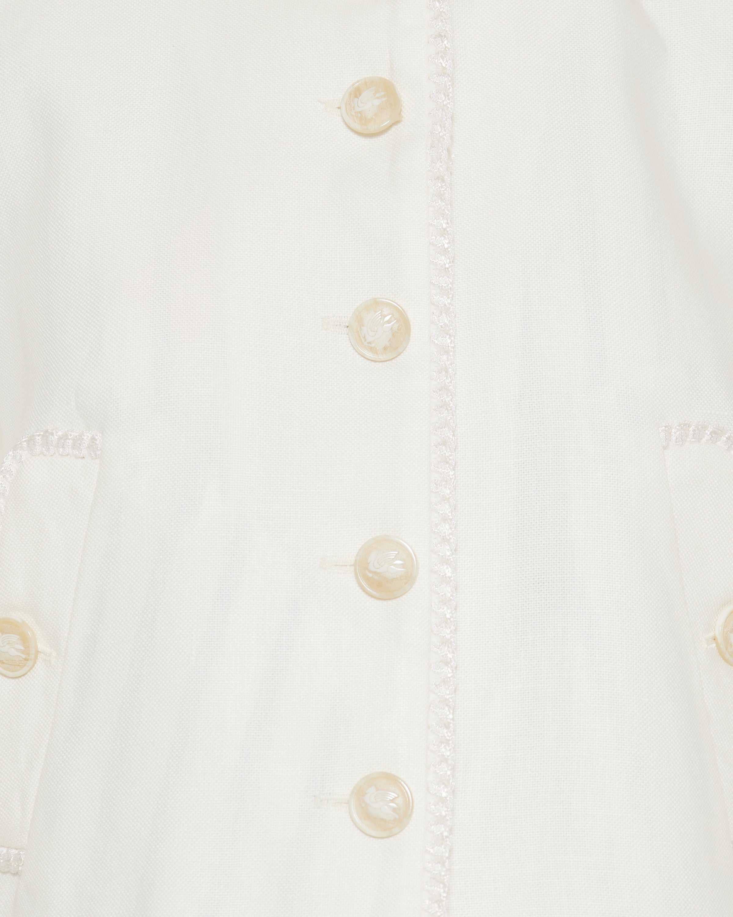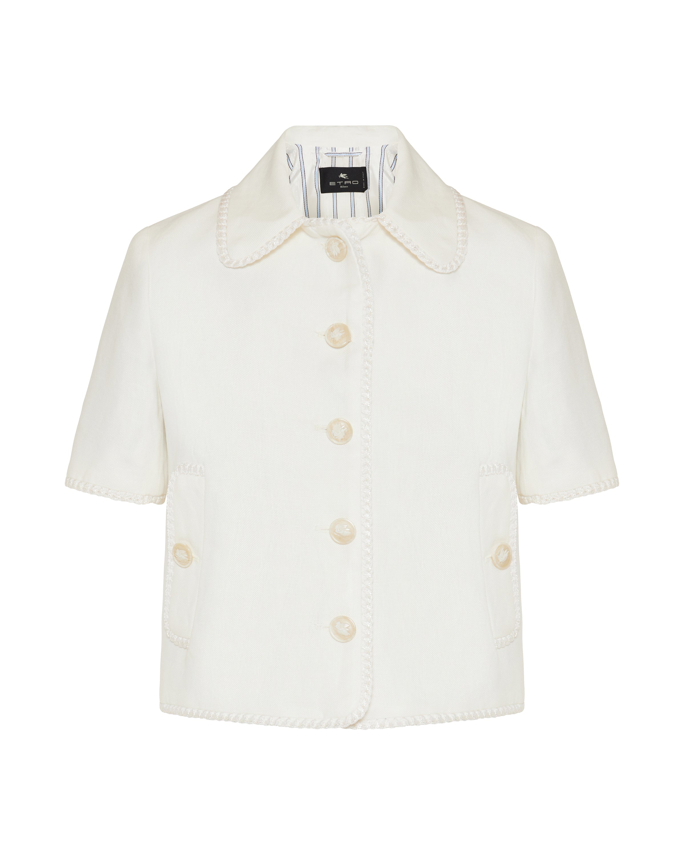 A refined white jacket in pure linen trimmed with a wool and mohair blend, showcasing Etro’s signature artisanal elegance and Italian craftsmanship. Featuring a tailored silhouette with buttoned front and pocket detailing, it offers elevated casual and refined daytime versatility with a sophisticated, contemporary edge.