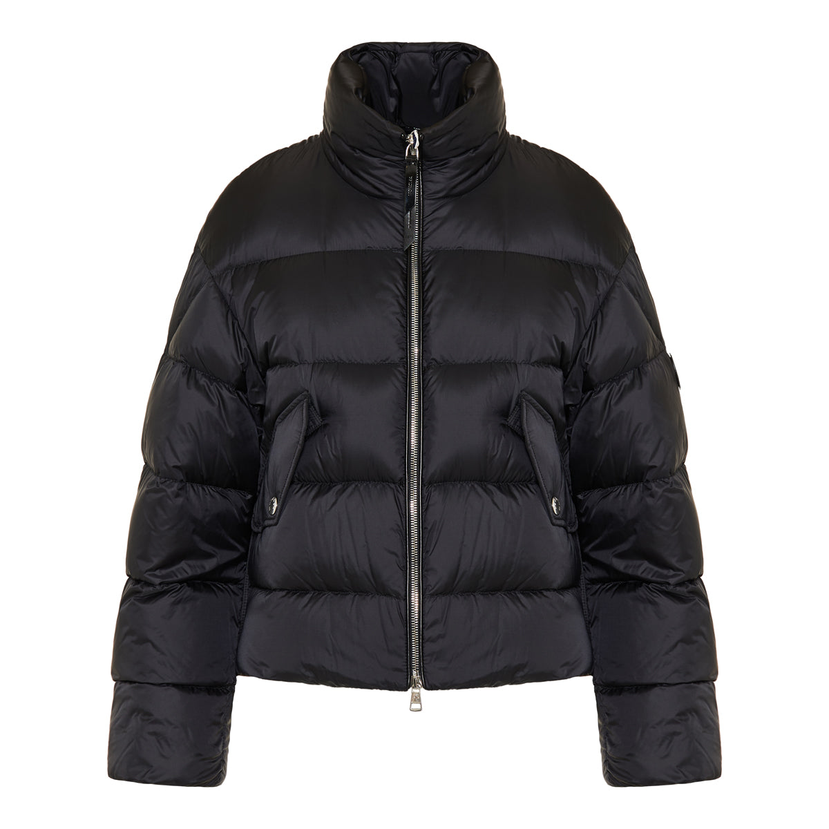 Part of the Moncler x Edward Enninful EE72 capsule, the Blas short jacket is crafted from technical polyamide with down and feather padding. Featuring a high collar, zip fastening, and a cropped cut, it combines protective warmth with a sleek modern silhouette.