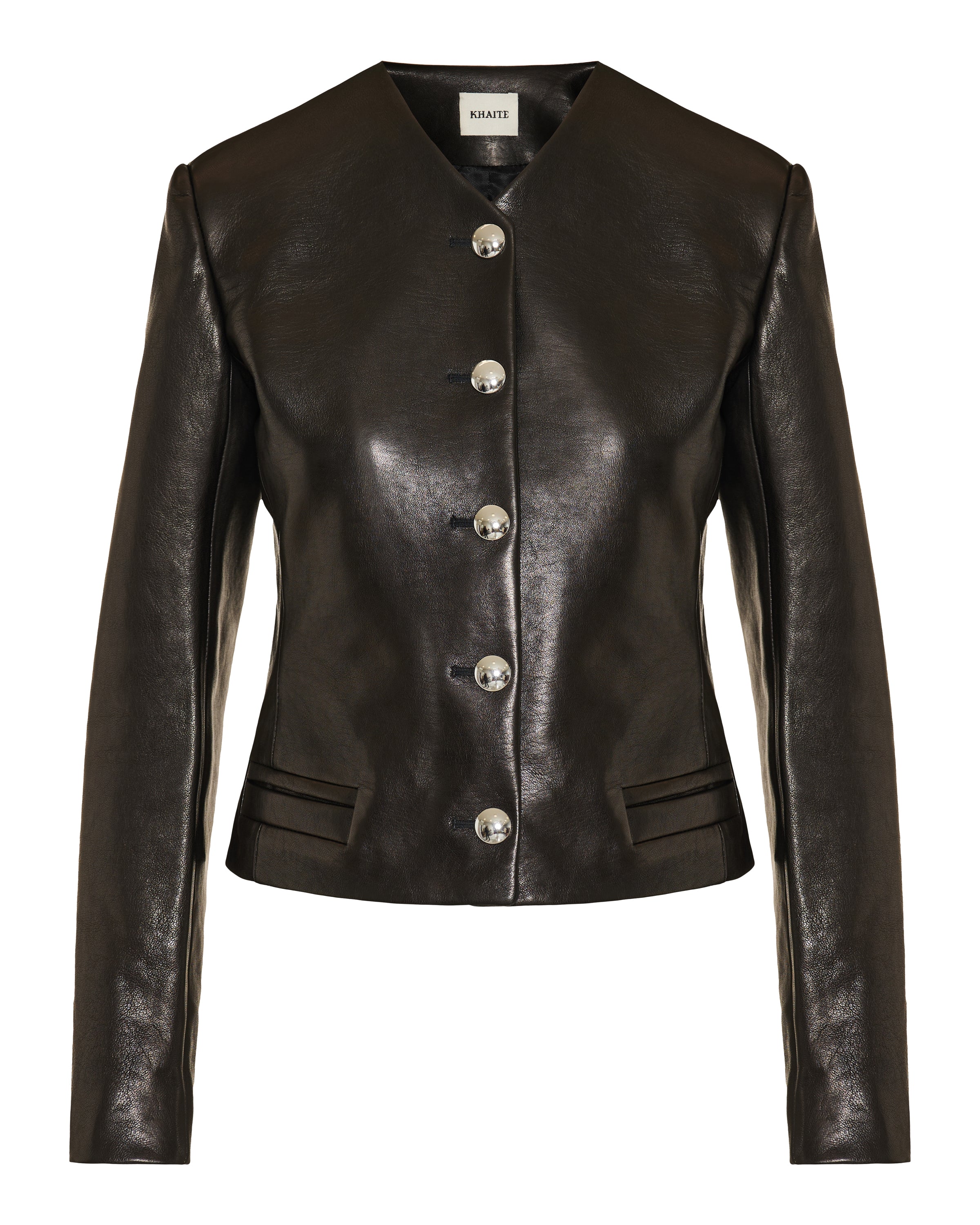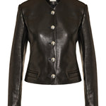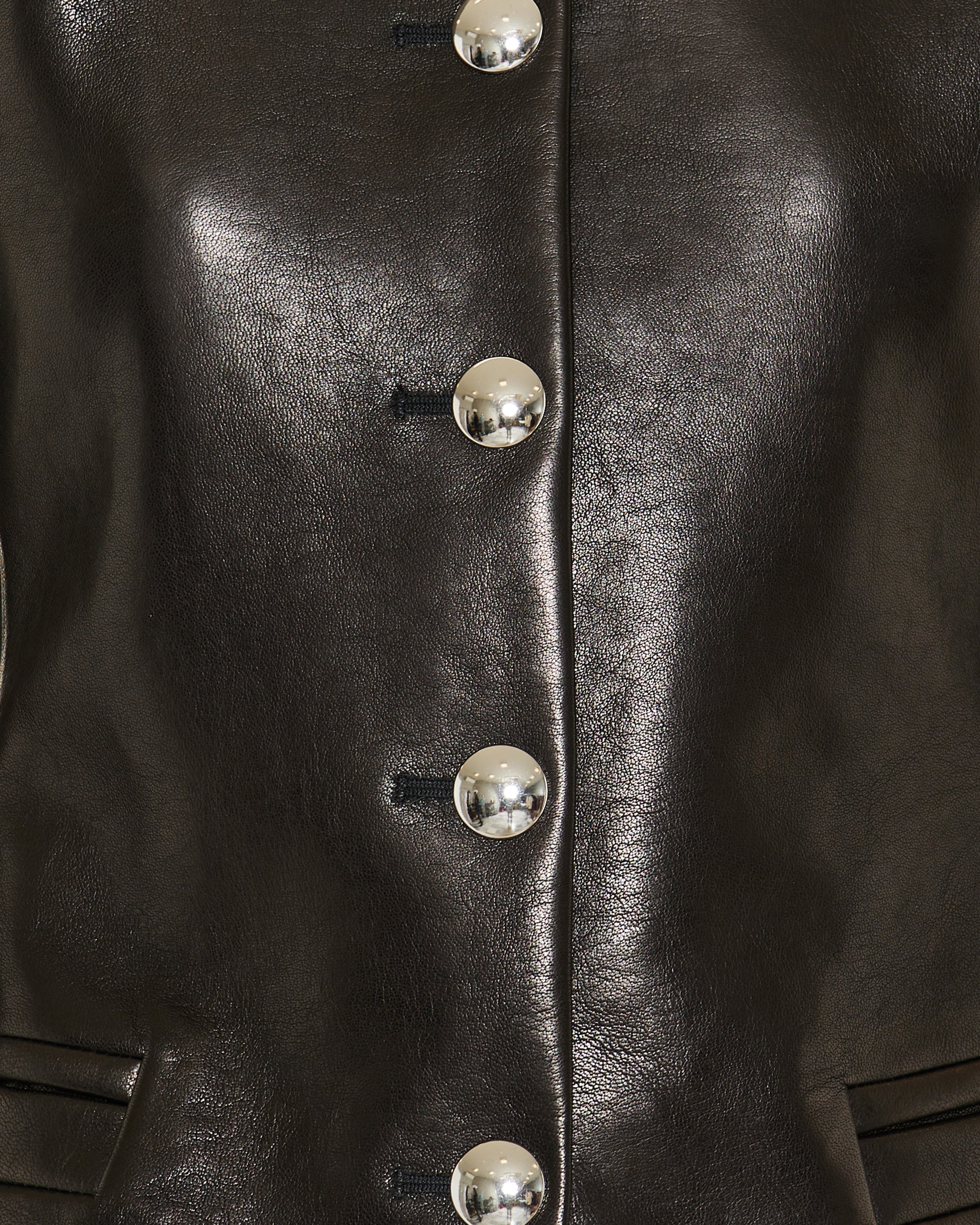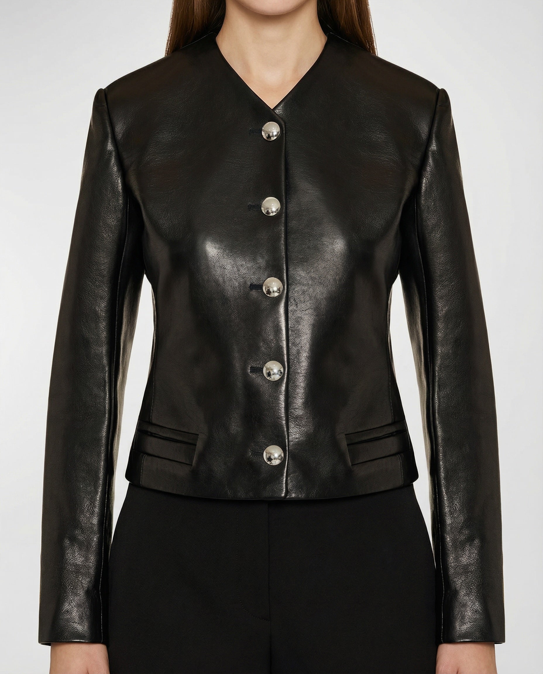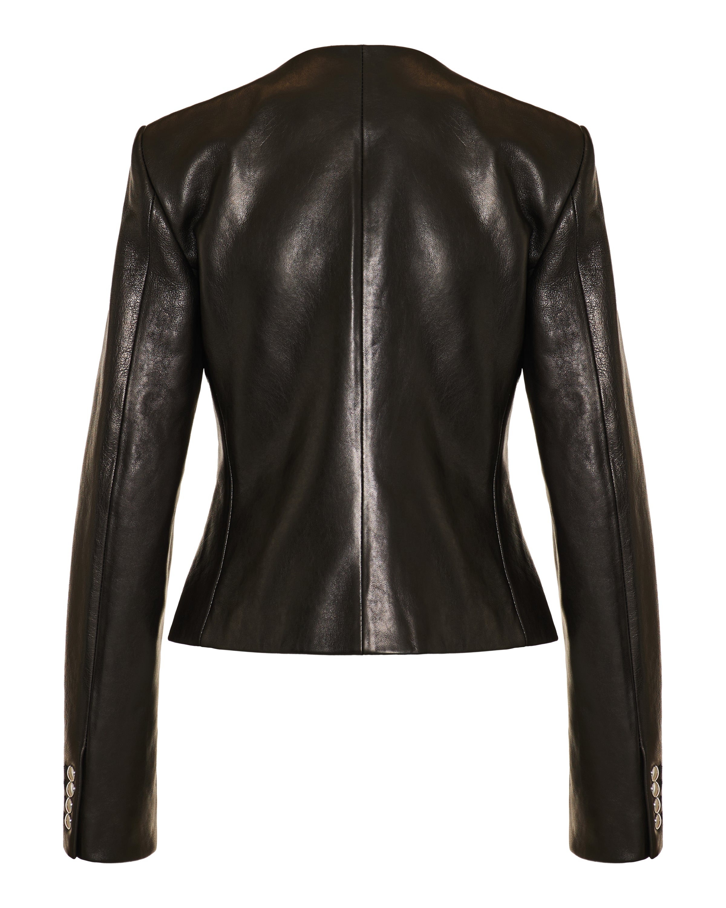 Sophisticated collarless leather jacket in supremely soft lambskin with structured padded shoulders and a sleek silhouette. Featuring a button-through front and full lining, this tailored piece is ideal for elevated everyday and evening wardrobes, adding a modern minimalist edge to refined ensembles.