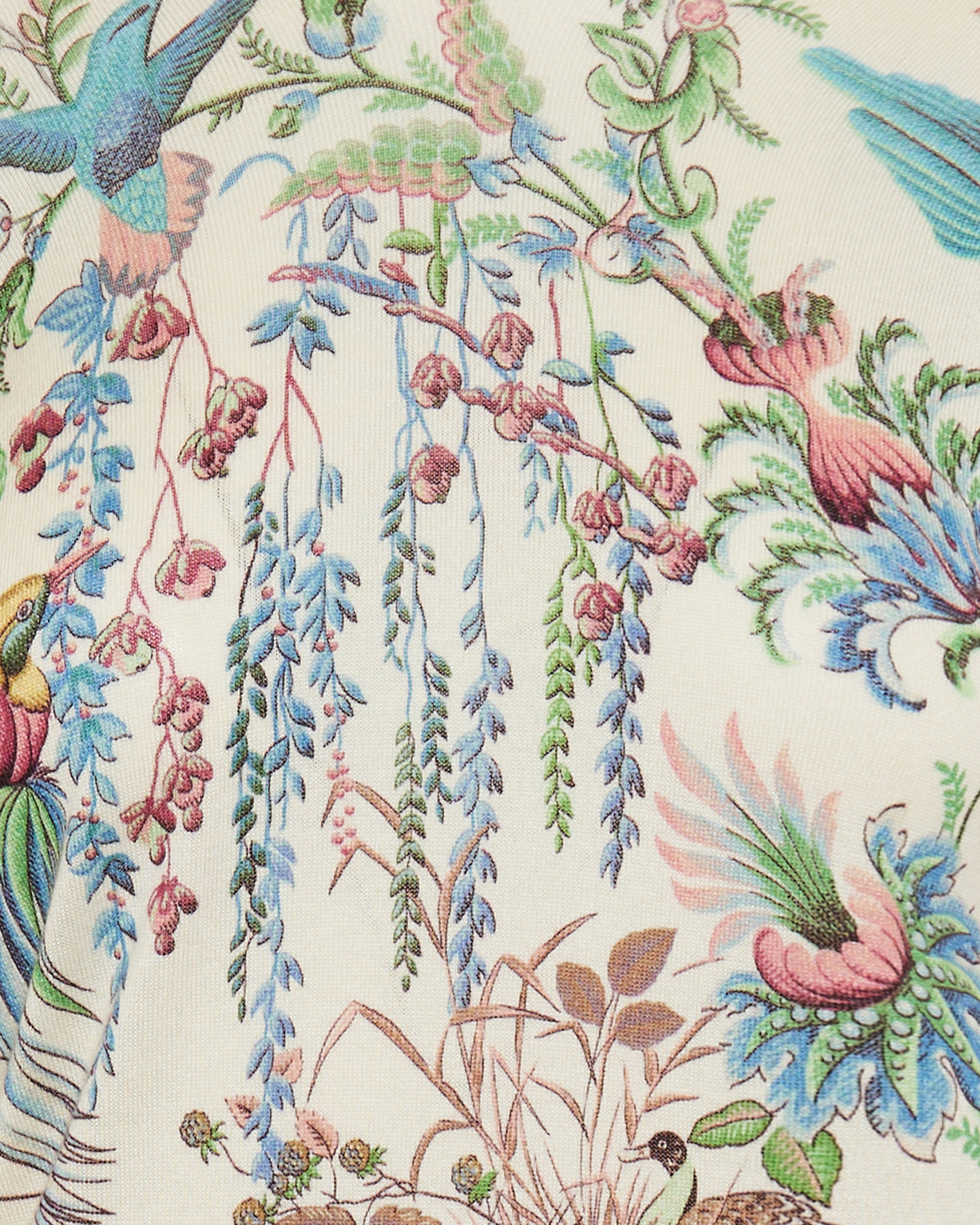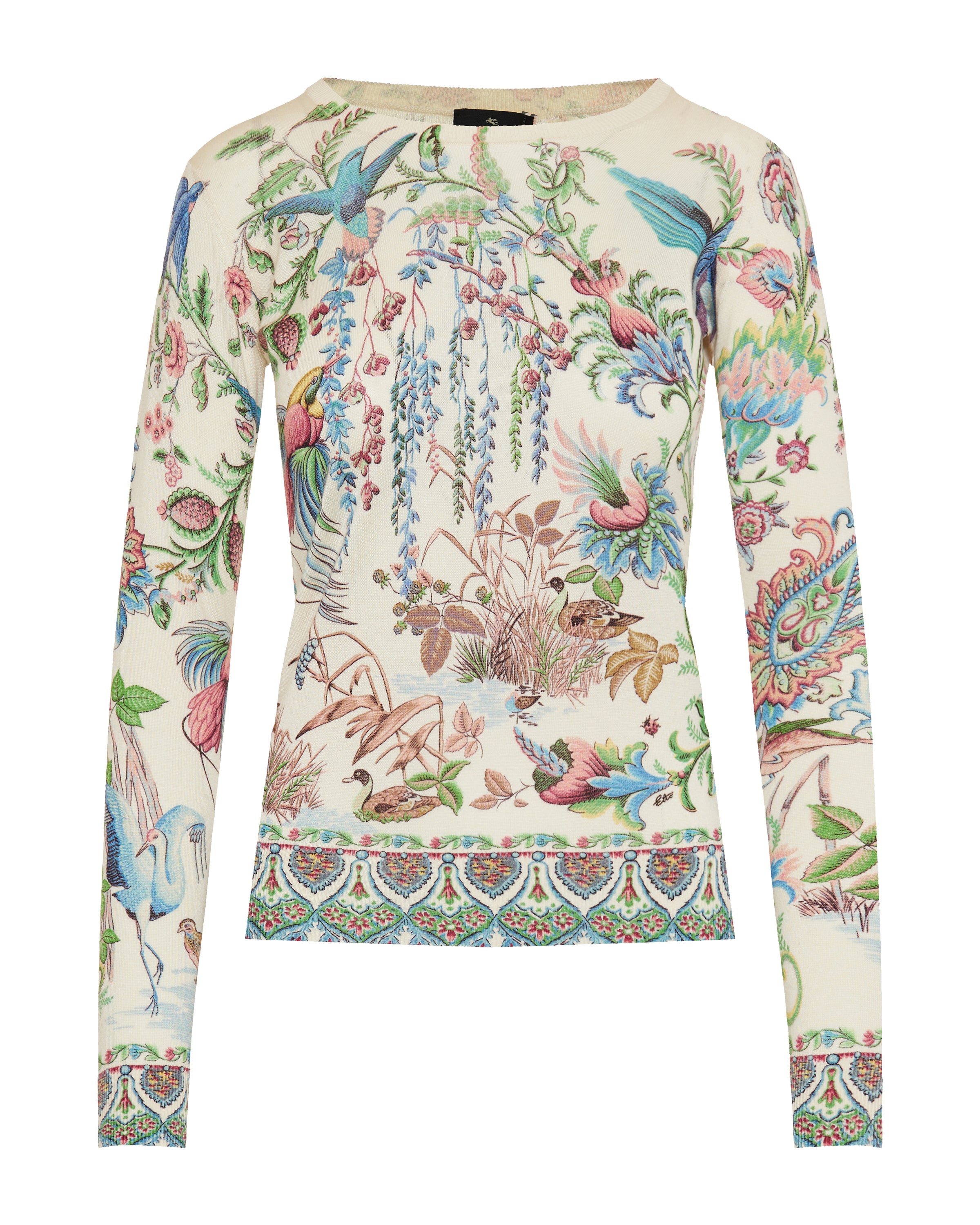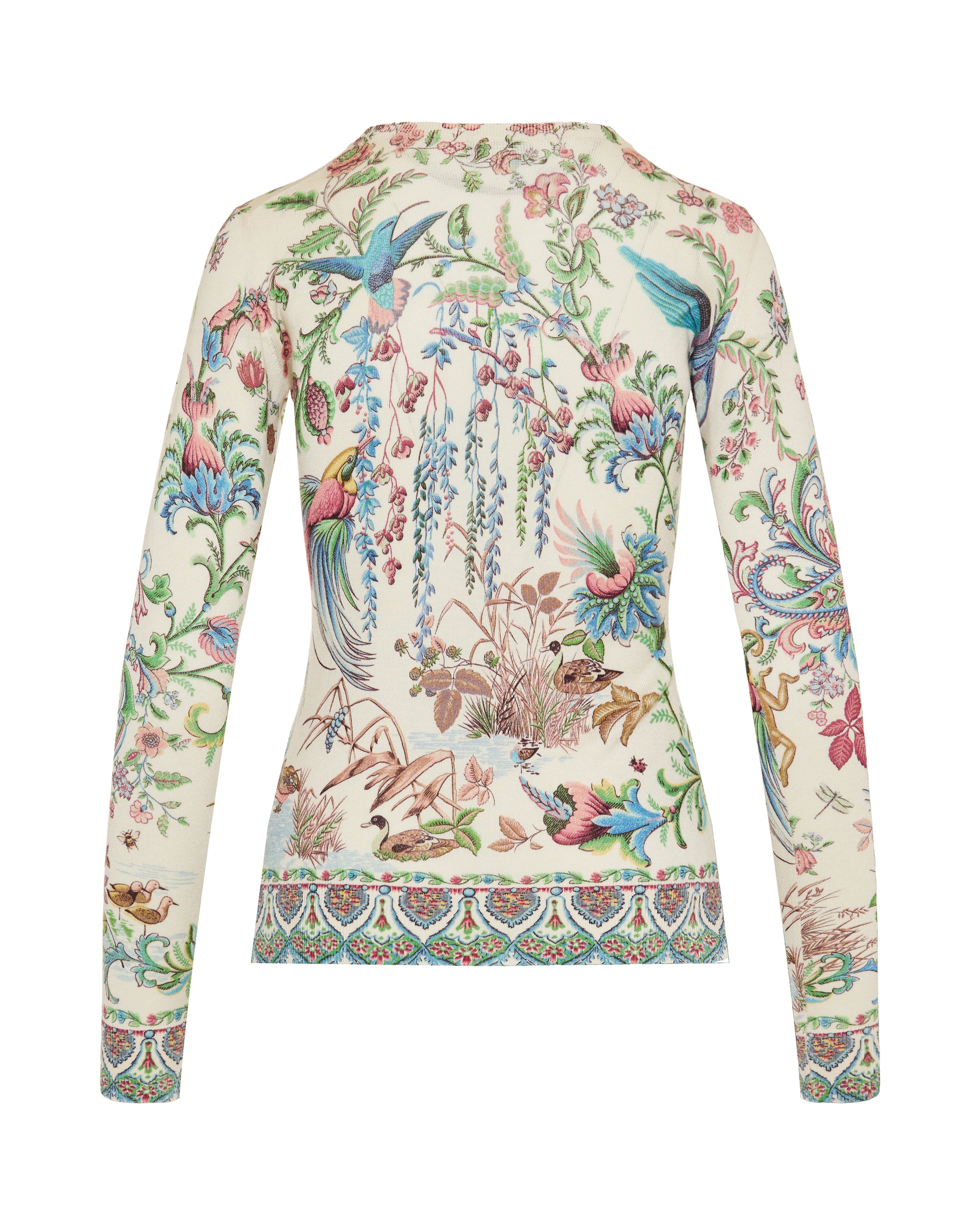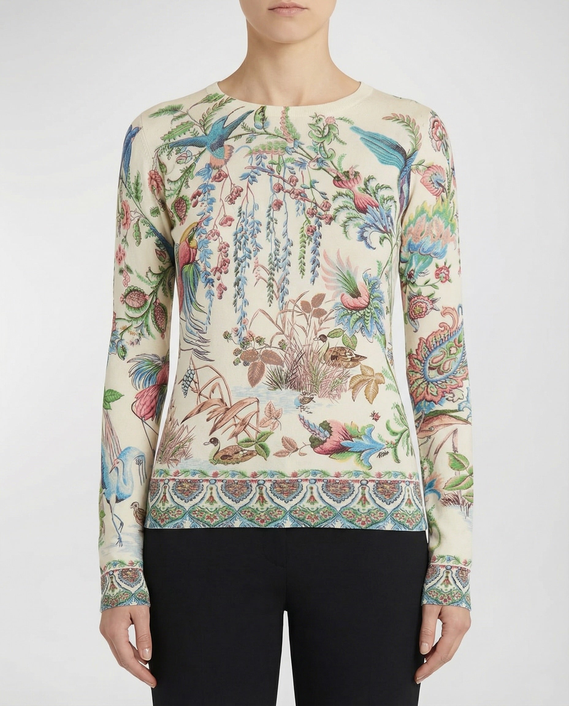 Luxurious crew‑neck sweater crafted in a rich silk and cashmere blend with an intricate flora and fauna‑inspired motif and ribbed trims at the neckline, cuffs and hem. With a regular fit and Italian craftsmanship, this refined knit adds artistic elegance to elevated casual and smart‑casual wardrobes.