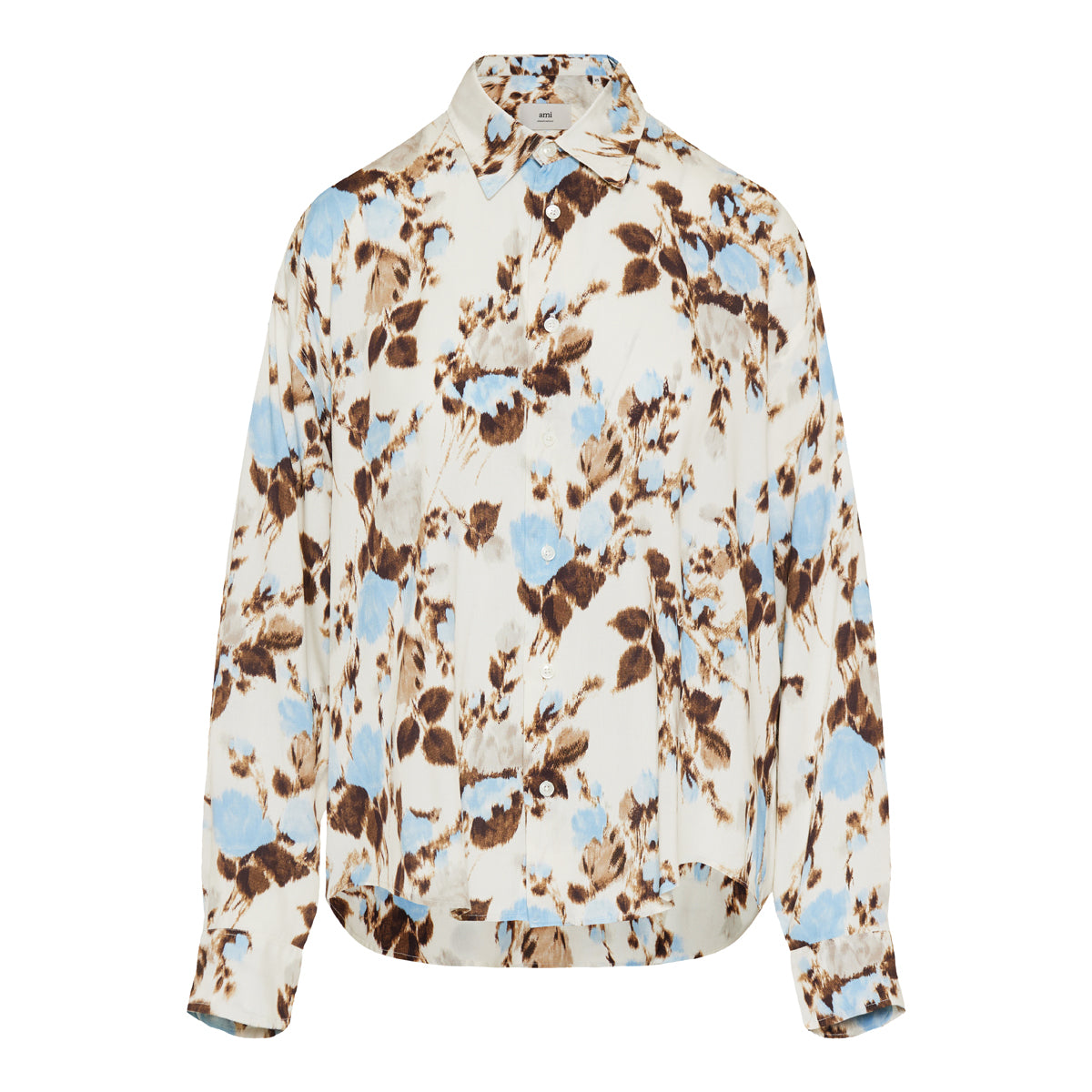 Crafted from a supple cotton blend with a relaxed boxy silhouette, this shirt is adorned with a delicate floral print. A classic collar, tonal button placket, and mother-of-pearl buttons refine the design, while subtle AMI Paris embroidery at the hem underscores its understated sophistication.