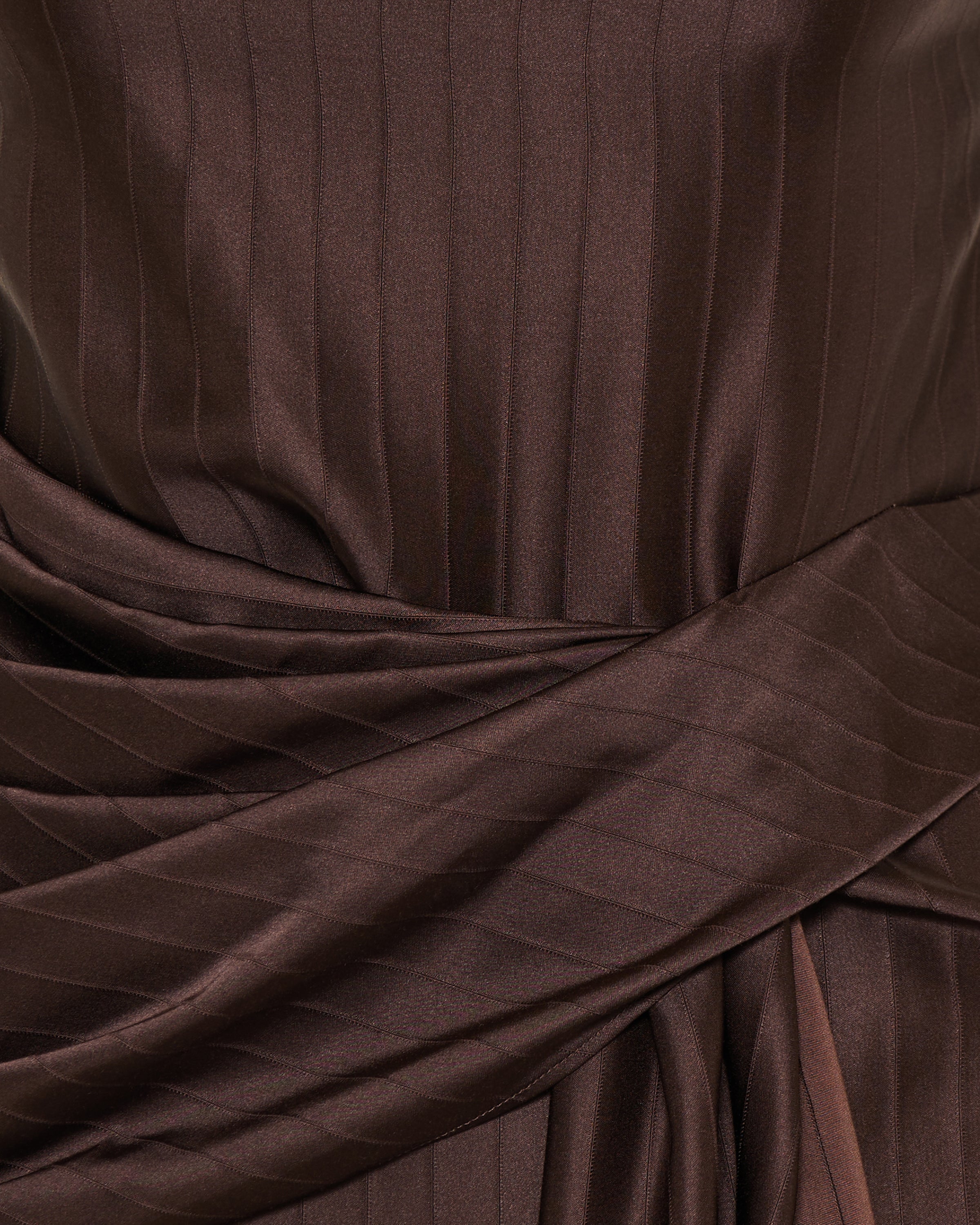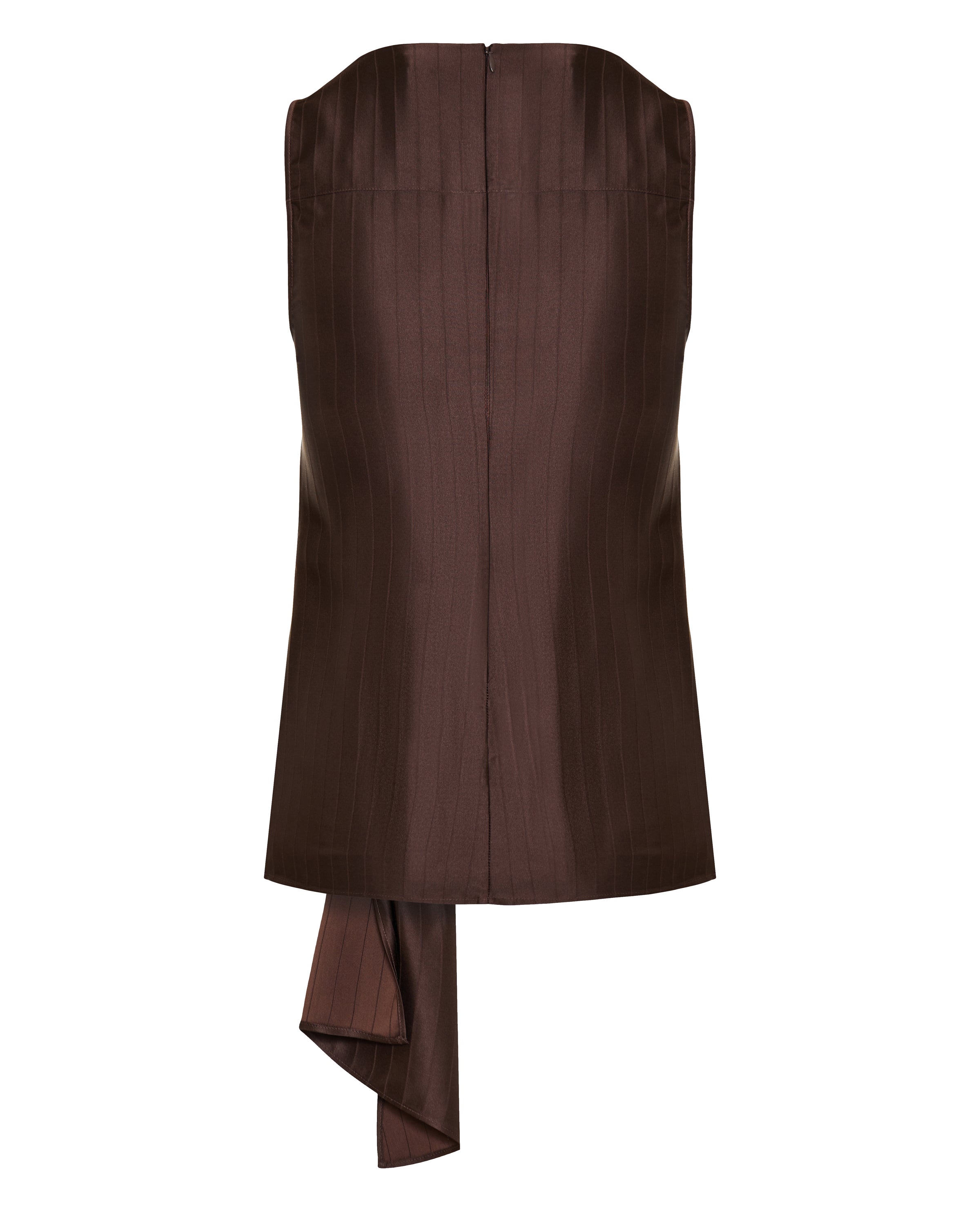 A refined draped top in dark brown, offering effortless elegance with a relaxed, flowing silhouette. Designed for elevated casual and smart daytime wear, the piece combines modern minimalism with luxurious detailing. Its versatile cut allows for sophisticated layering or standalone styling in contemporary wardrobes.