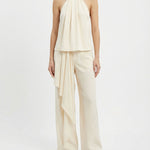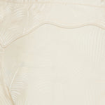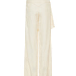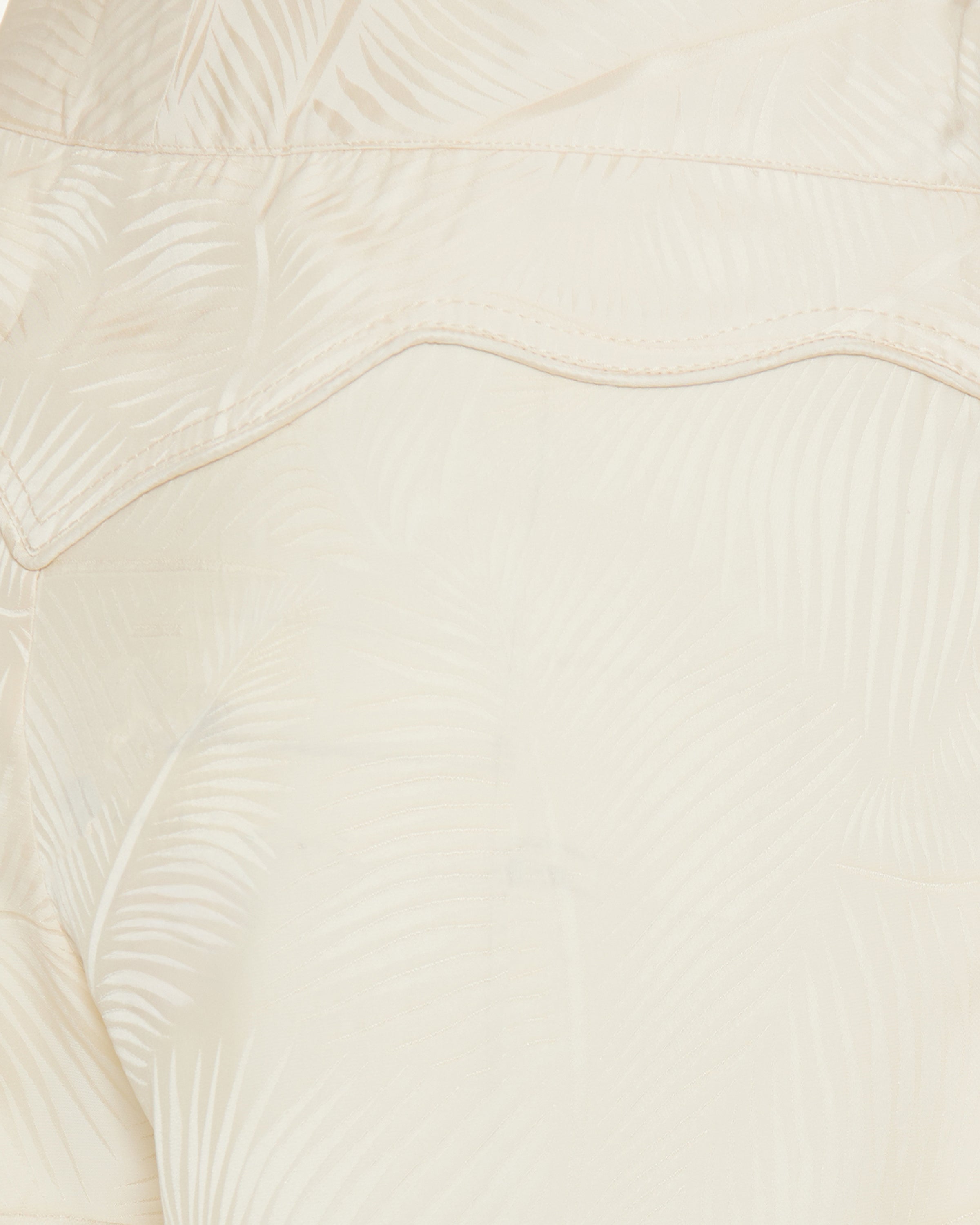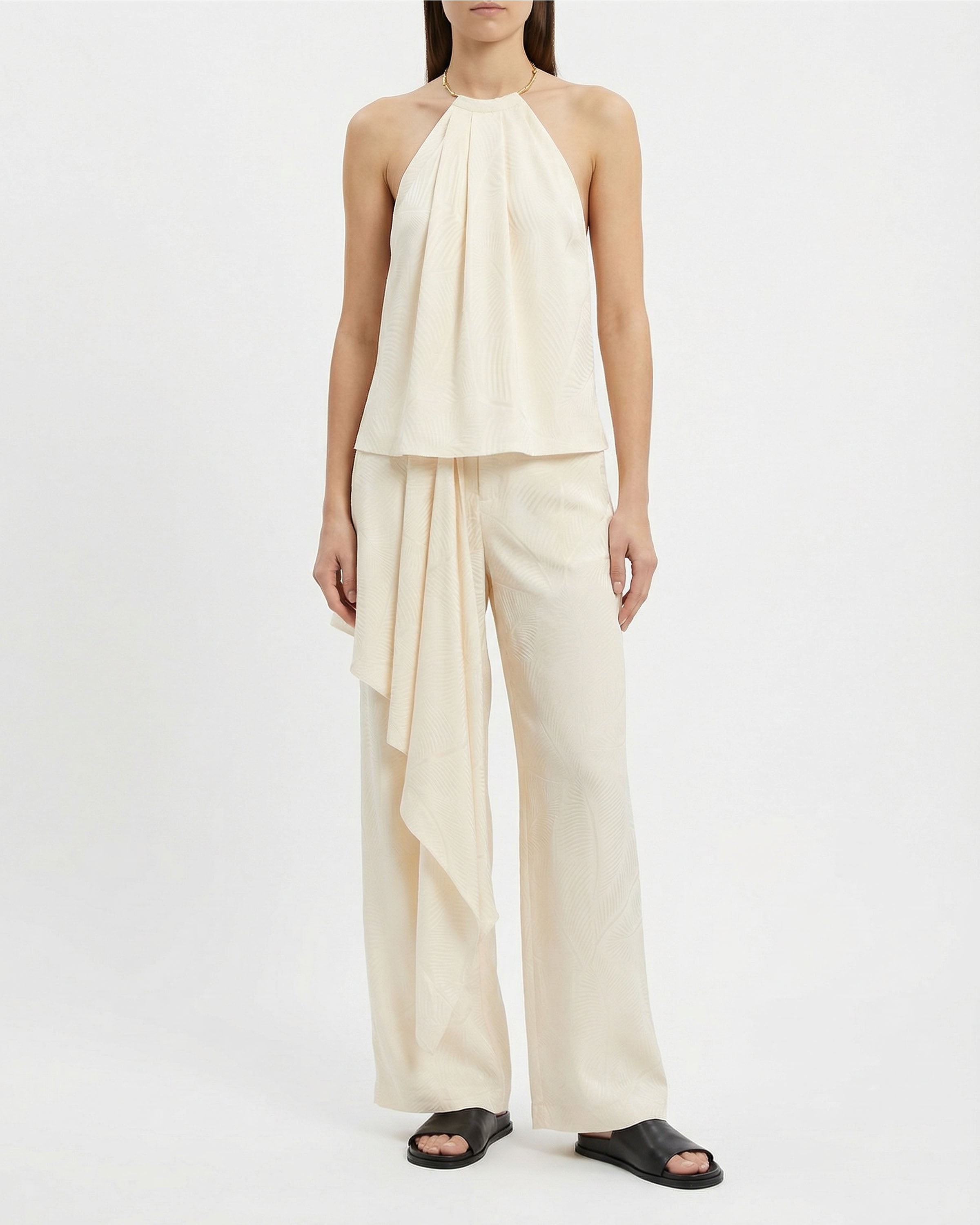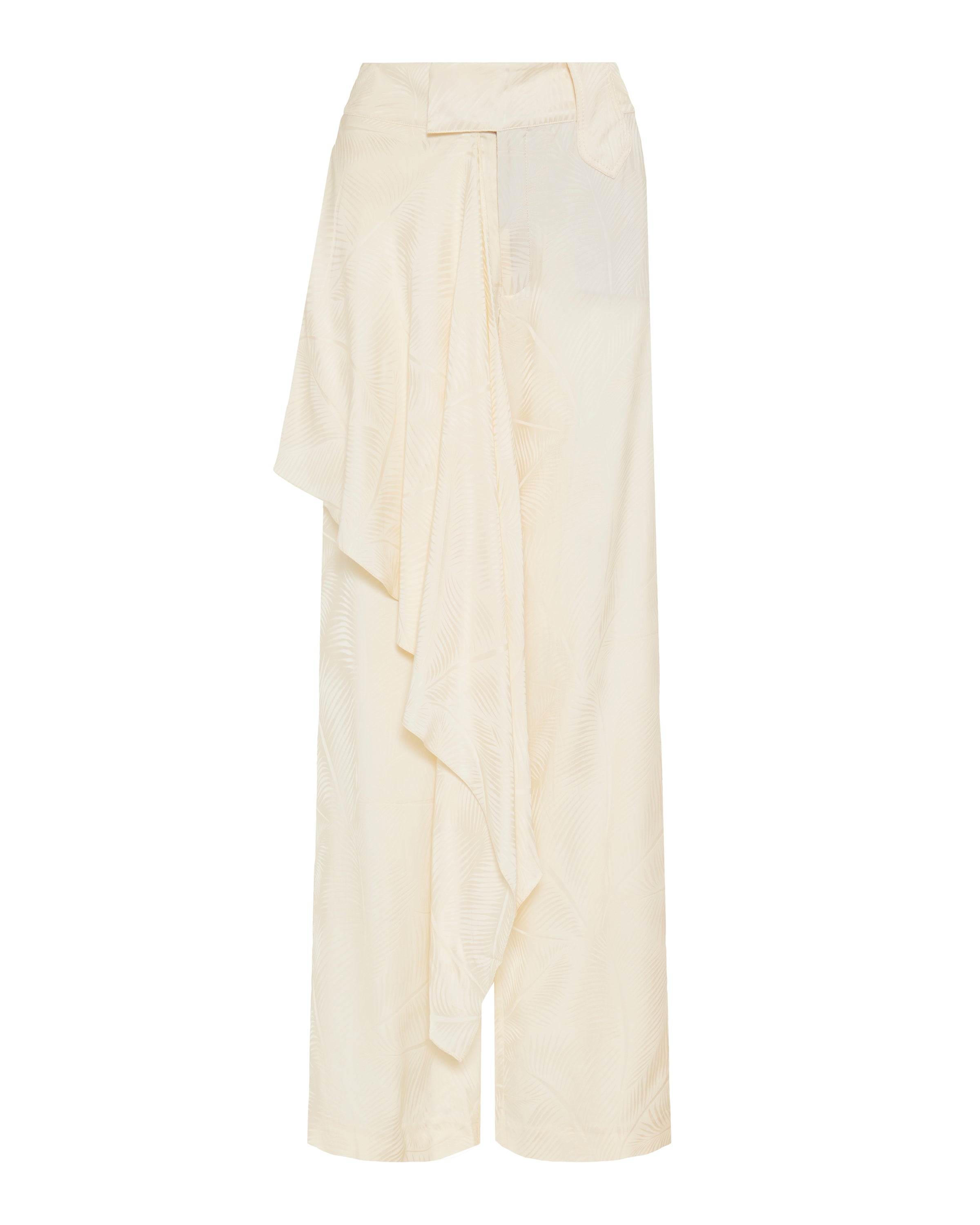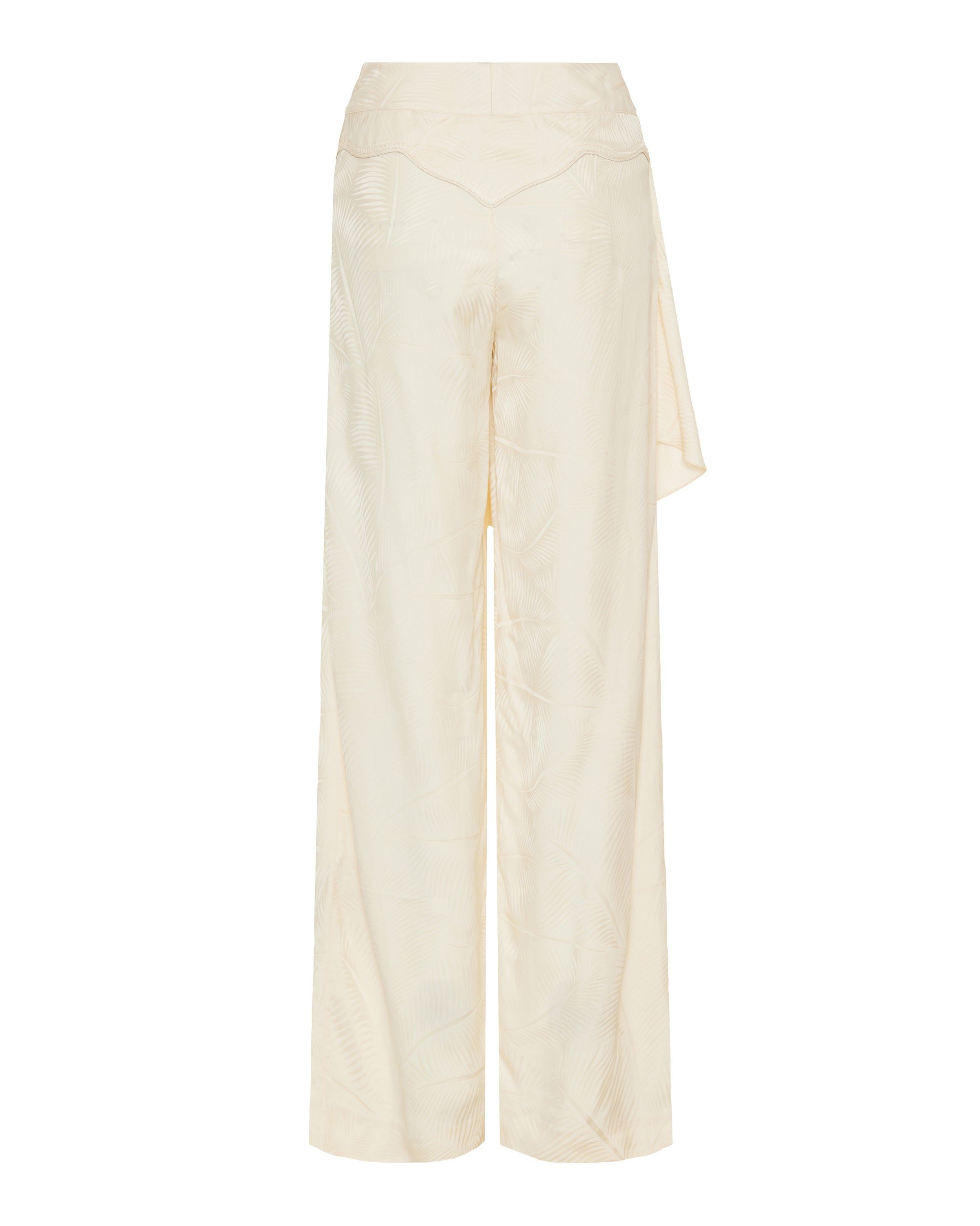Effortlessly elegant straight‑leg trousers in ecru satin‑jacquard woven with subtle palm motifs, featuring an elegantly draped waist that frames the silhouette. With a mid‑rise cut and fluid movement, this Italian‑crafted piece brings island‑inspired ease and refined tailoring to elevated casual and contemporary wardrobes.