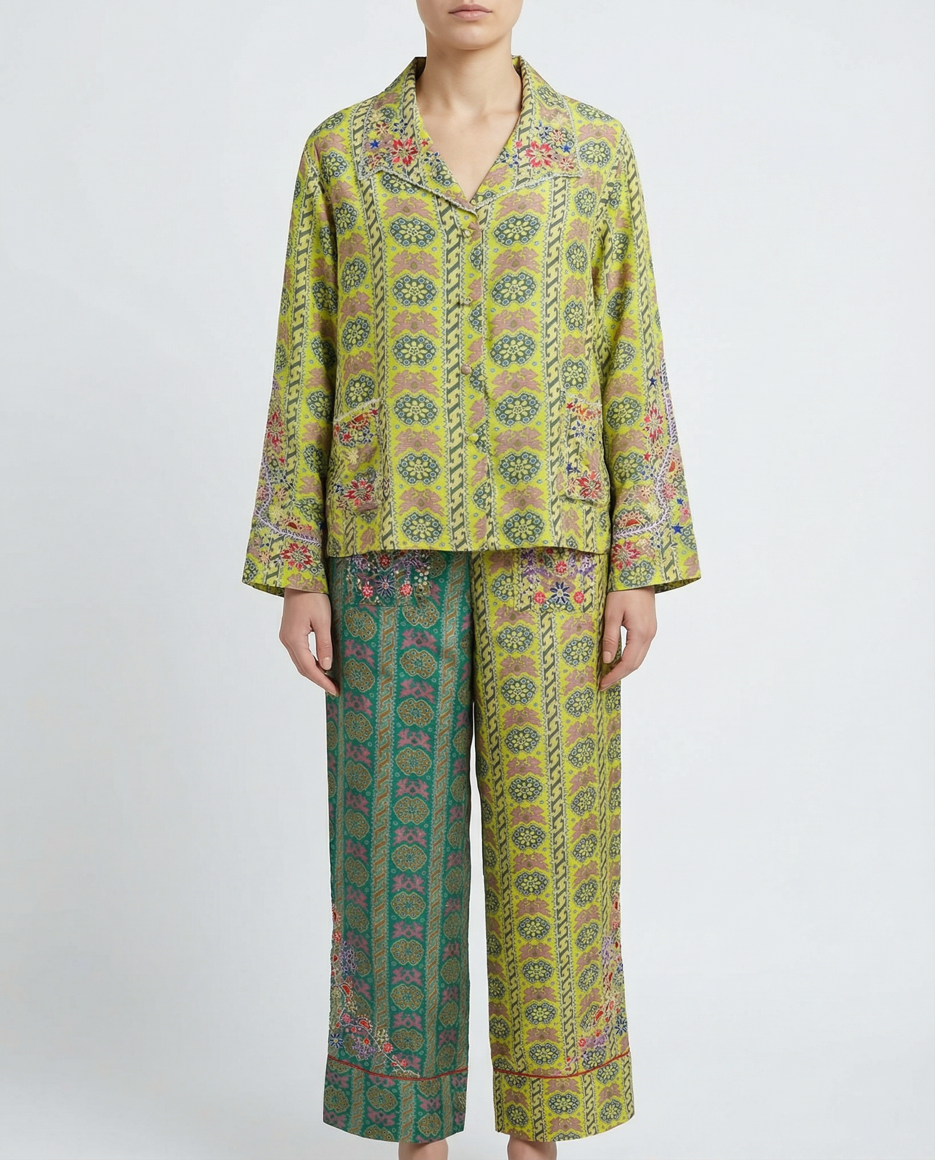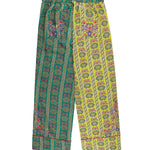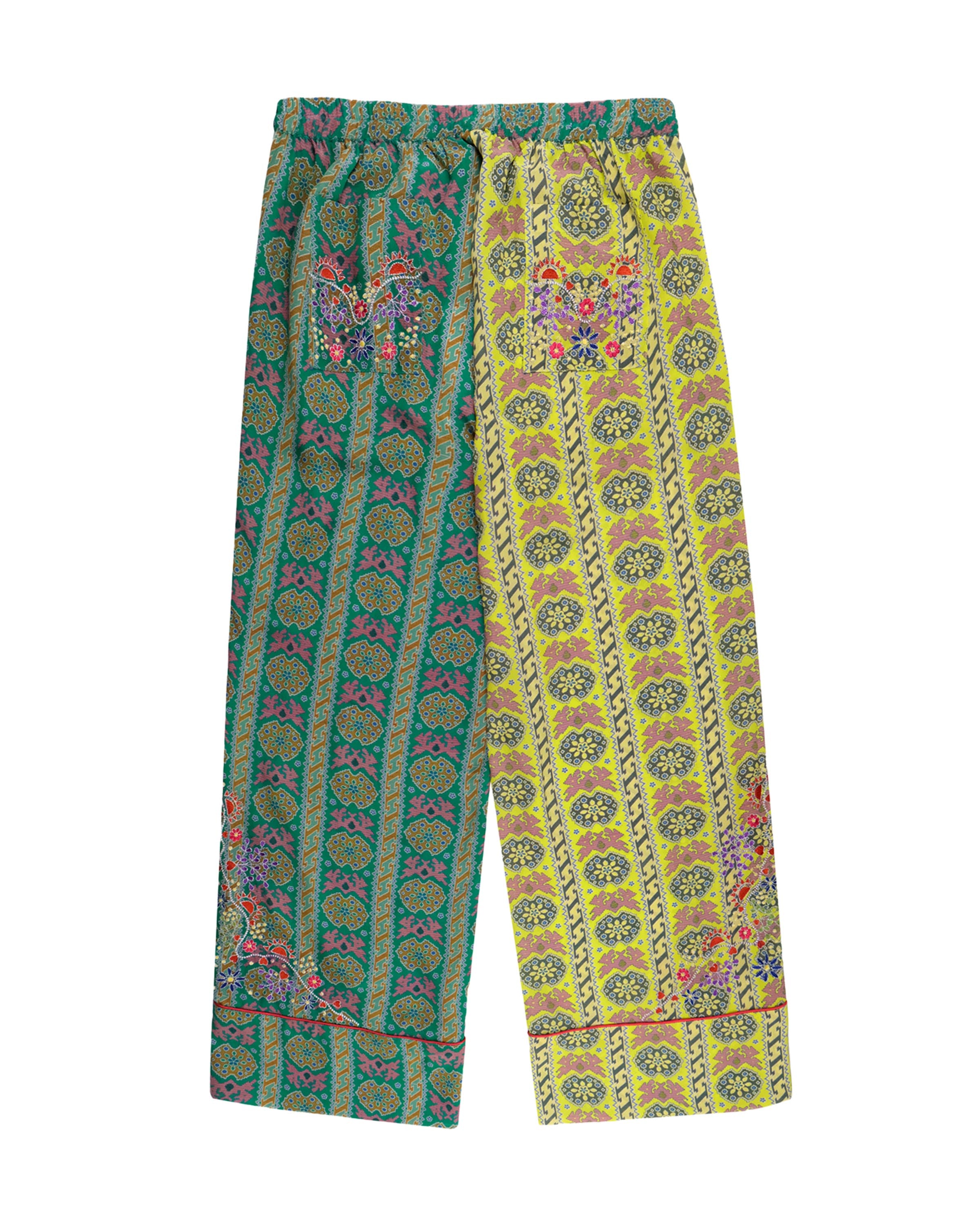 Lightweight silk trousers with a relaxed, straight-leg fit. Designed with a vibrant patchwork of contrasting prints, delicate embroidery, and an elasticated waistband with tasseled drawstring. Easy, fluid, and effortlessly statement-making.