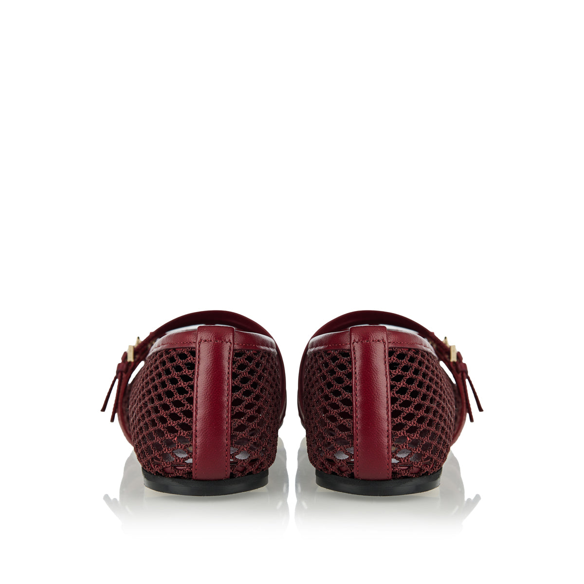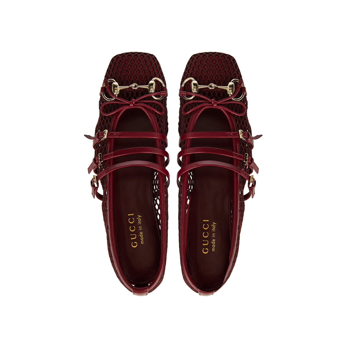 The Gucci Horsebit Ballerina Flats in Rosso Ancora mesh combine classic ballet silhouette with luxury detailing. Featuring a squared toe, delicate bow, and iconic light gold-tone horsebit hardware, they are crafted with a “sacchetto” construction and padded leather insole for comfort and elegance. Ideal for both casual and refined looks.