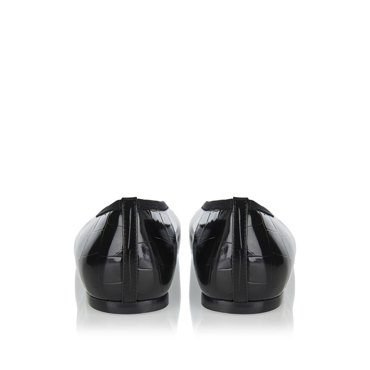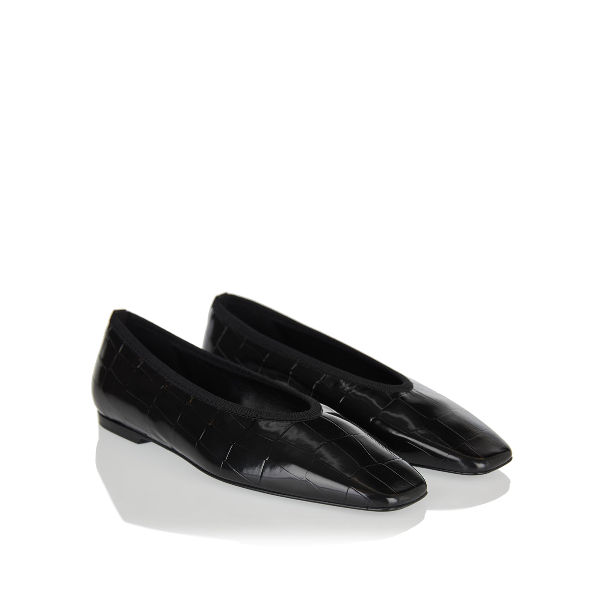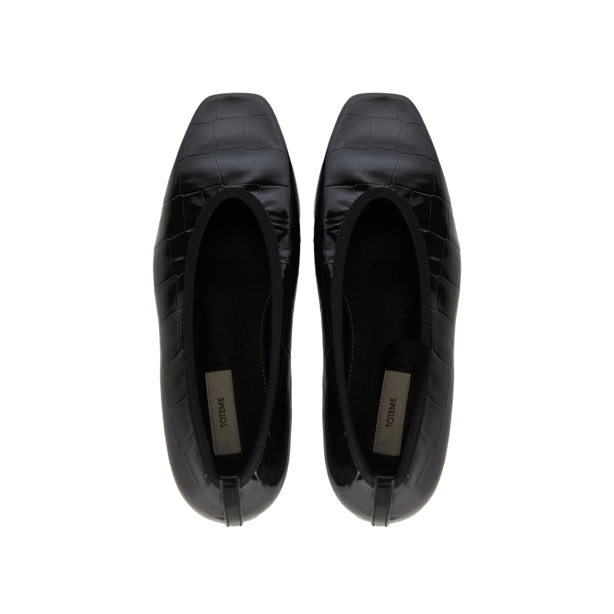 Toteme’s minimalist ballerinas are reimagined in croco-embossed black leather, bringing subtle texture to a timeless silhouette. Featuring a rounded toe and sleek profile, they embody the brand’s signature Scandinavian refinement. A versatile pair that transitions effortlessly from casual daywear to evening elegance.