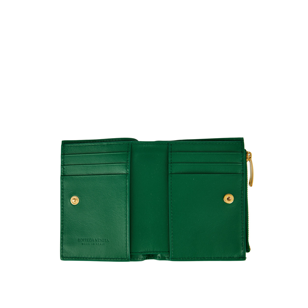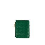 This compact bi-fold wallet from Bottega Veneta is crafted in Intrecciato nappa leather in the elegant Jungle shade. Designed for daily refinement, it includes six card slots, a note compartment, and a zipped coin pocket, all secured with a press-stud closure. A polished and functional essential for any luxury accessories collection.