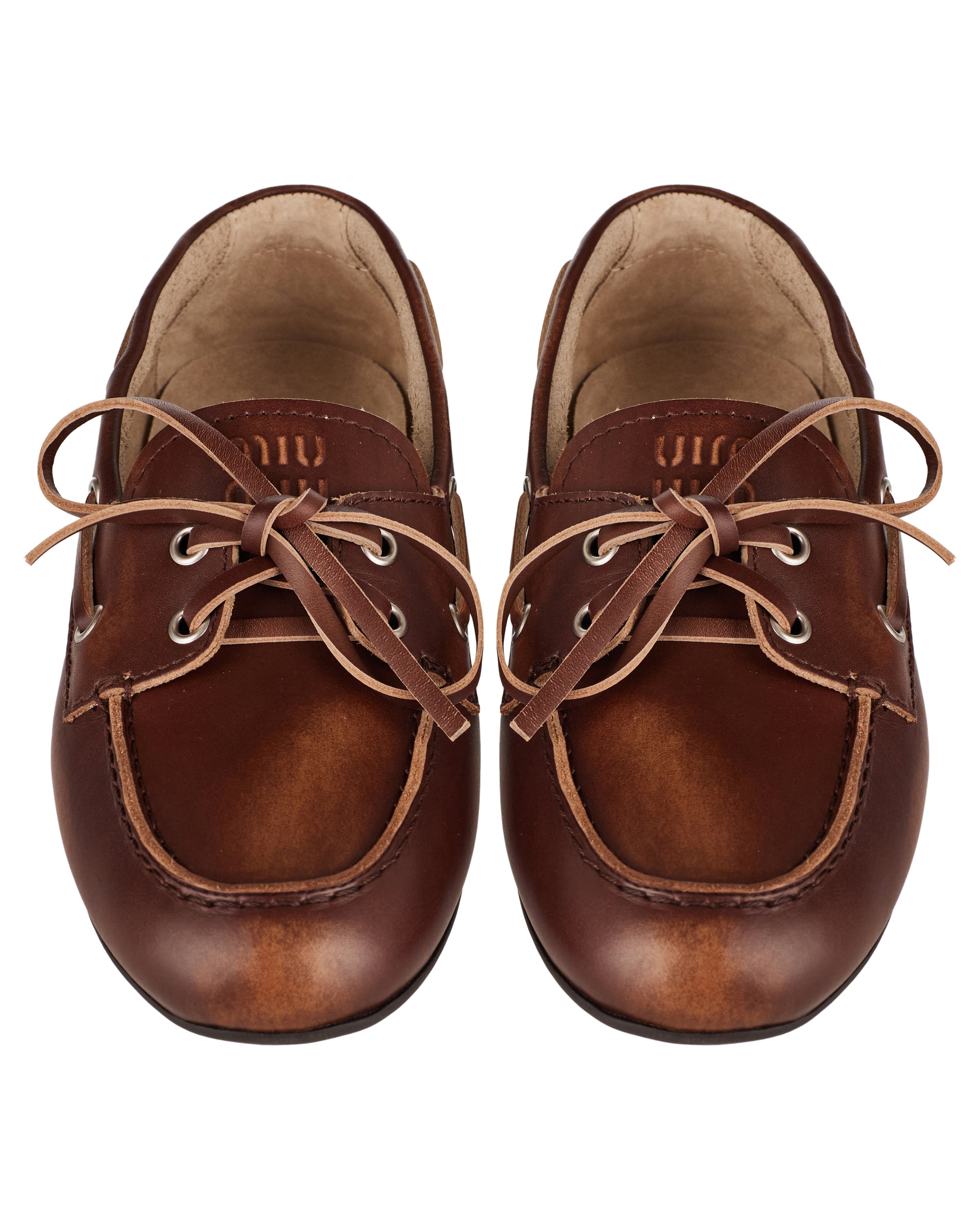 Refined Miu Miu leather lace‑up moccasins crafted in Italy with a classic round moc toe and sleek silhouette. The lace‑up vamp and slip‑on design balance traditional moccasin styling with modern ease, while the leather lining and rubber outsole ensure comfort and durability. A versatile choice for polished everyday wear or elevated casual looks.